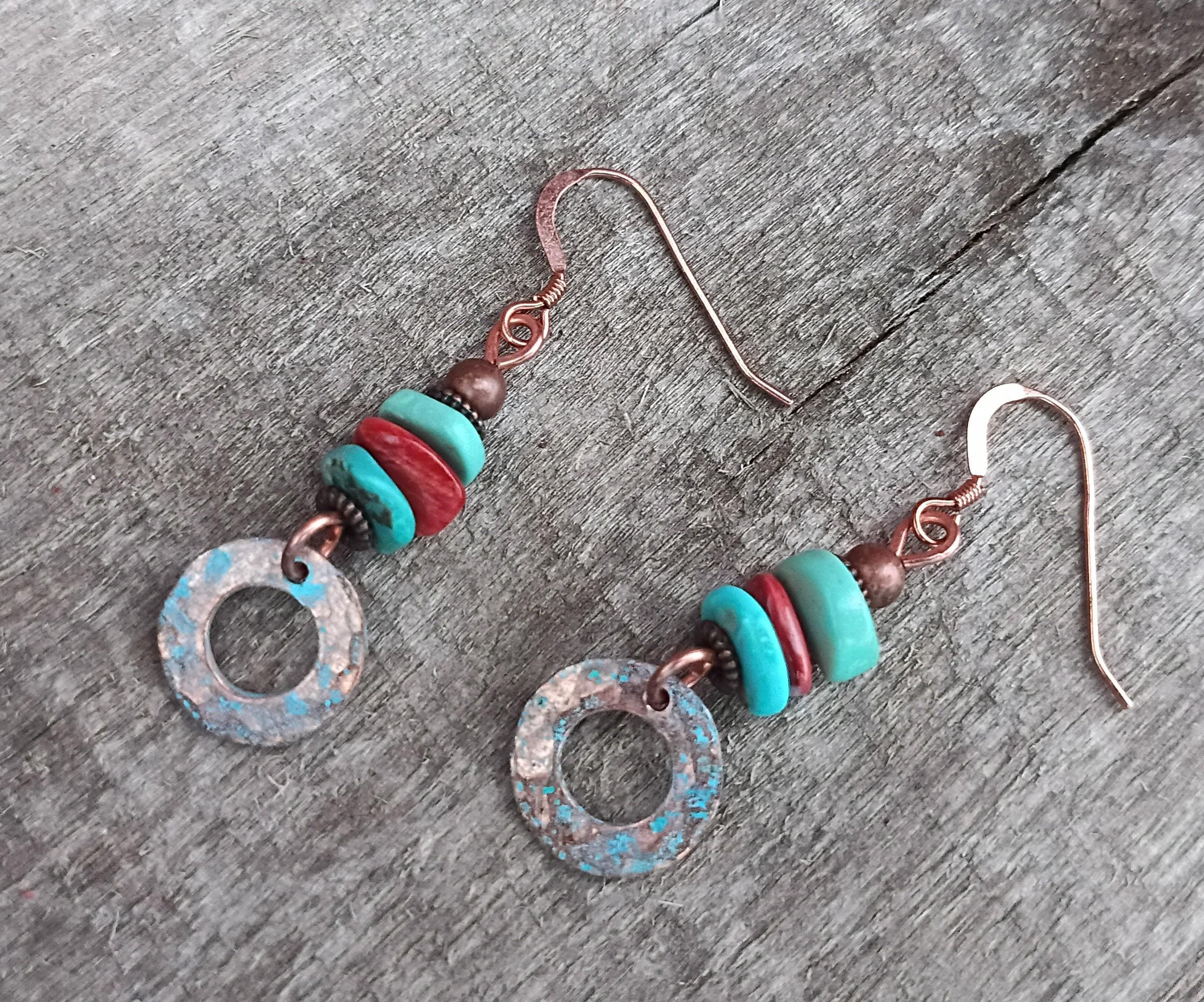 Rustic Bohemian style earrings made with copper hammered circle rings that have a light blue patina (clear coated for protection) Beaded with Kingman Turquoise and Spiny Oyster beads. Beaded on copper wire with copper ear wires. Approx 2 inches in length. Light weight! Circle rings are about the size of a dime. Southwest & Boho feel.