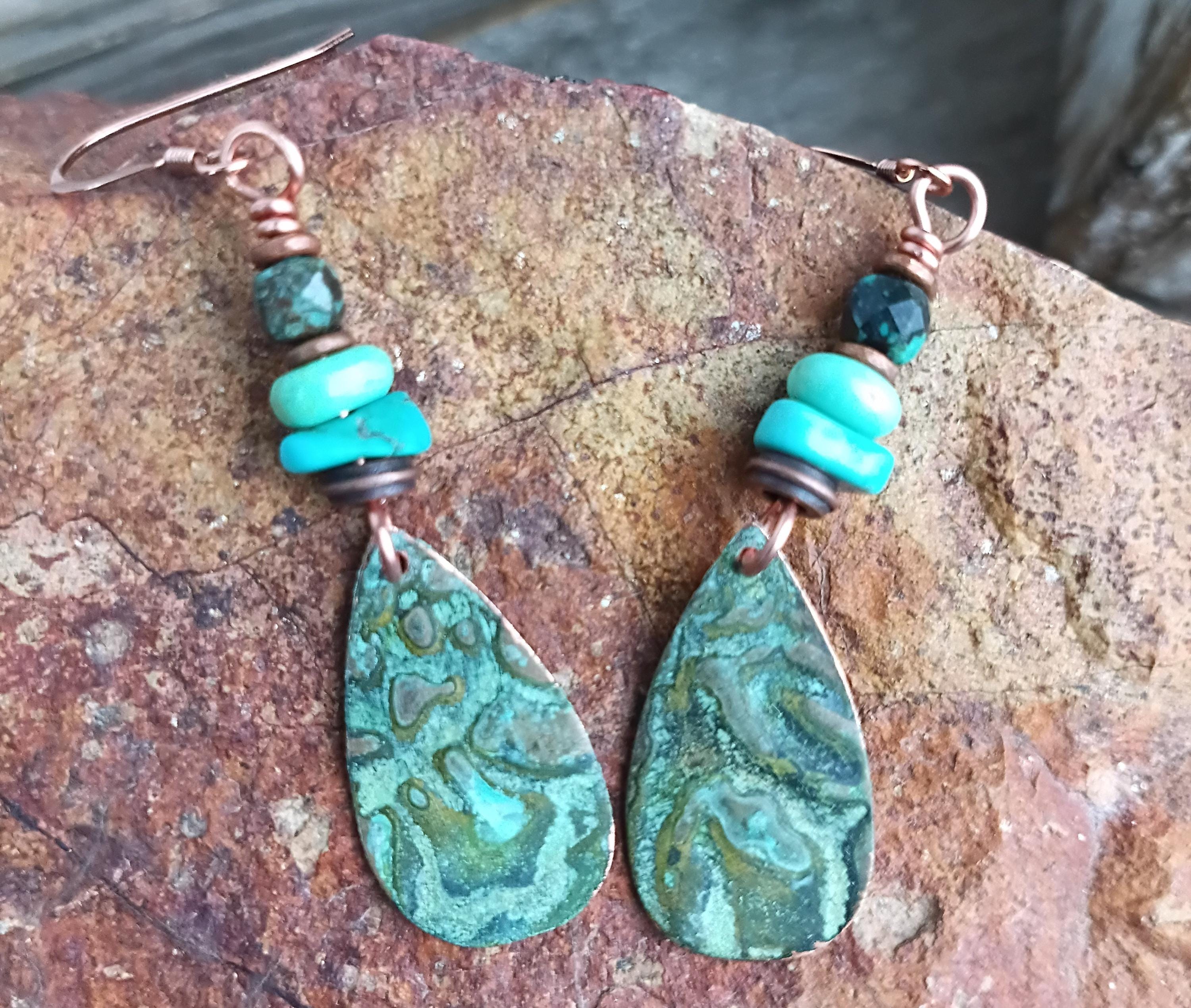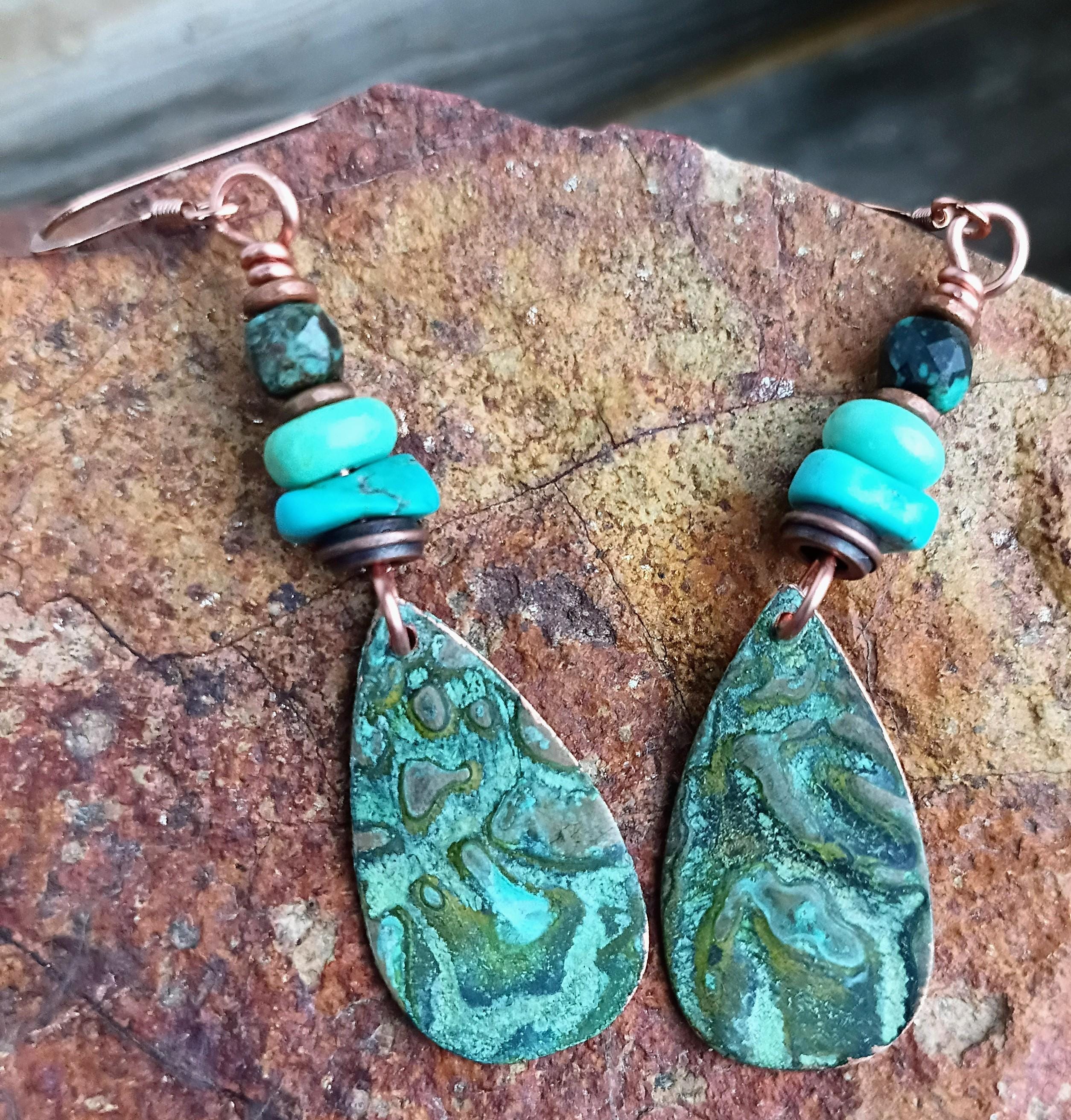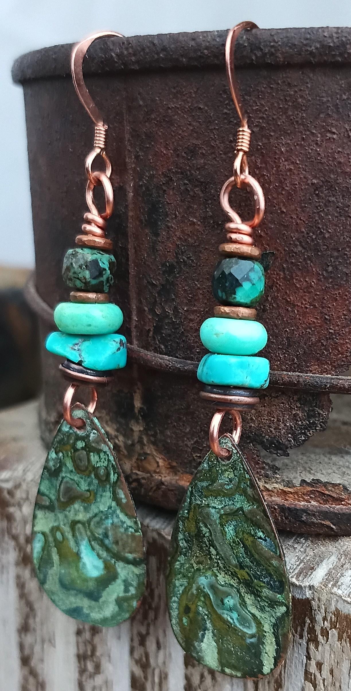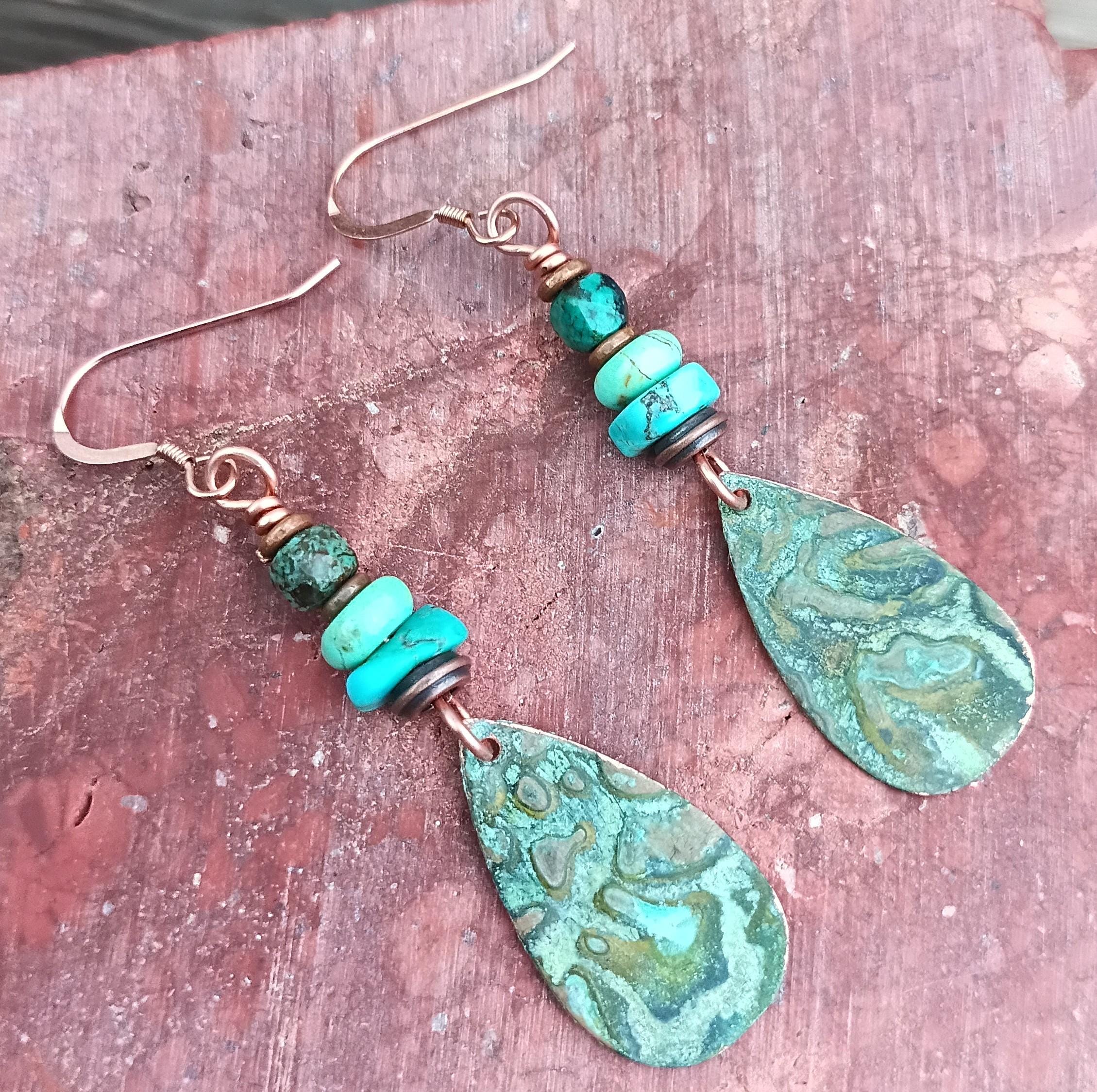 Copper teardrops are patina green and blue with a raised wavy pattern. Clear coated for protection and are 1 inch in length. Total length of the complete earring just over 2 inches. Beaded with Kingman Turquoise saucer/circle beads that are irregular shape and widths. (6/7mm in size ) Topped with a square /cube turquoise bead at the top, copper spacers all on copper wire with copper ear wires.
