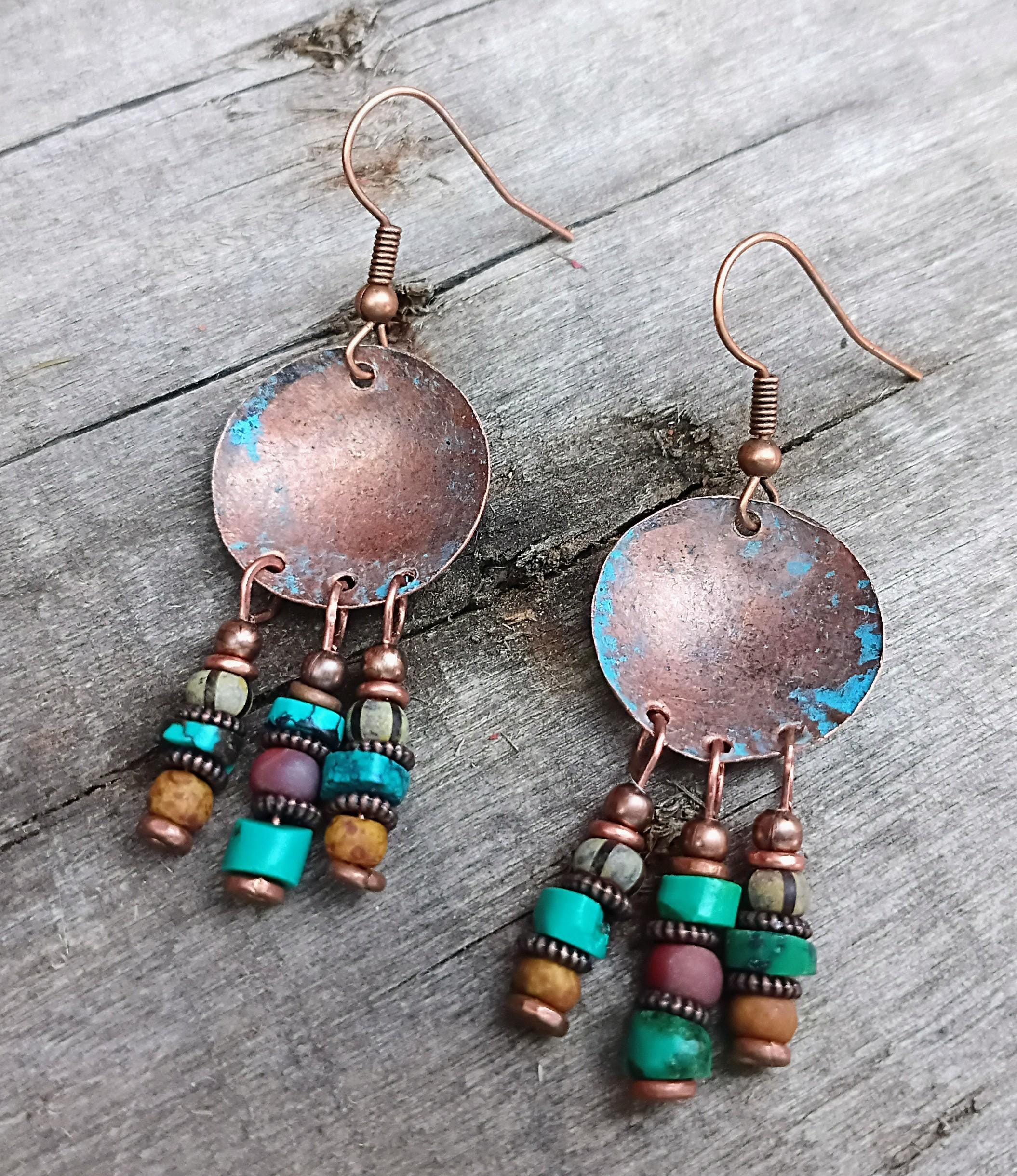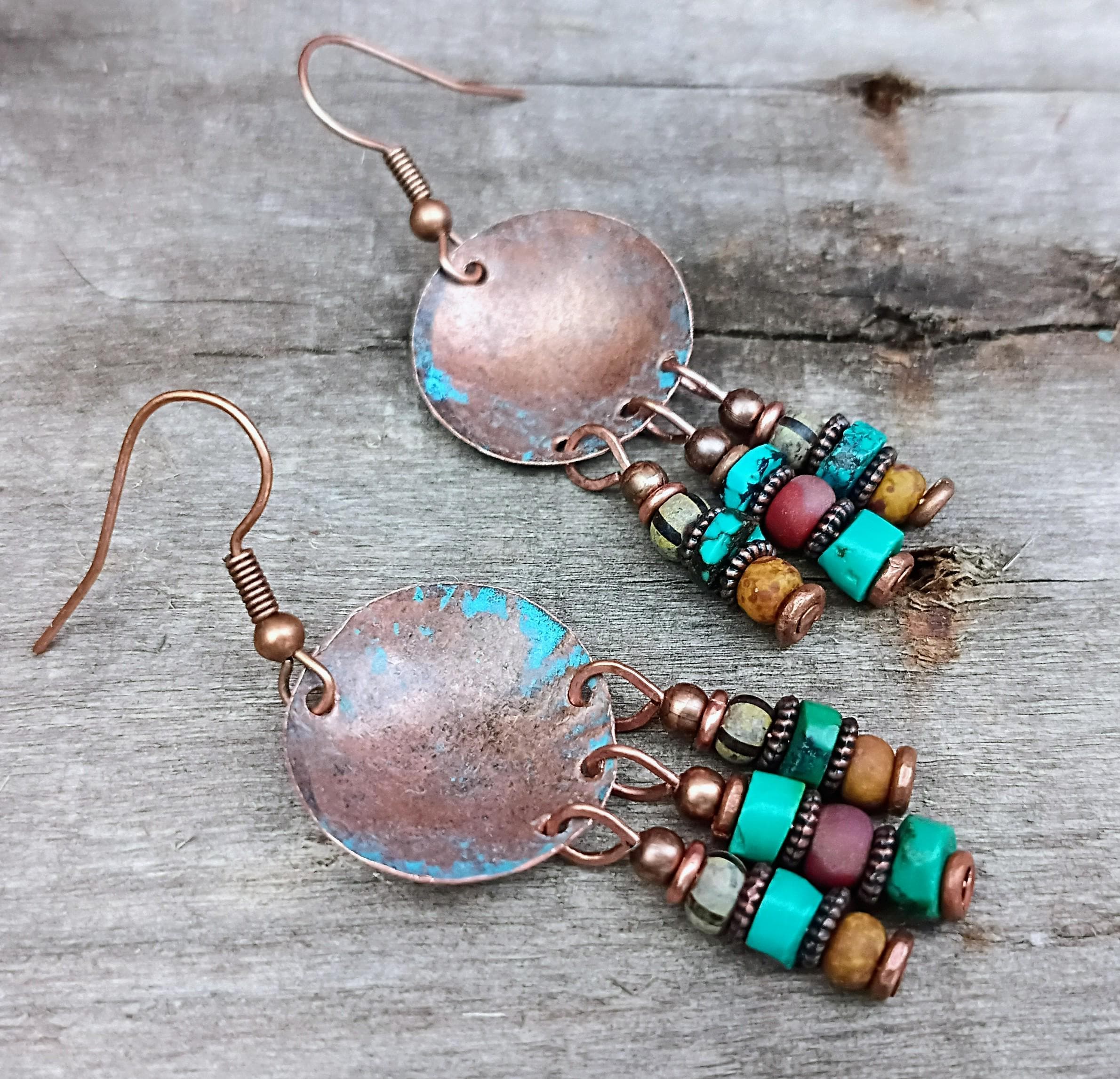 Rustic and beautiful copper coin dangle drop earrings with light blue patina, boho style jewelry. Light weight and sure to compliment any outfit! Made with copper dome circle (hand cut & hammered) coins that have a light blue patina and are clear coated for protection. Beaded on Hypoallergenic ear wires. Dangling from the coins, a mix of glass Picasso seed beads, copper spacers and genuine turquoise beads. All on copper wire. Coins are nickel in size and the total length from ear wires to end of dangles - 2 inches.