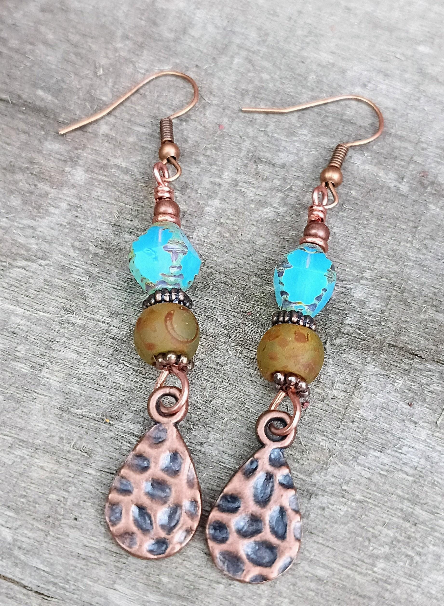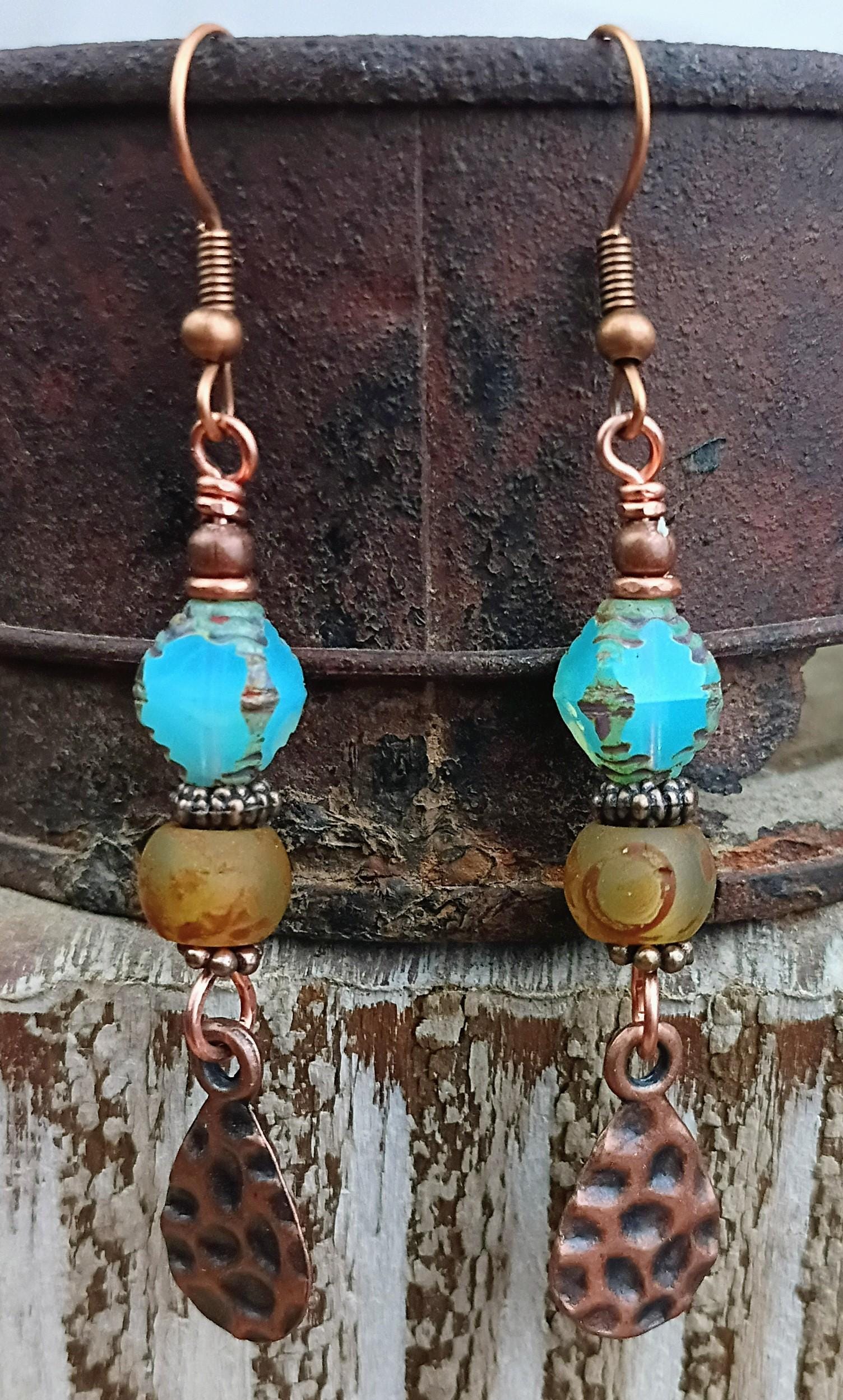 Rustic, beautiful & earthy earrings with a little bit of a beach theme or even southwest cowgirl jewelry? Made with Czech glass beads, copper wire and metal copper teardrop ( hammered) dangles. Hypoallergenic ear wires and copper spacers & beads. These dangle earrings are light weight and approx 2 1/2 inches long. Perfect summer earrings or year around!
