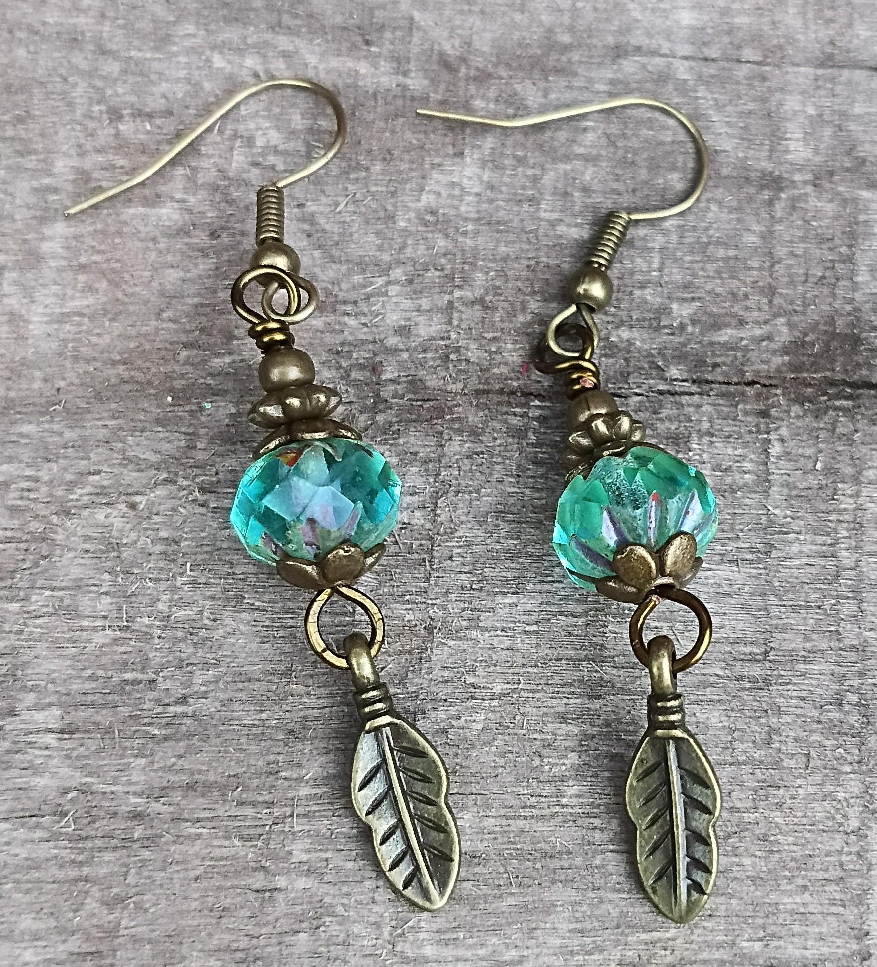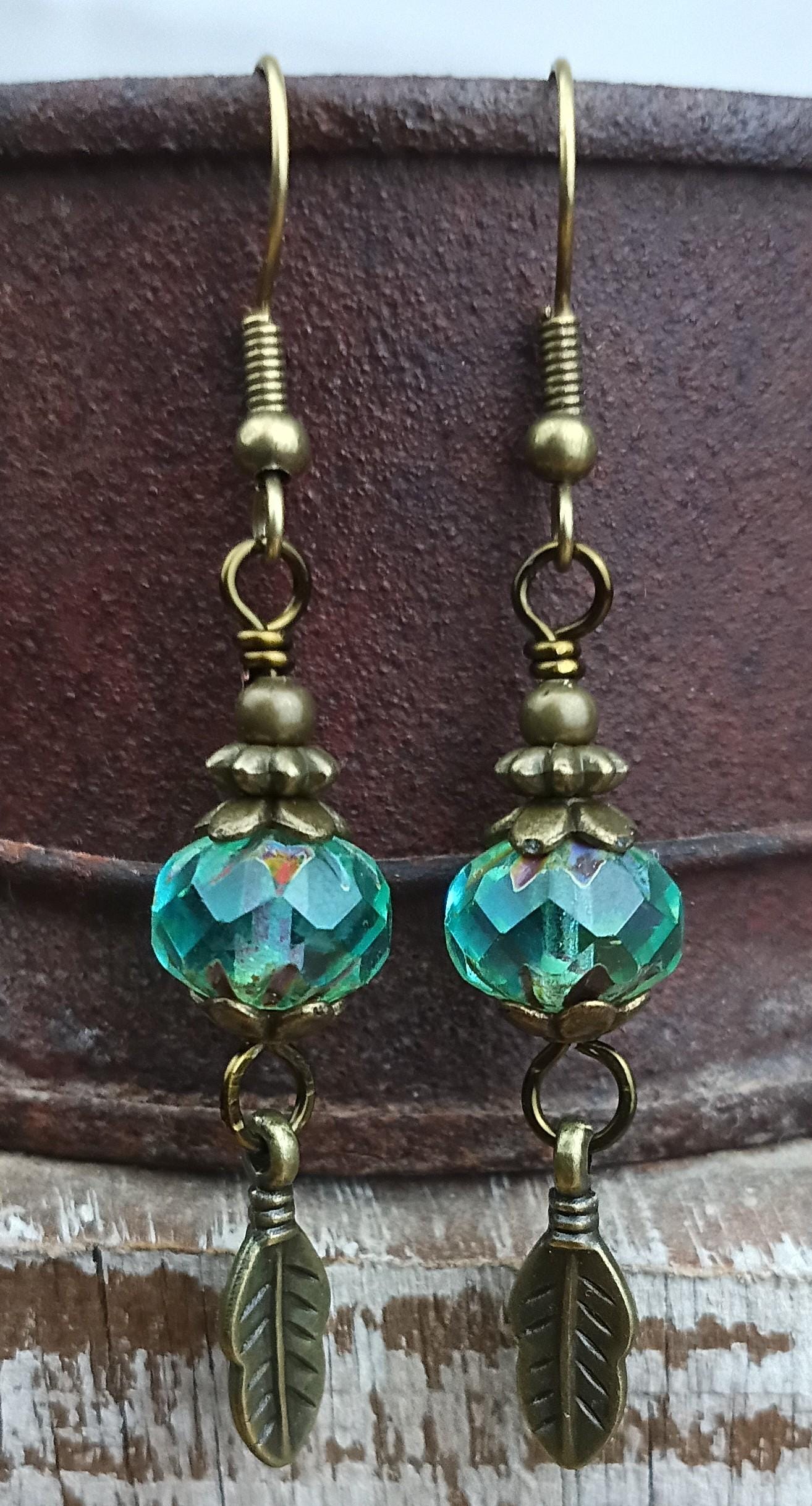 Beautiful Aqua Czech Glass Beaded Earrings with Hypoallergenic ear wires. Beaded on antique brass wire with antique brass/bronze spacers and leaf charm dangle. Czech glass beads are 9x6mm, translucent Aqua color with Picasso finish (beautiful).