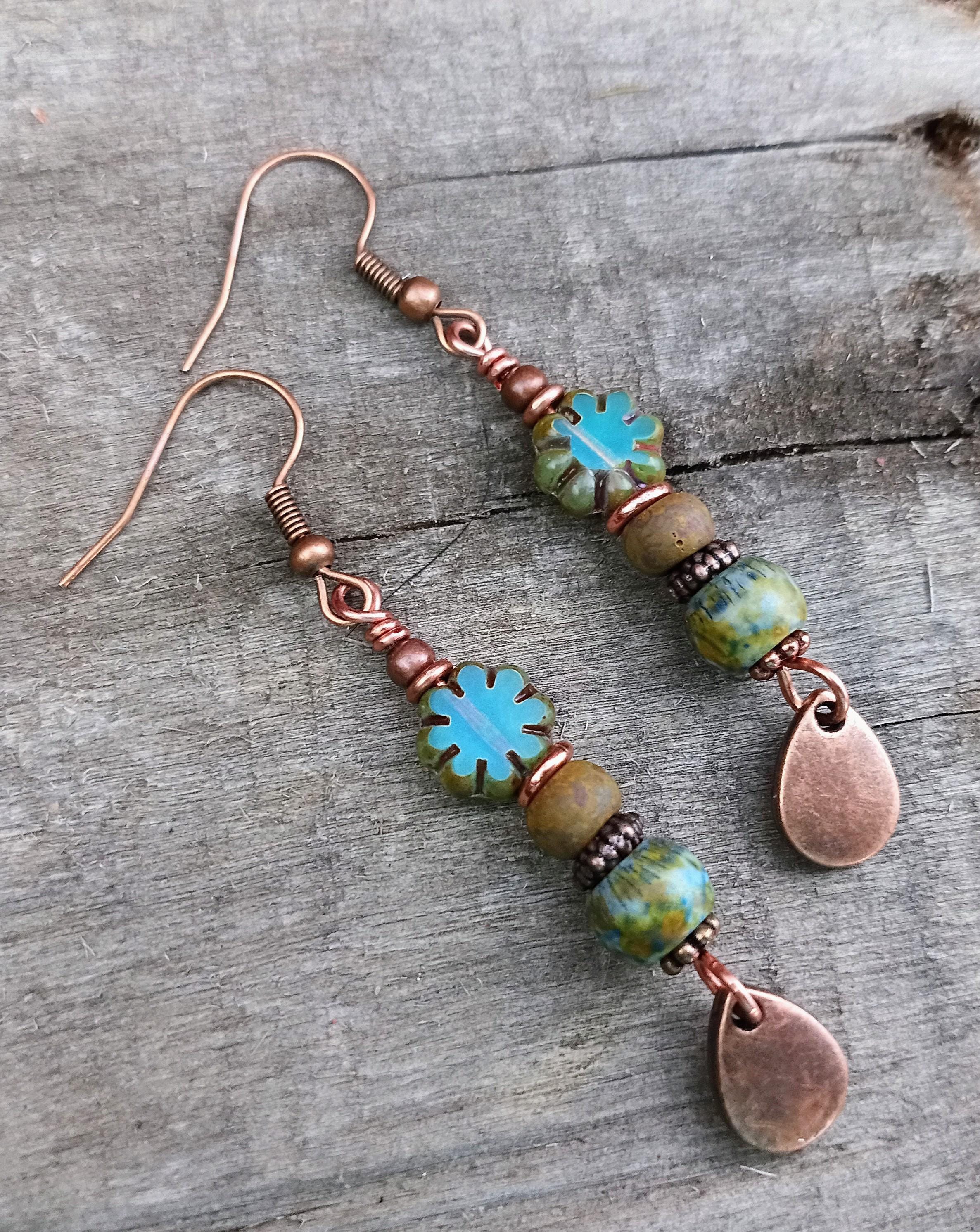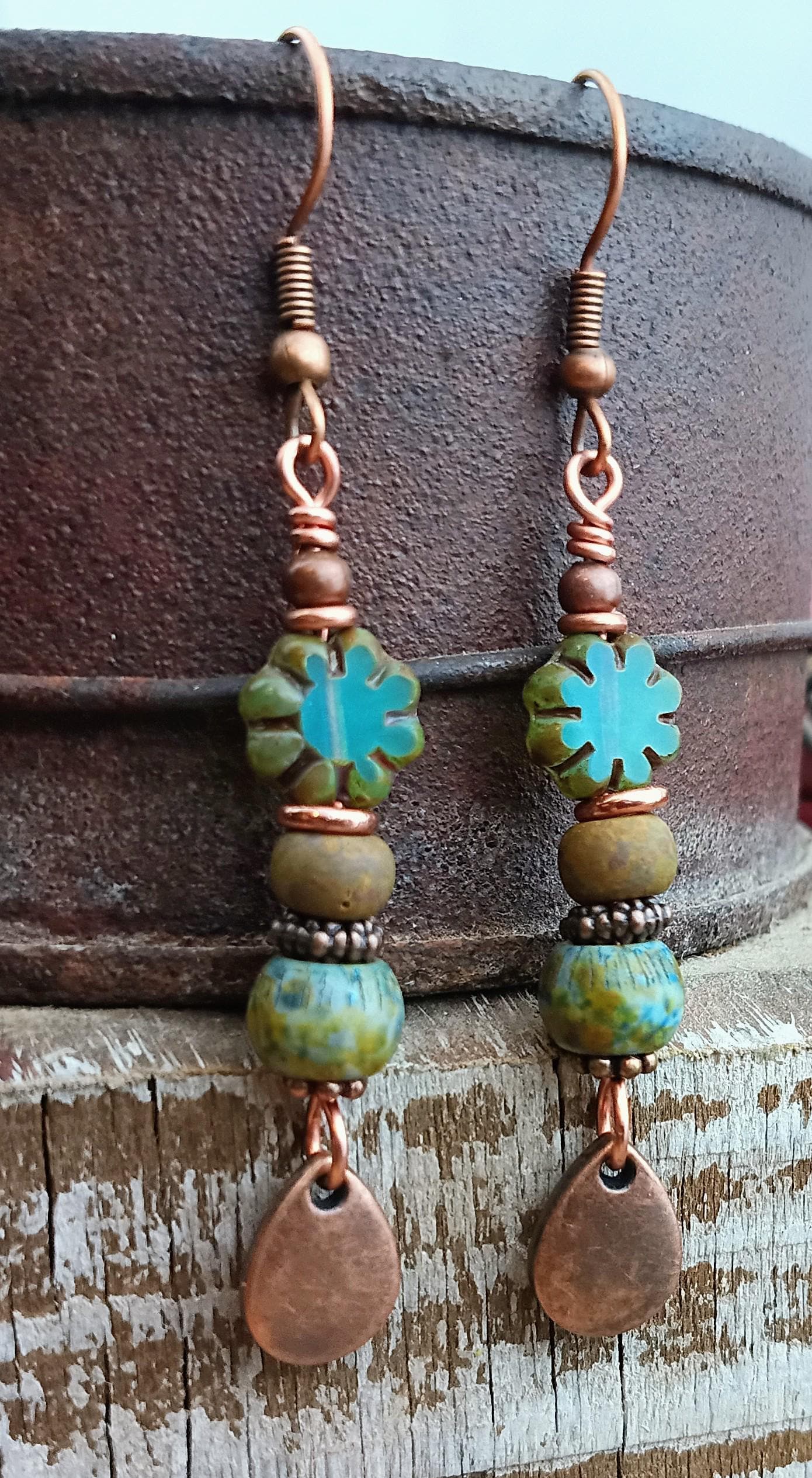 Czech Glass small flower beads are a darker aqua color. Copper spacers and metal copper teardrop dangle.