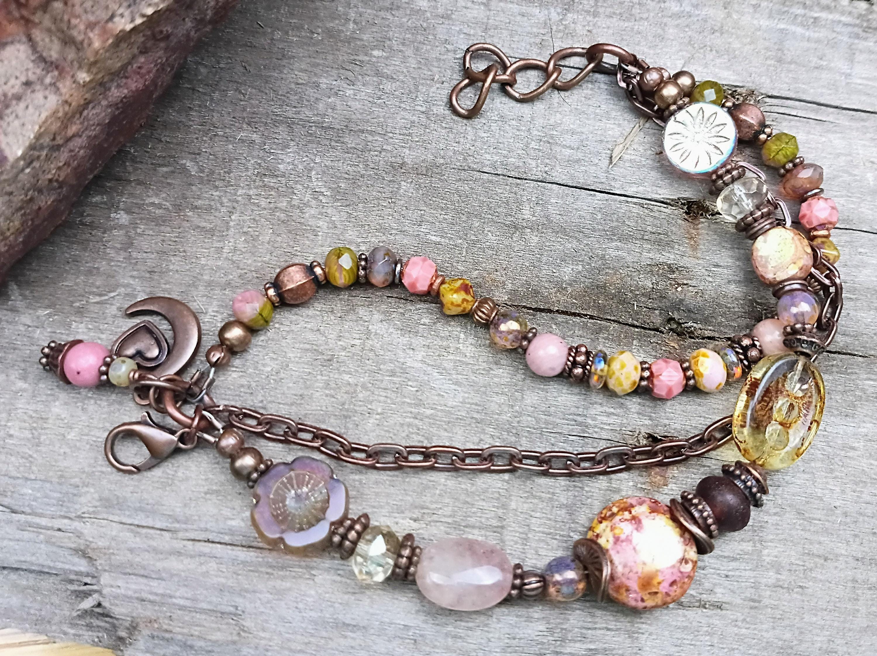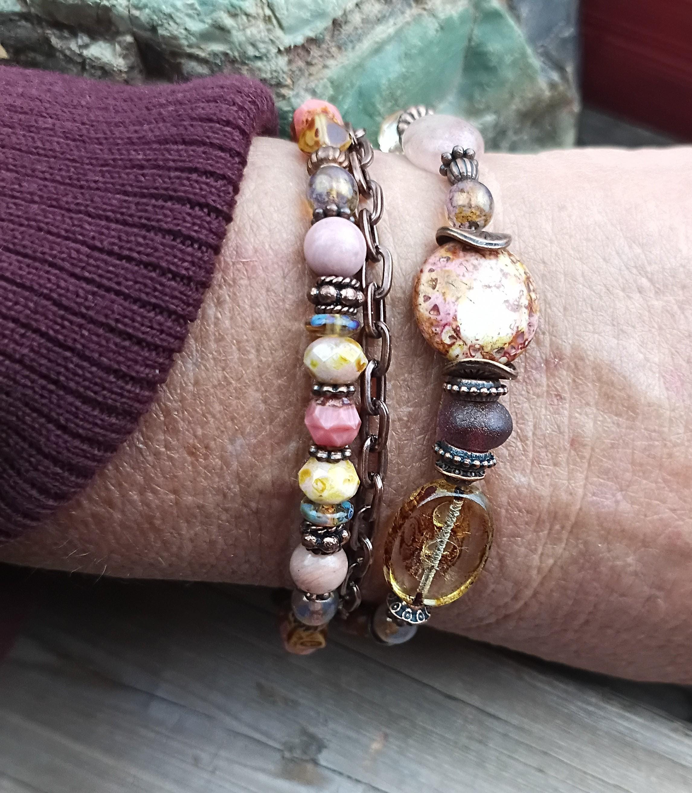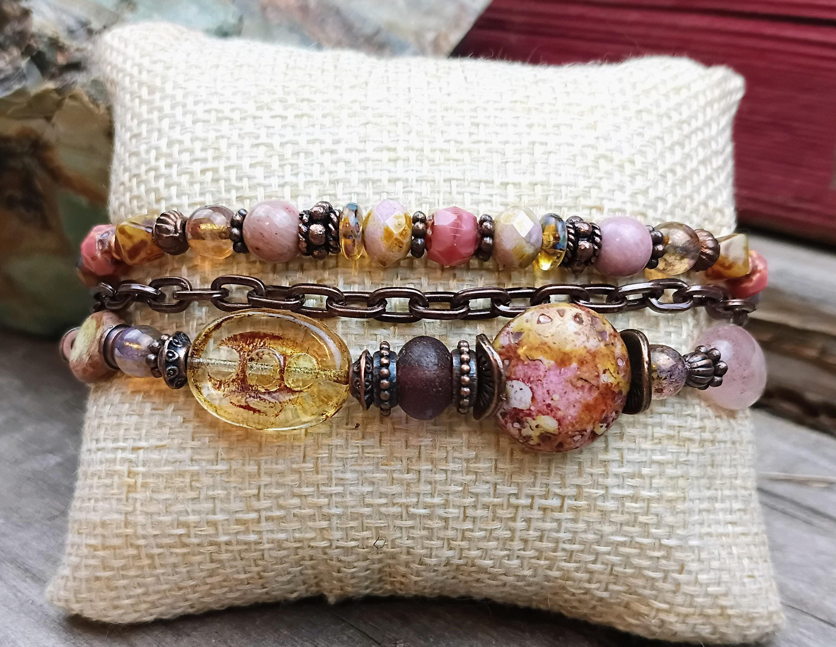 A beautiful antique look to this one of a kind multi strand beaded bracelet, beaded with a variety of Czech glass beads with Picasso finish. Glass 6mm beads, large focal beads, copper spacers with copper chain. Total of 3 strand's. Beaded on stainless steel beading wire with wire guards for added protection. Lobster claw close and adjustable. Designed to fit wrist size of 7 1/2 to 8 1/2. A unique antique look, beautiful for summer!