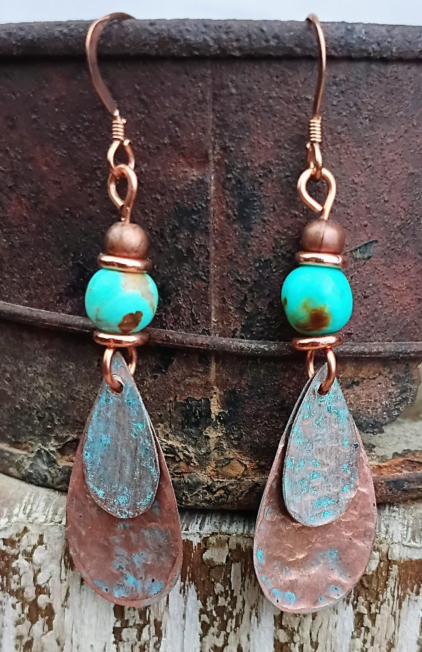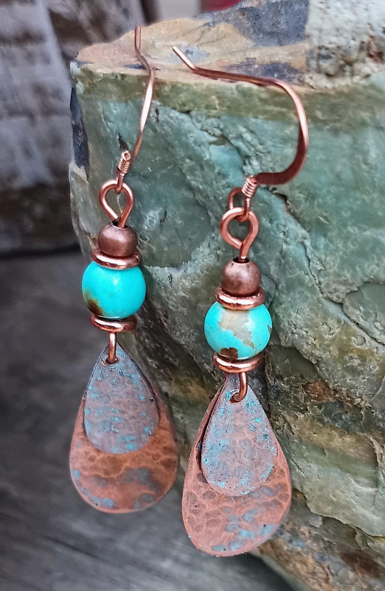 Hand cut and hammered copper teardrops, both teardrops have a light blue patina, both have a clear coat finish to help against oxidation. Turquoise beads are about a 7mm bead, beaded on copper wire.