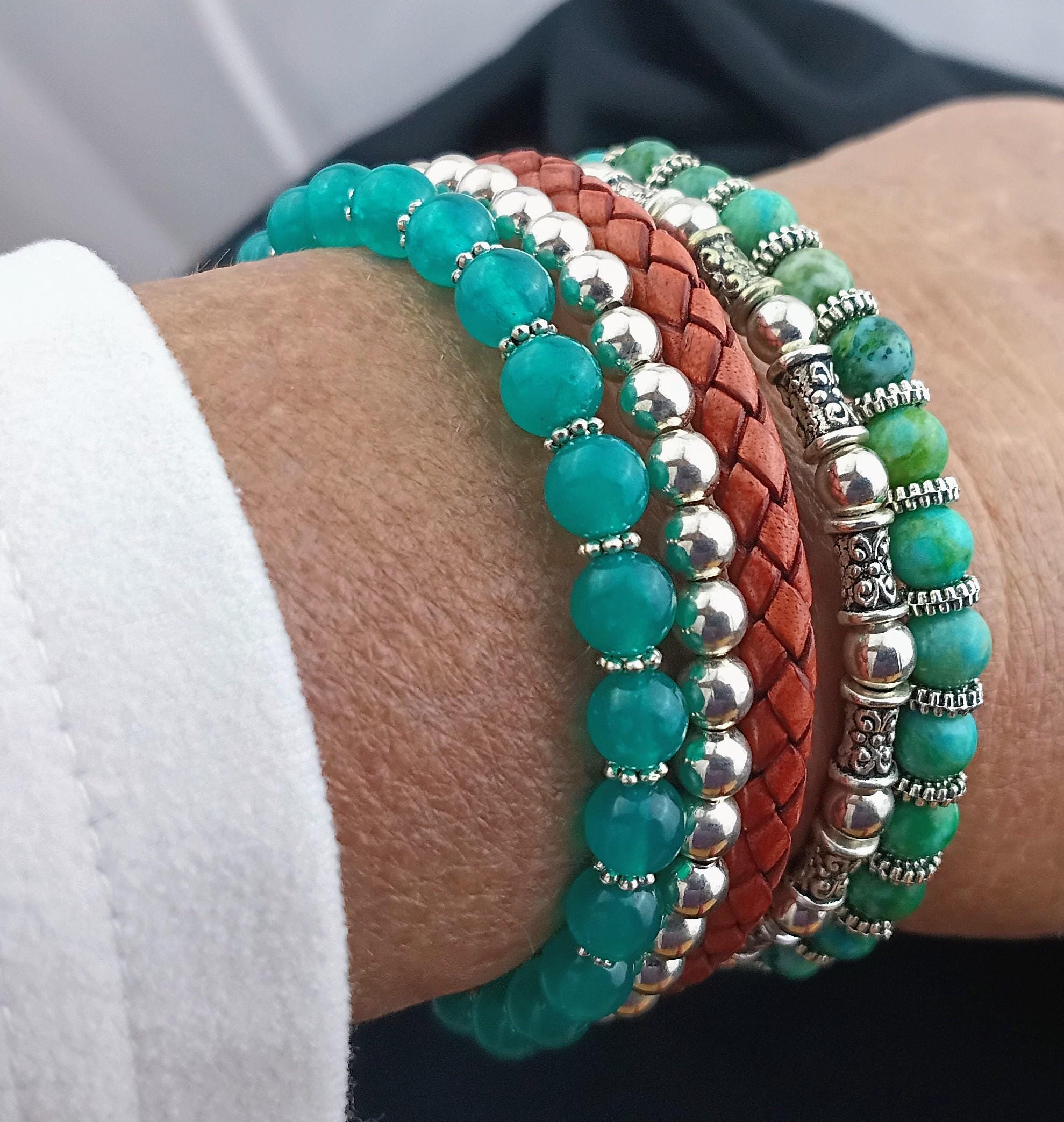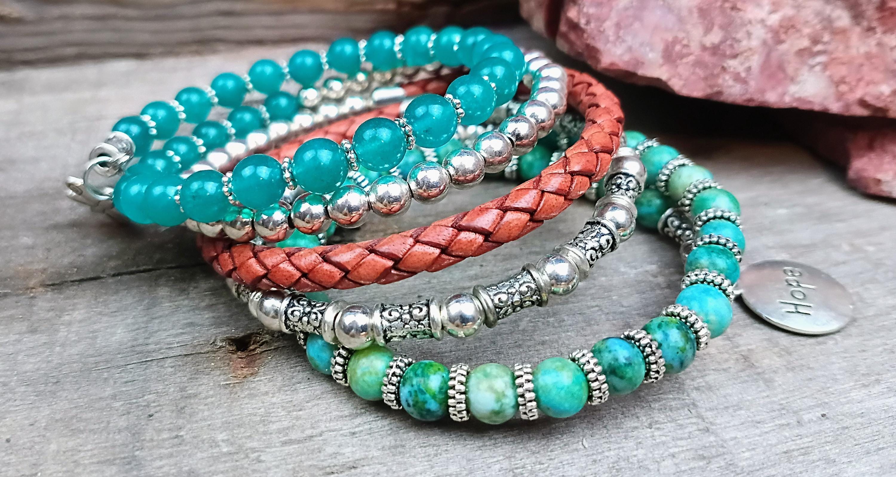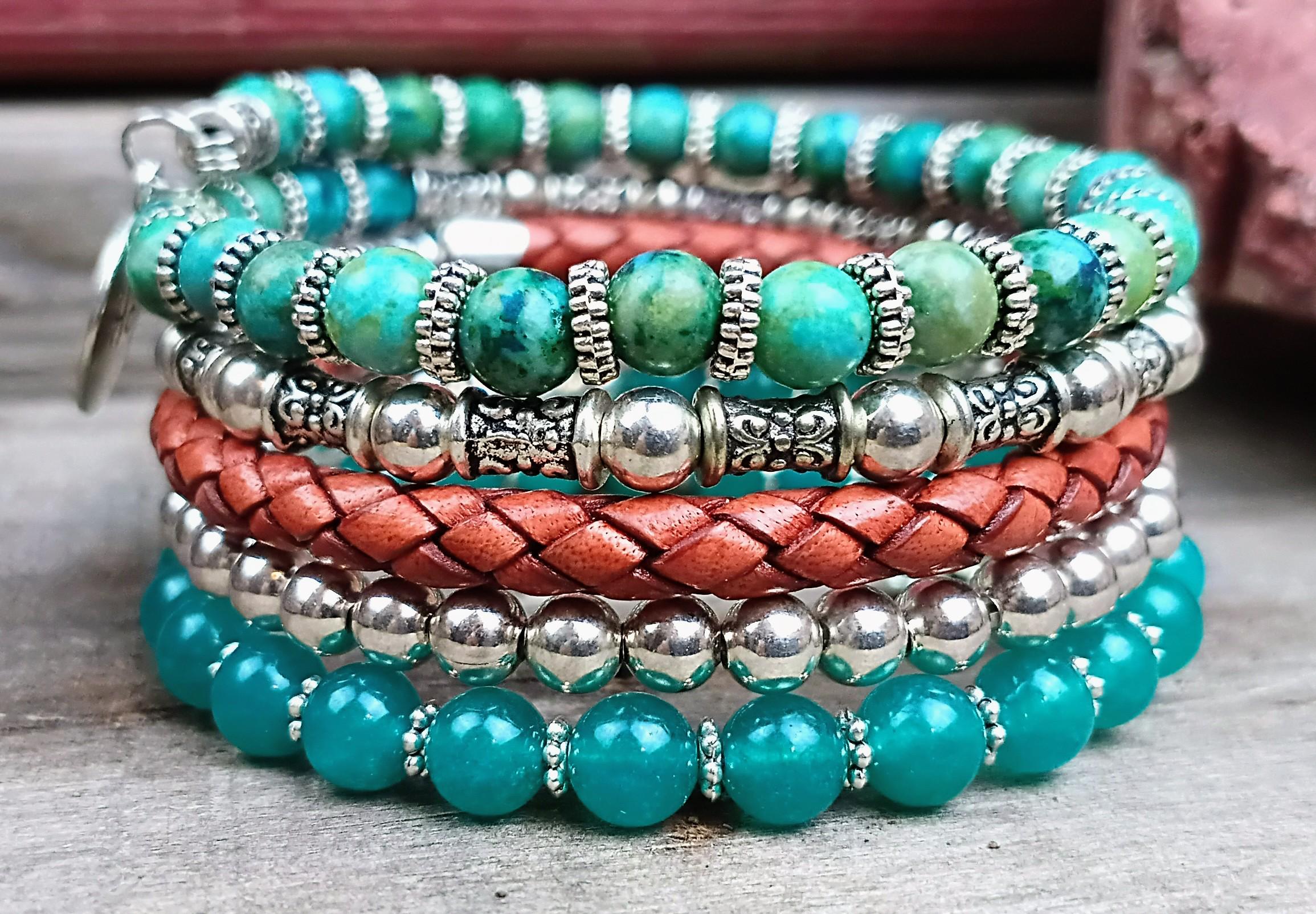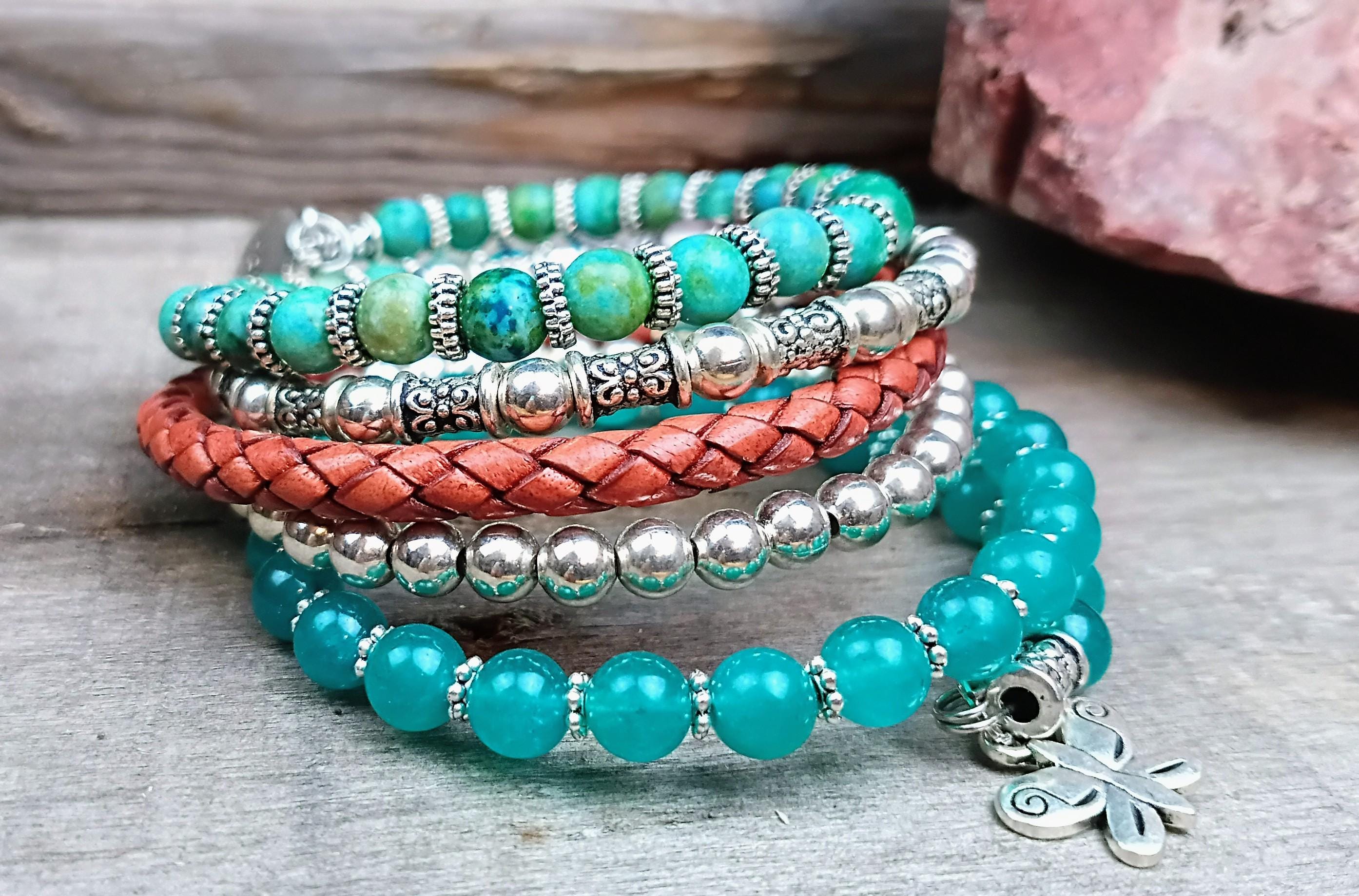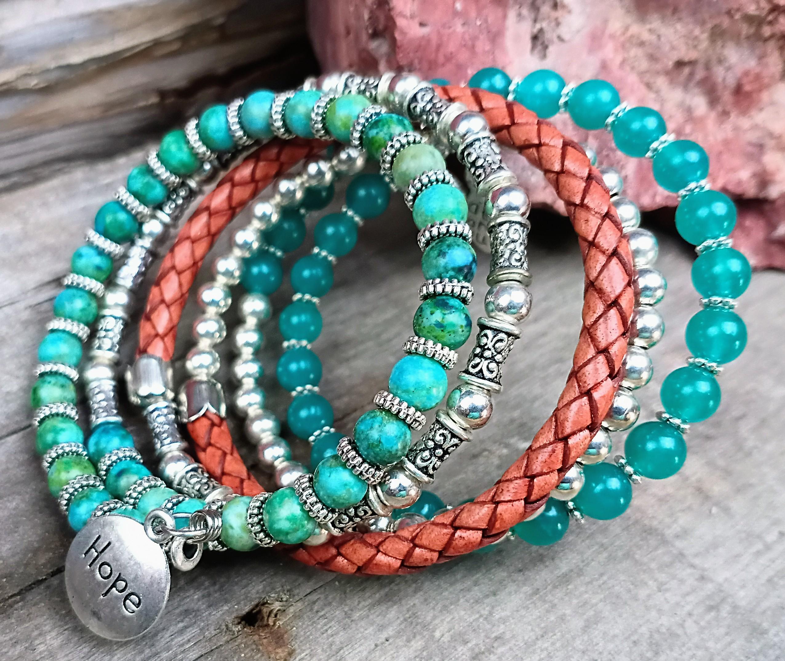 Beautiful Memory Wire Wrap Beaded Bracelet with beautiful lake blue chalcedony beads, imperial turquoise beads, metal silver plated beads and spacers. Braided Leather cord, charms on both ends. Beaded on stainless steel memory wire that keeps it's shape. One size fits most... It will adjust to the size of your wrist. Simple to wear with not clasp to fuss with, simply wraps around the wrist. 5 times wrap - giving the look of wearing 5 different bracelets all in one! Hope and butterfly charms.