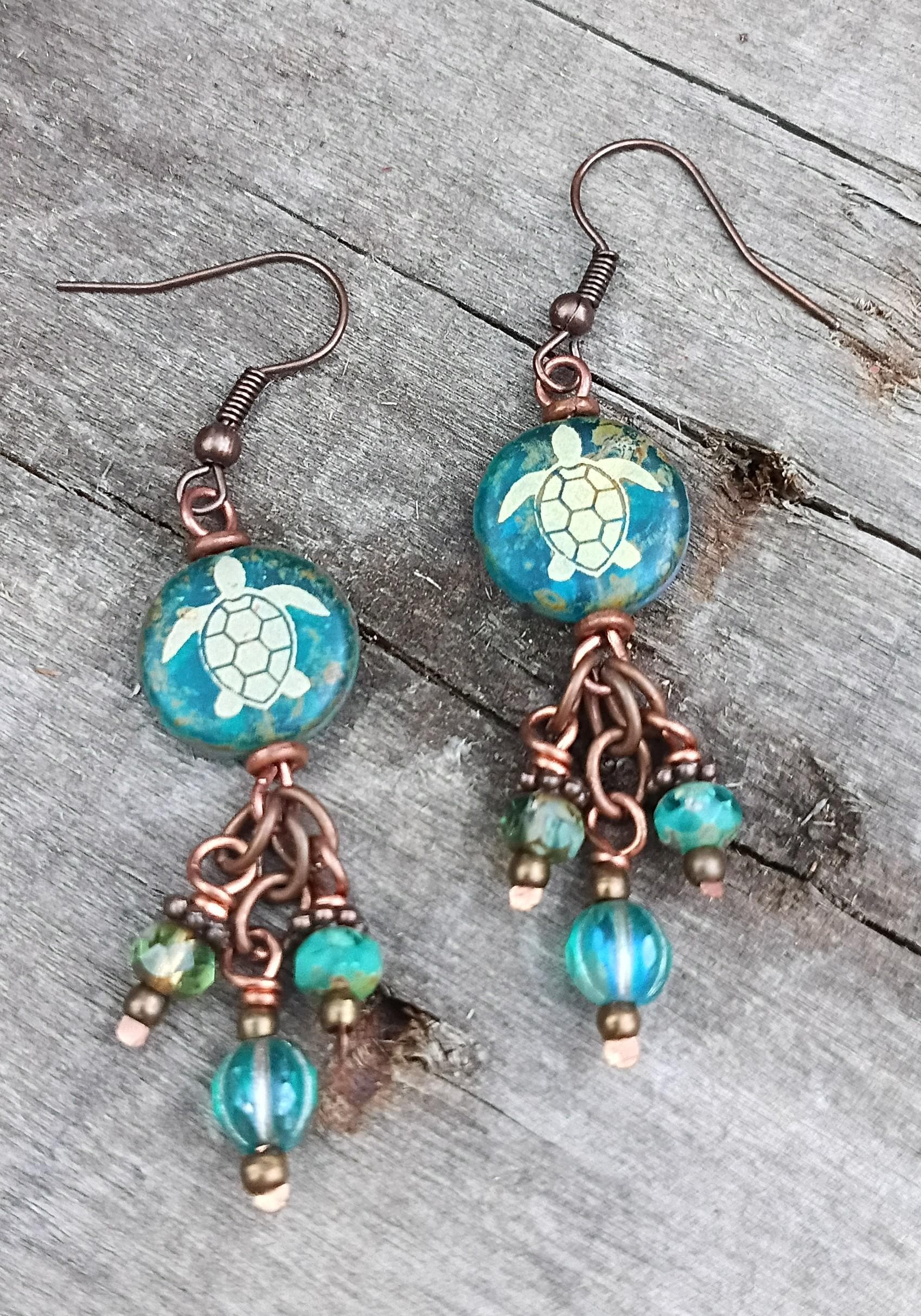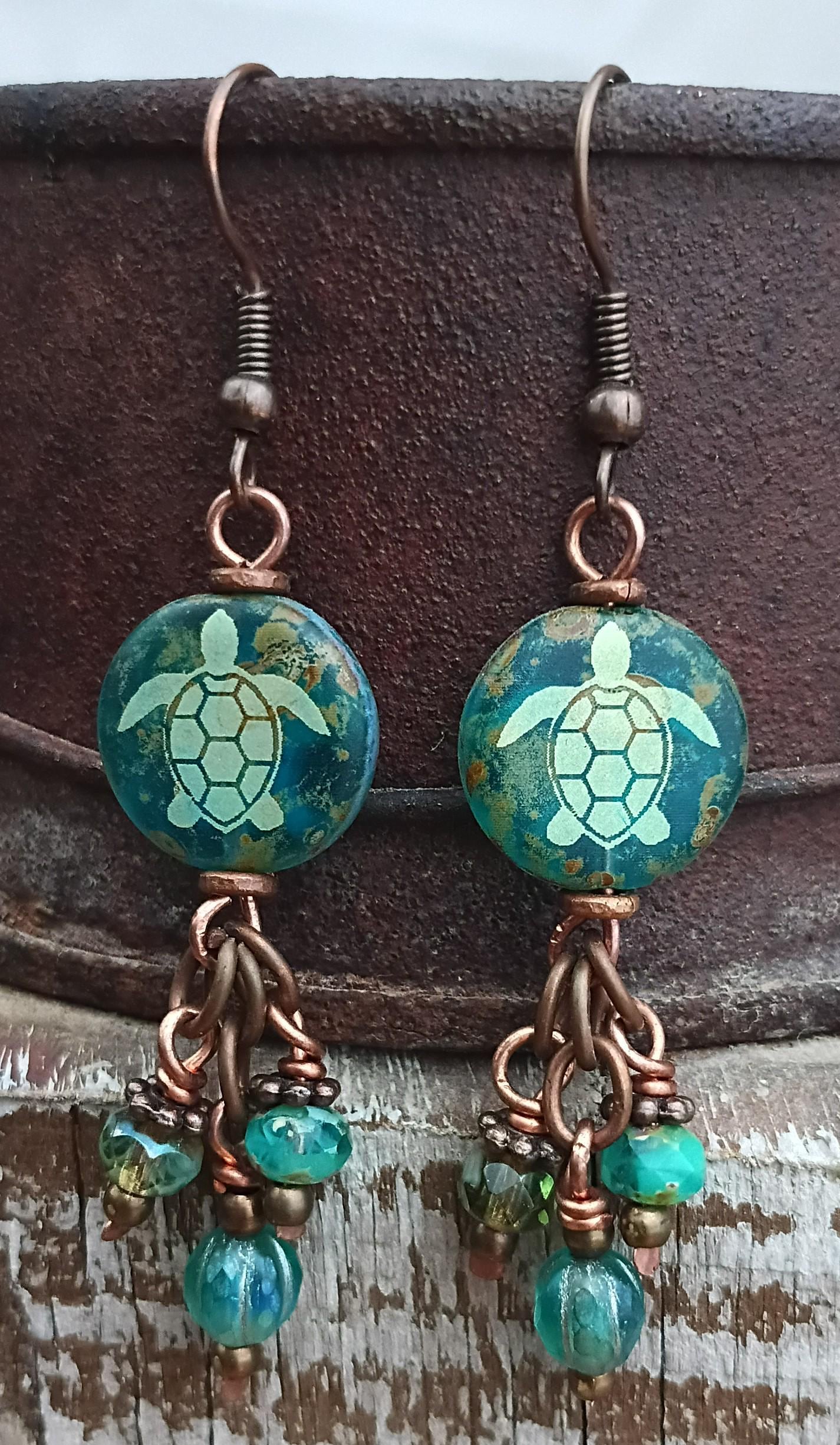 Beautiful Czech glass coin earrings with gold etched Sea Turtles. Beautiful dark aqua color, beaded on copper wire with copper ear wires. Copper spacers with Czech glass beads and seed beads with Picasso finish for the dangle charms. Approx 2 inches long.