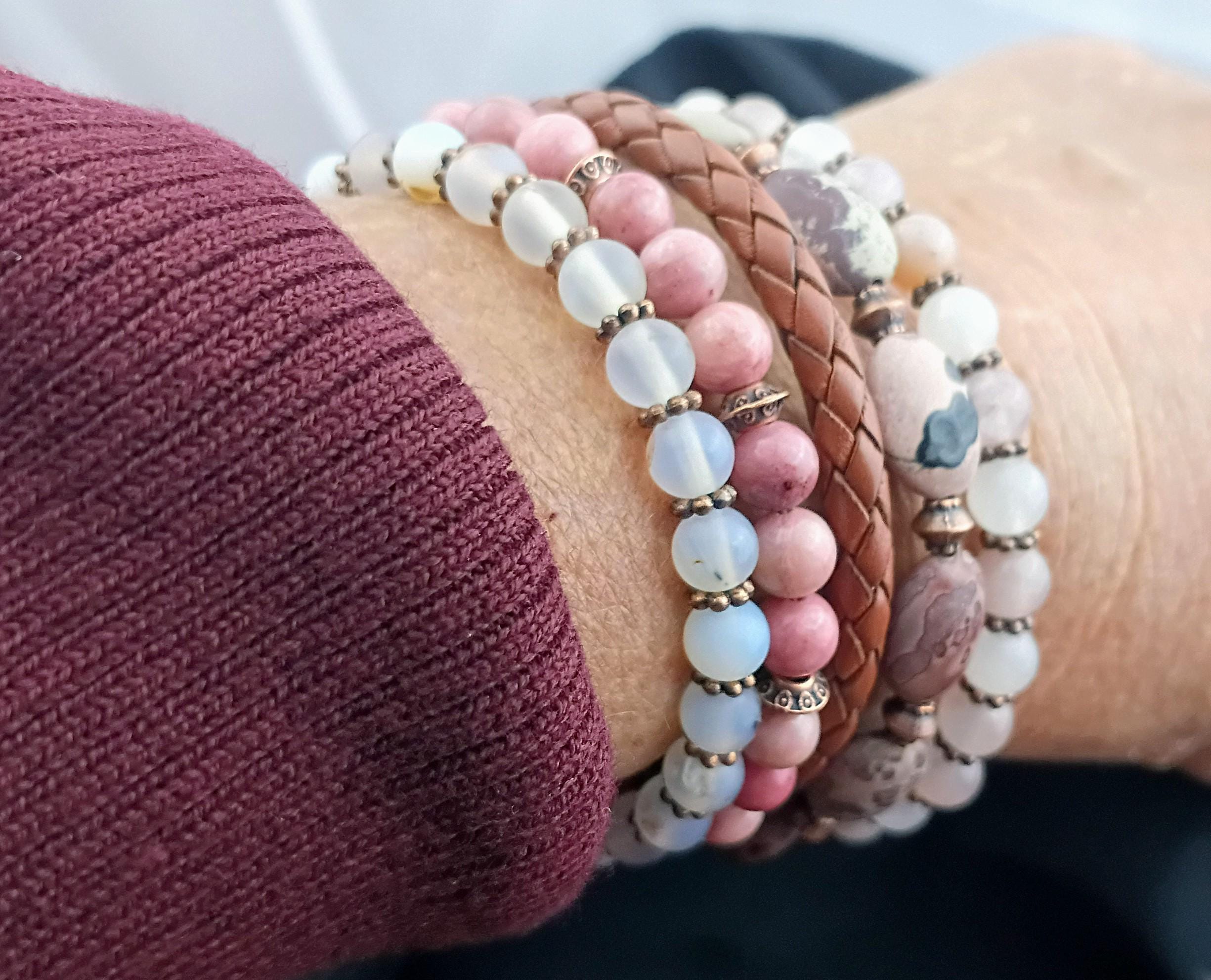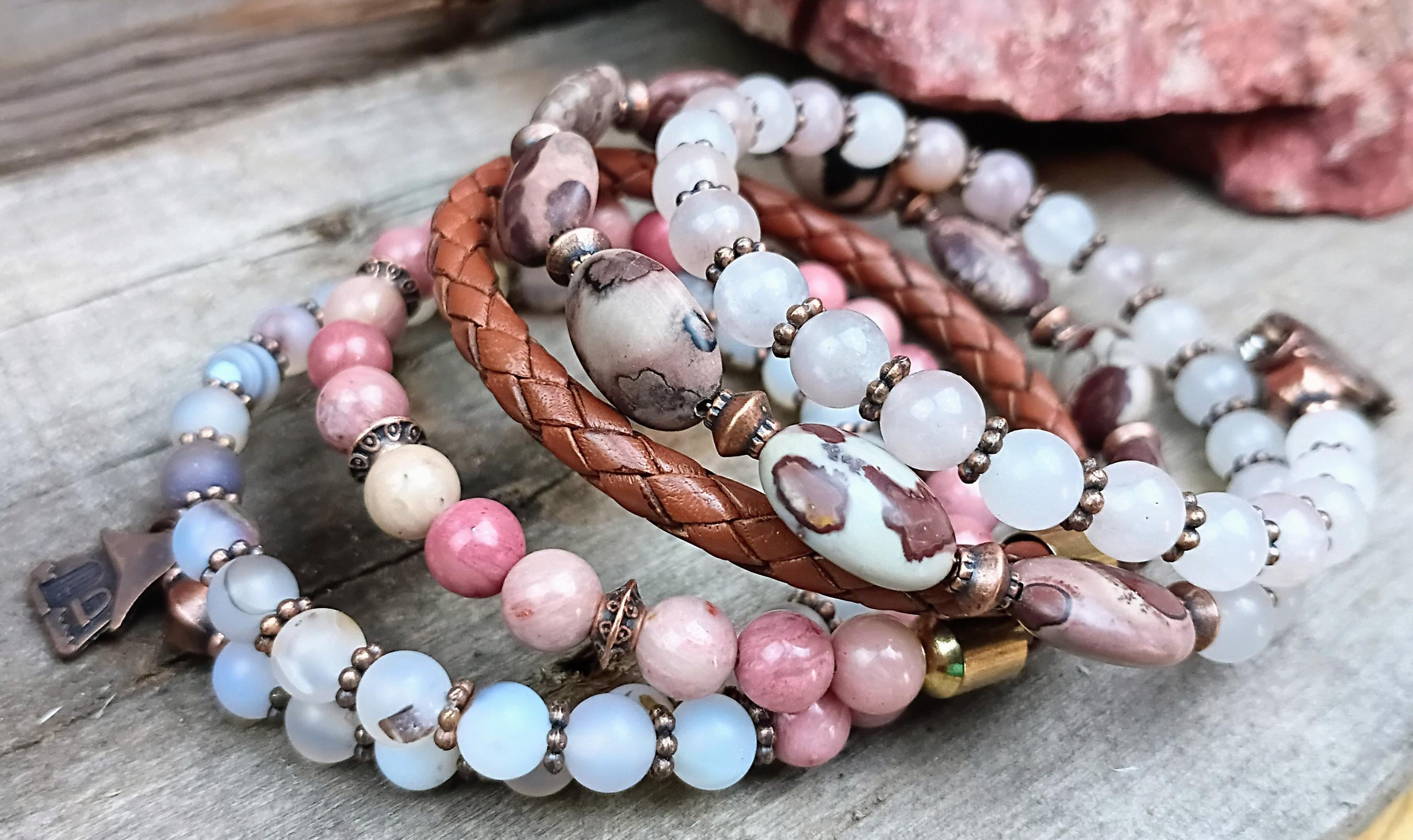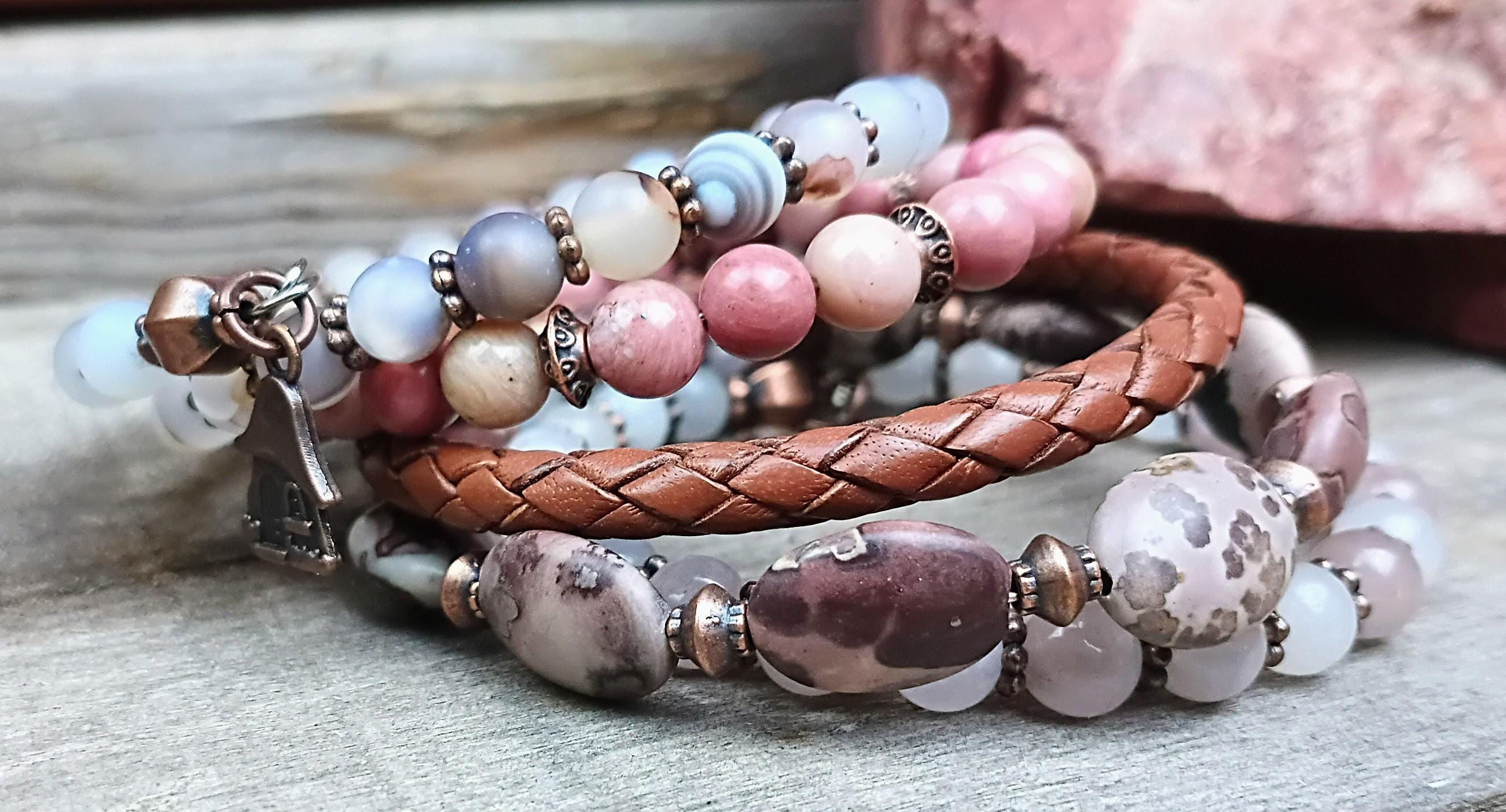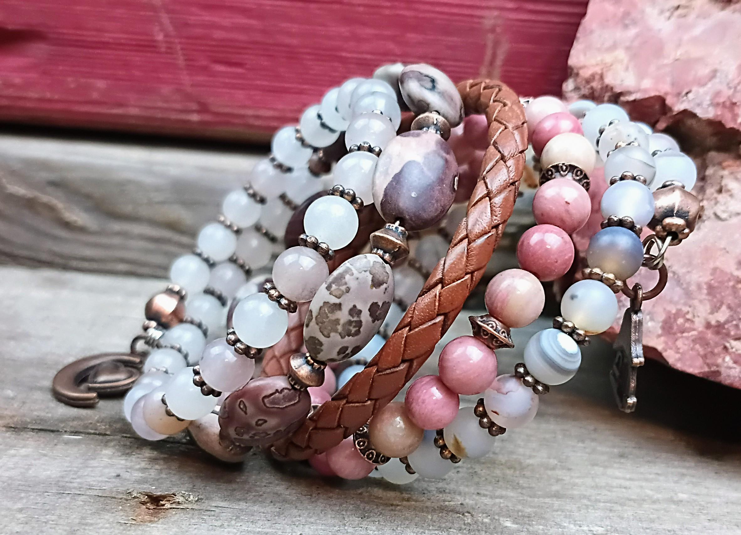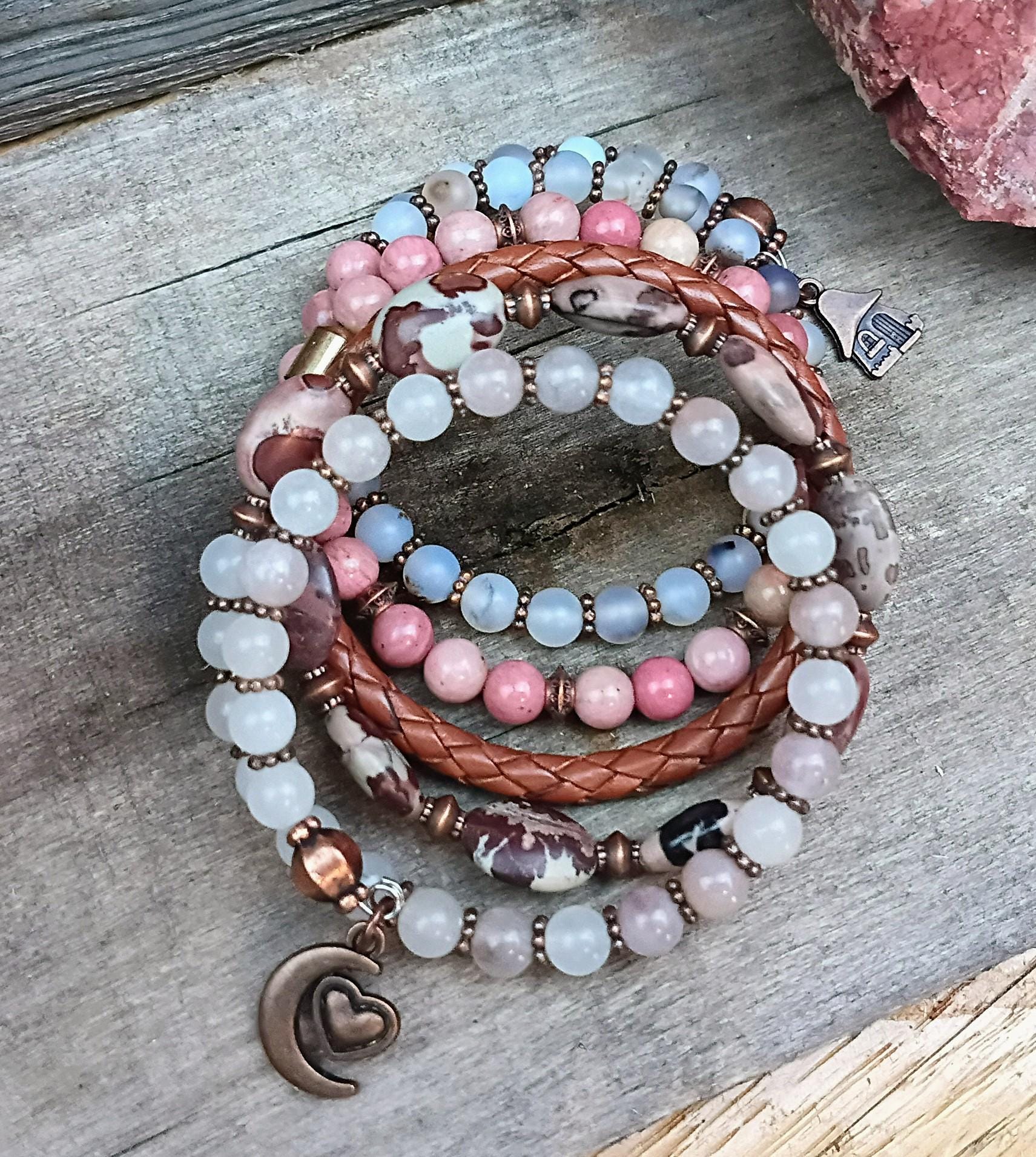 Beautiful, memory wire wrap beaded bracelet in creamy pink colors, rustic boho style wrap! This bracelet is designed to look as if you are wearing 5 different bracelets all in one! Beaded on stainless steel memory wire, wraps your wrist 5 times with charms on each end. Braided Leather cord, Jasper oval beads, Purple Berry Quartzite, Rhodochrosite and Quartz beads. Antique copper metal spacers and beads. Charms are antique copper small mushroom cottage and half moon with heart. Perfect bracelet for year around or a great gift for that special person.