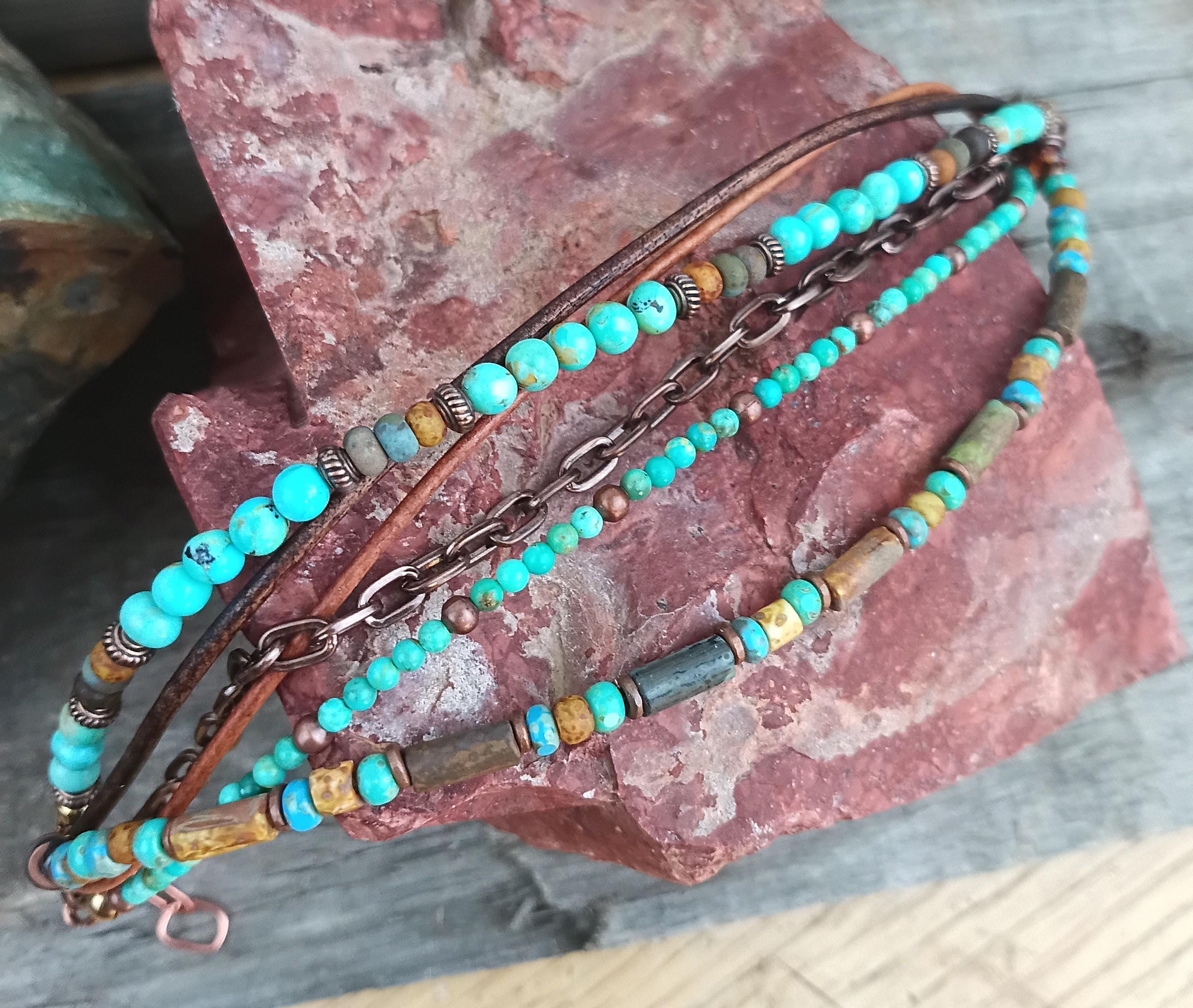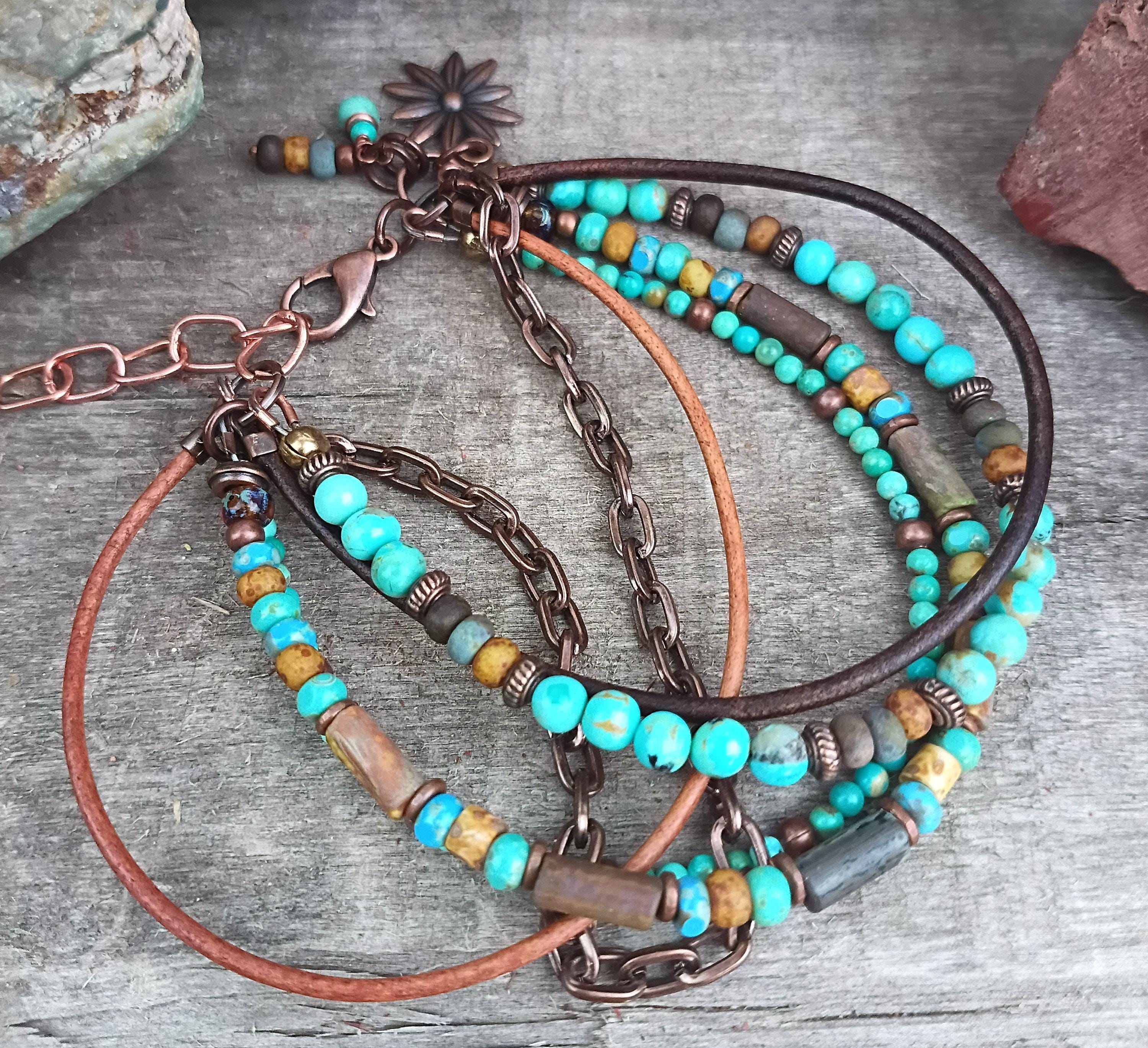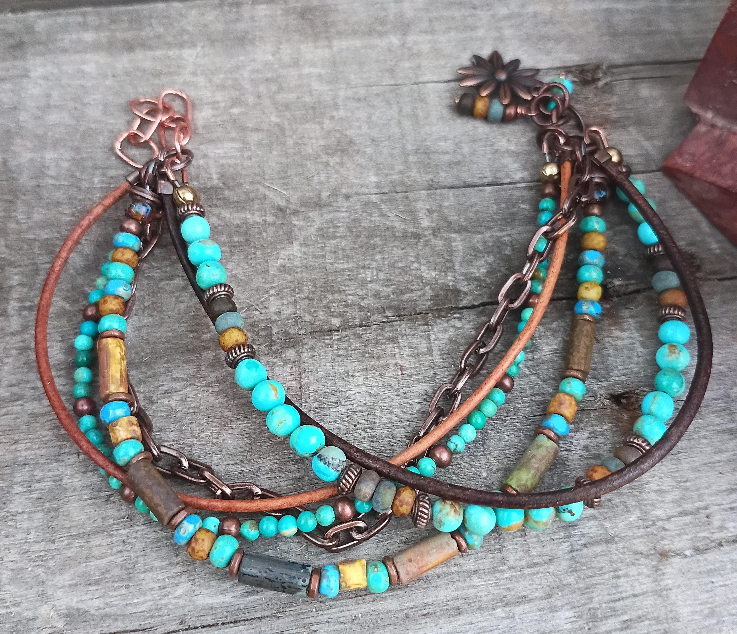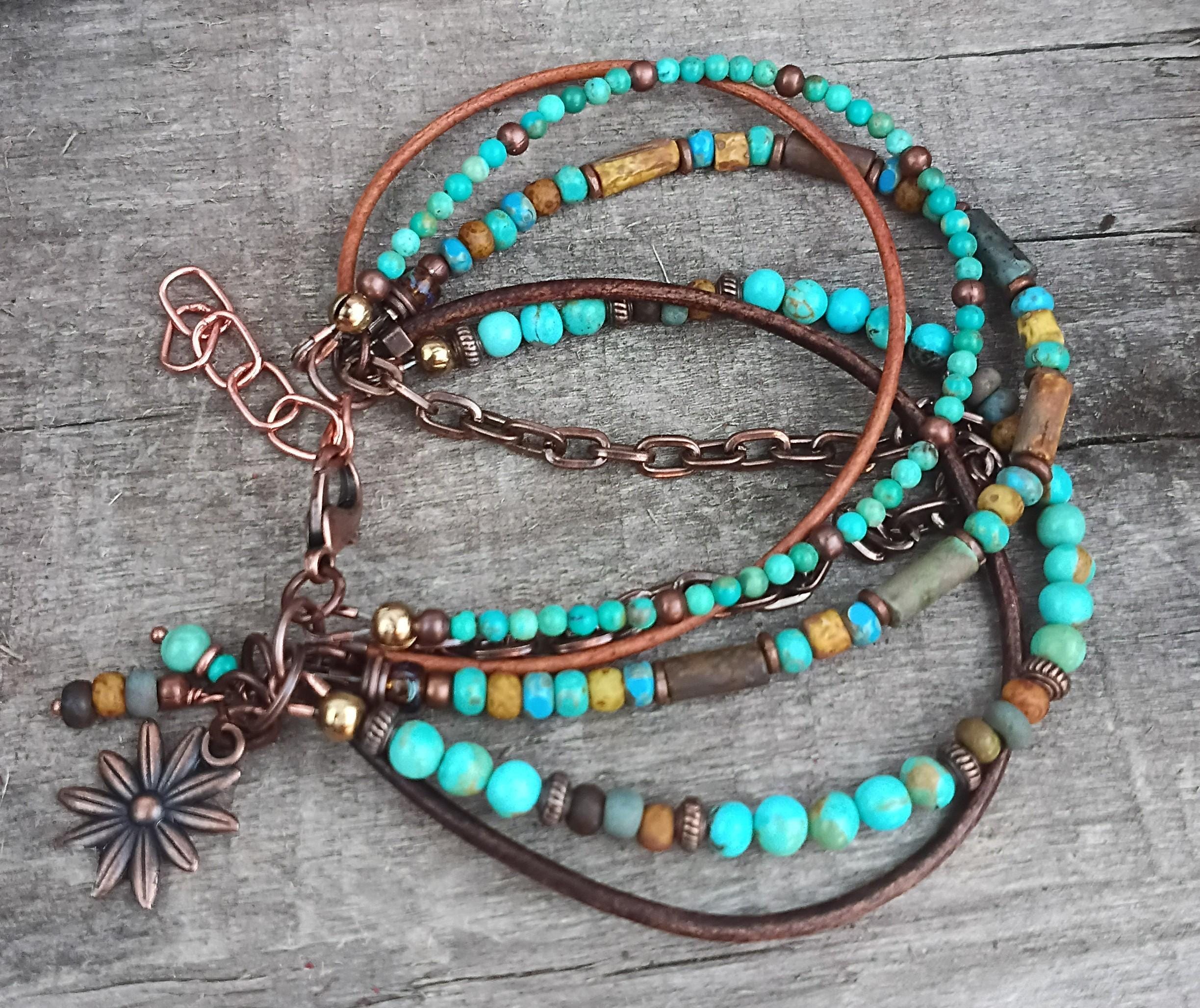 This rustic beautiful bracelet is beaded with 2mm & 5mm genuine Turquoise beads, Czech glass beads (tubes), Picasso seed beads, antique copper spacers and beads, 1.5mm leather strands and copper chain. All beaded on stainless steel beading wire with wire guards for added protection. 2 wire wrapped beaded charms and 1 antique copper flower charm. Perfect summer bracelet or a great gift for that special person!