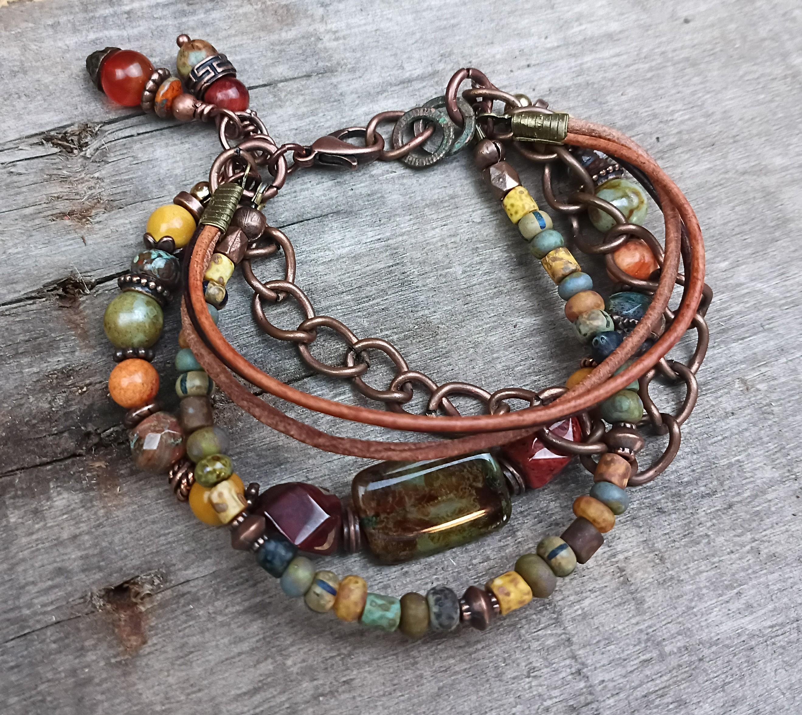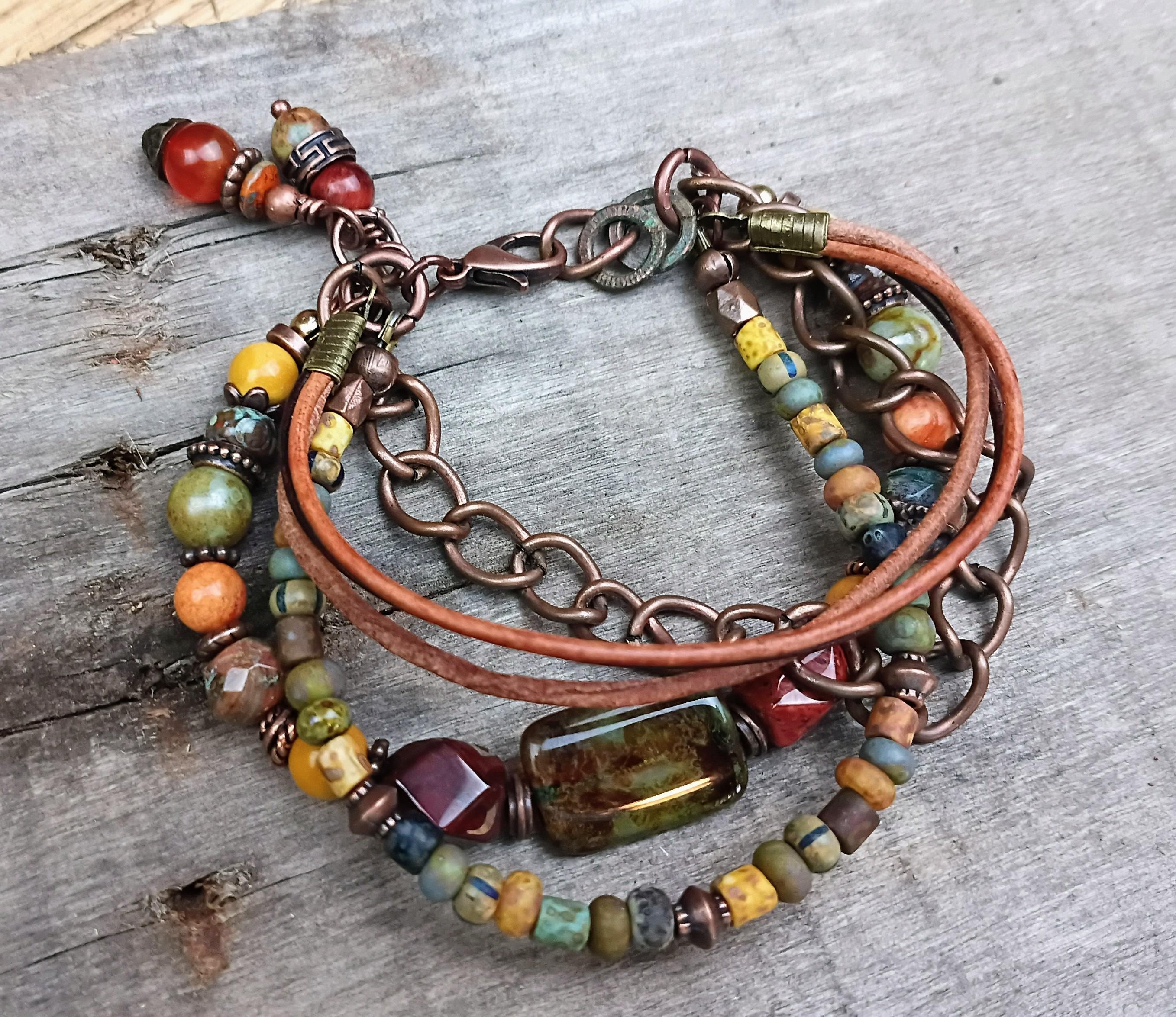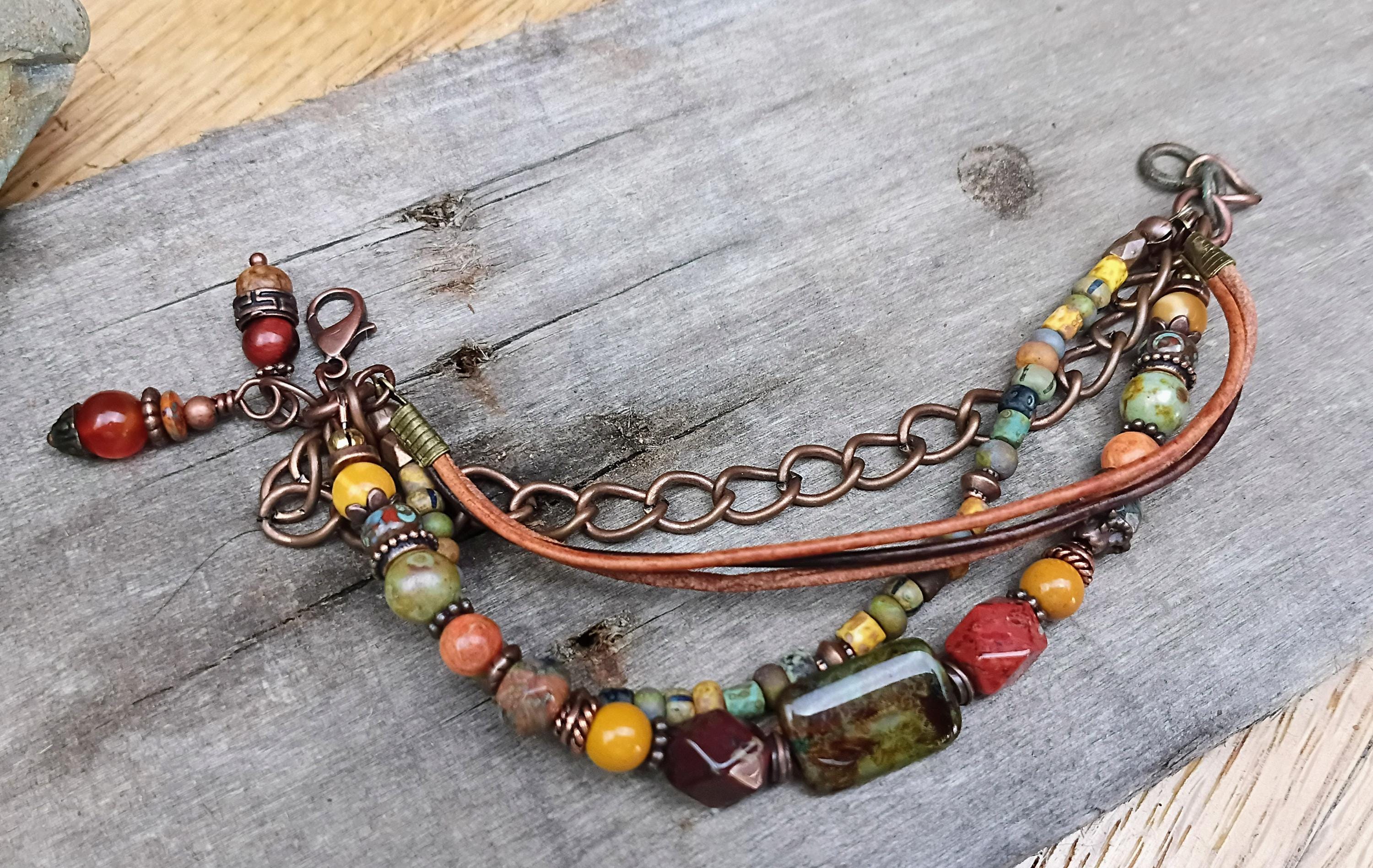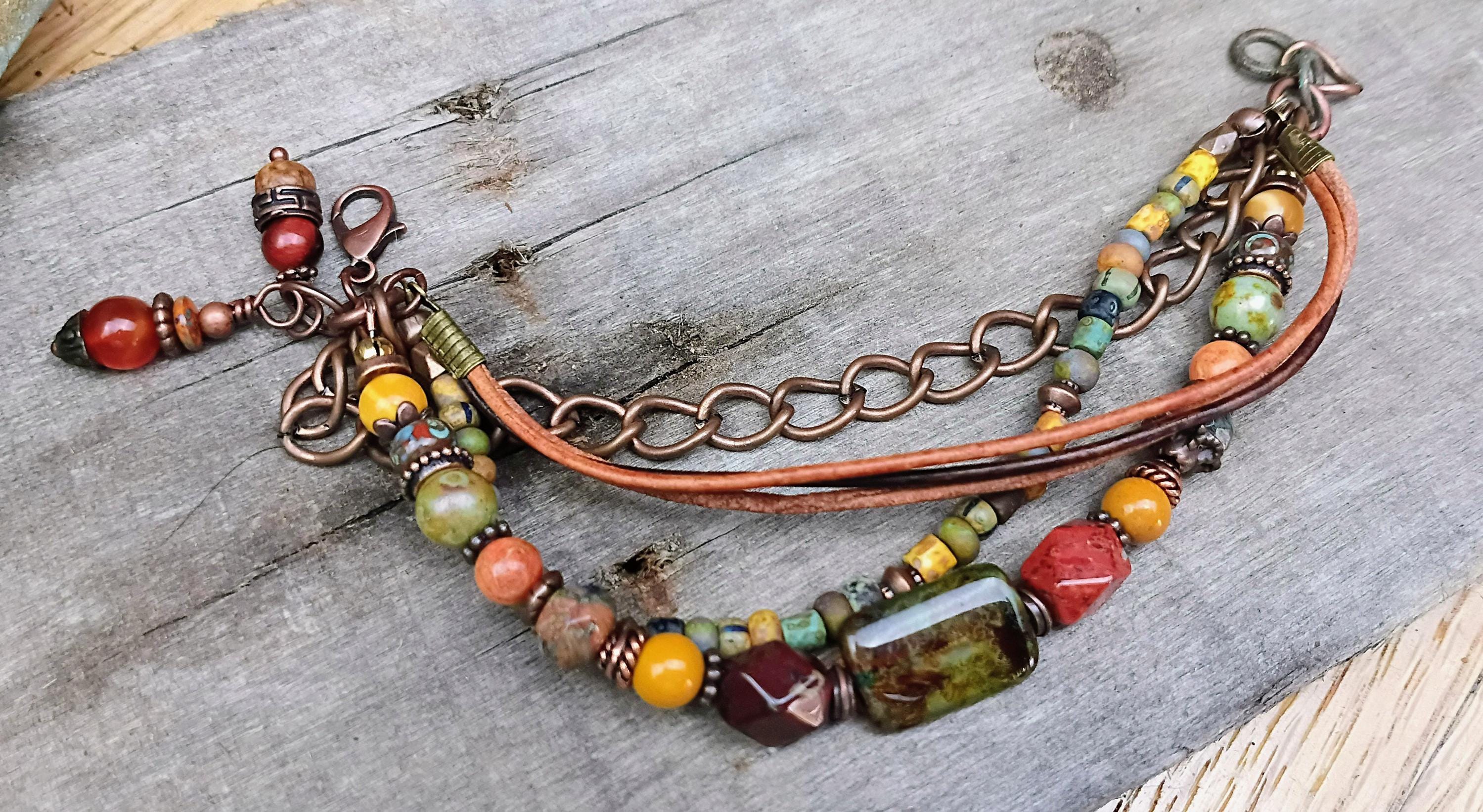 This artisan bracelets has a variety of beautiful beads in warm earthy colors of Czech glass beads, Picasso glass seed beads, Jasper, Large Czech glass Focal bead, copper metal spacers, 1.5mm leather strands, copper chain, Apple Coral beads & Mookaite beads. Bead sizes range from 6mm to 12mm. 2 wire wrapped beaded Carnelian charms on the end. All beaded on stainless steel beading wire with wire guards for added protection. This bracelet is adjustable and designed to fit 7 to 8 inch wrist. A beautiful bracelet to compliment any outfit and a great Bohemian summer bracelet!