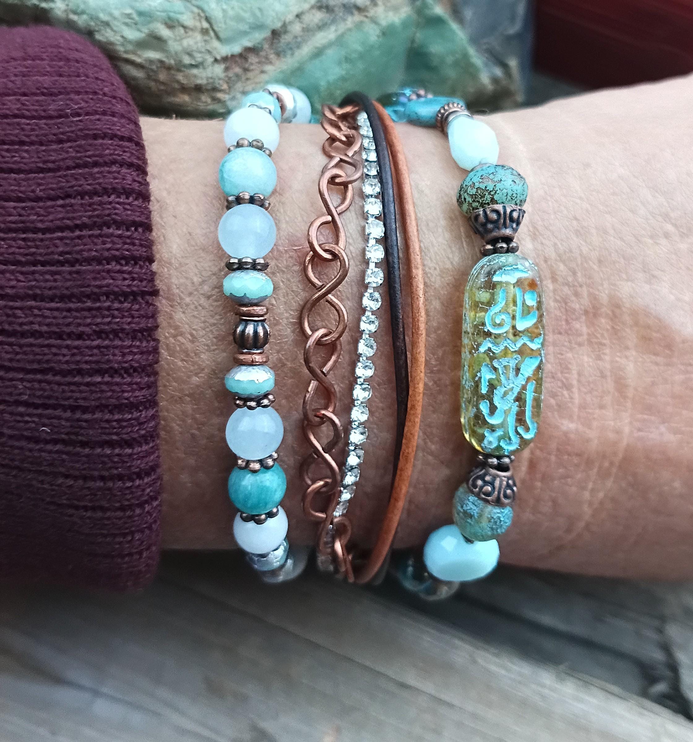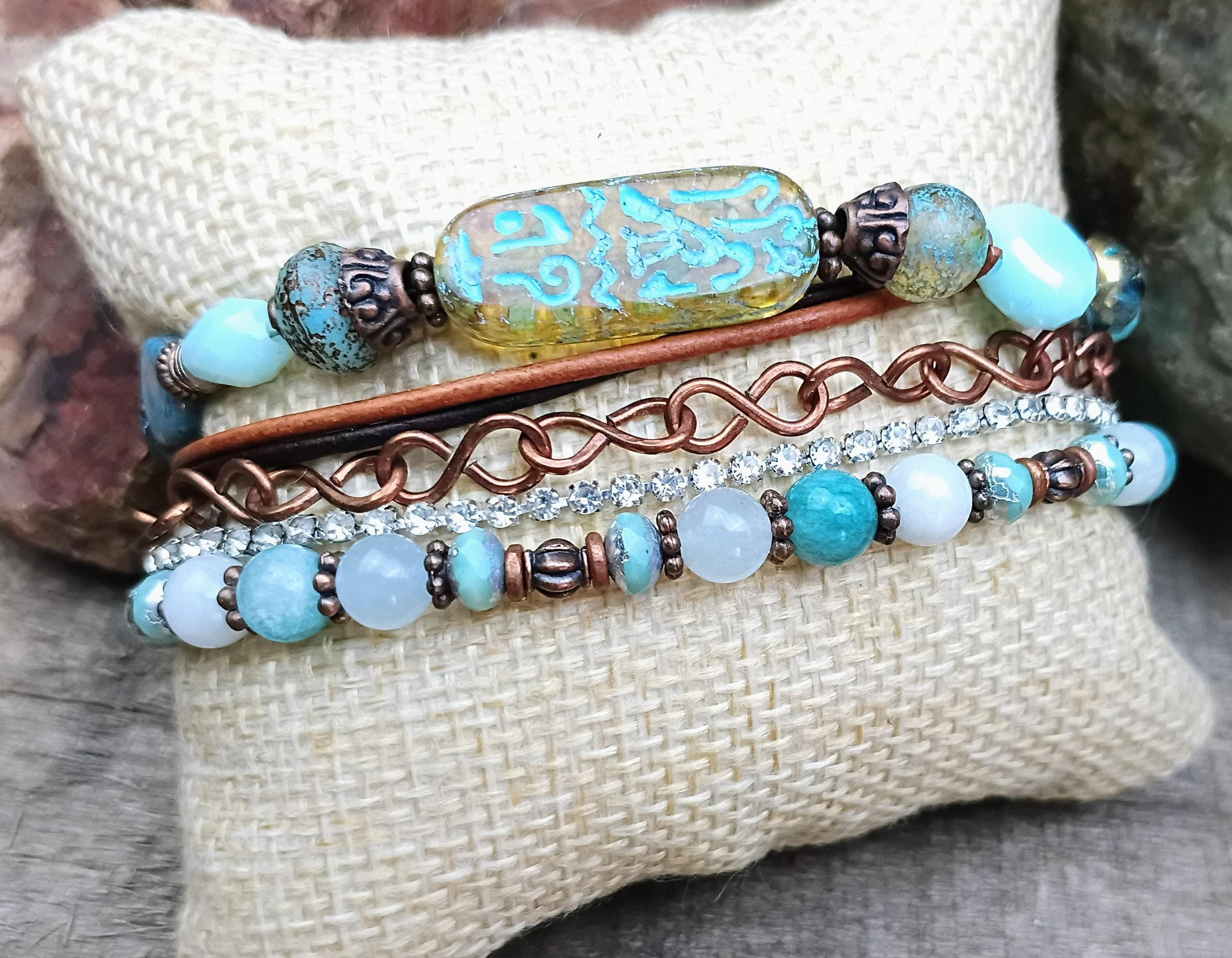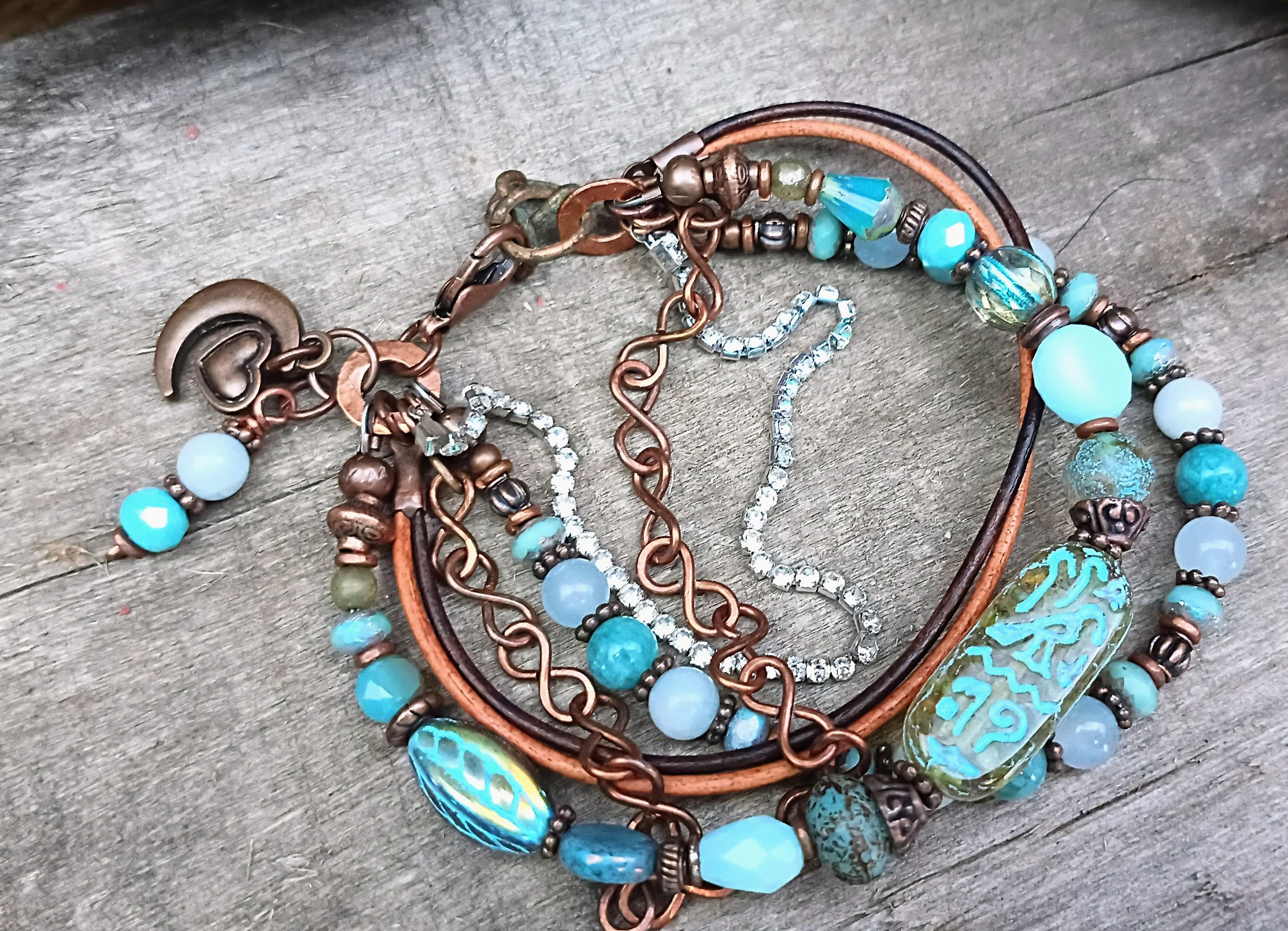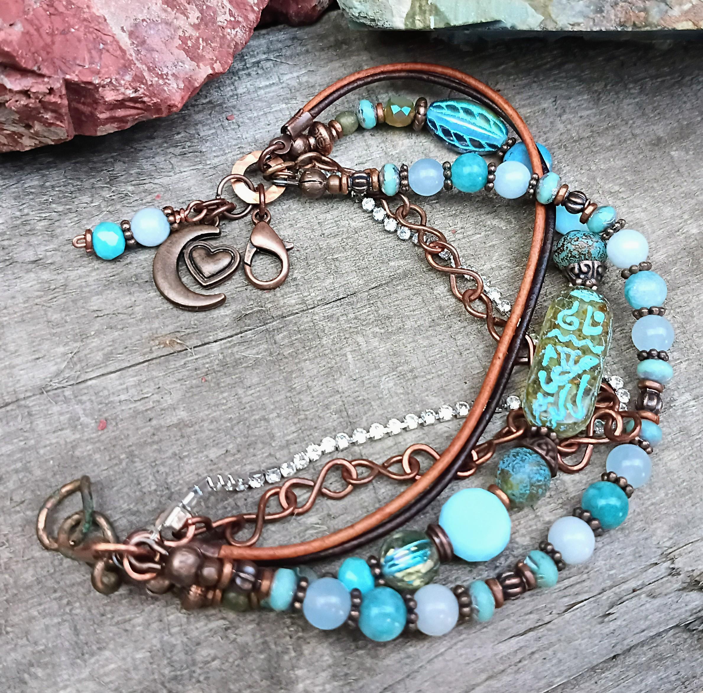 Beautiful Bohemian style bracelet, multi strand with a variety of Czech glass and gemstone beads. This bracelet is adjustable with a lobster claw close. Designed to fit - 7 1/2 to 8 1/2 inch wrist. Beaded on stainless steel beading wire with wire guards for added protection. Handmade copper chain that some oxidation. Copper metal spacers, beads and bead caps, 1.5mm leather strands, diamond rhinestone cup chain, Czech glass beads, glass facetted beads, 1 large Czech focal bead, light blue Chalcedony 6mm beads and mixed Jade beads. A great bracelet for summer or a beautiful gift for that special person!