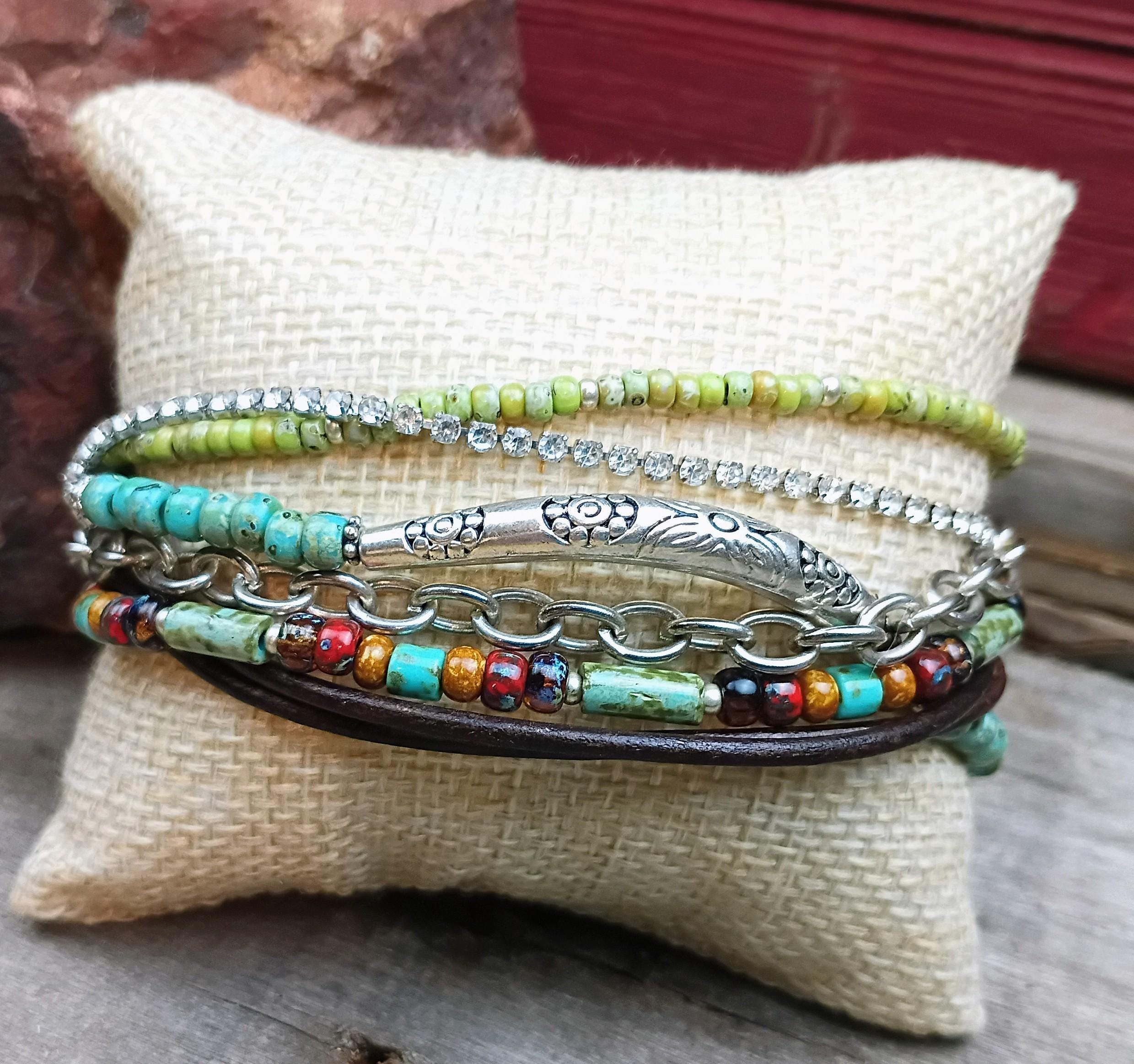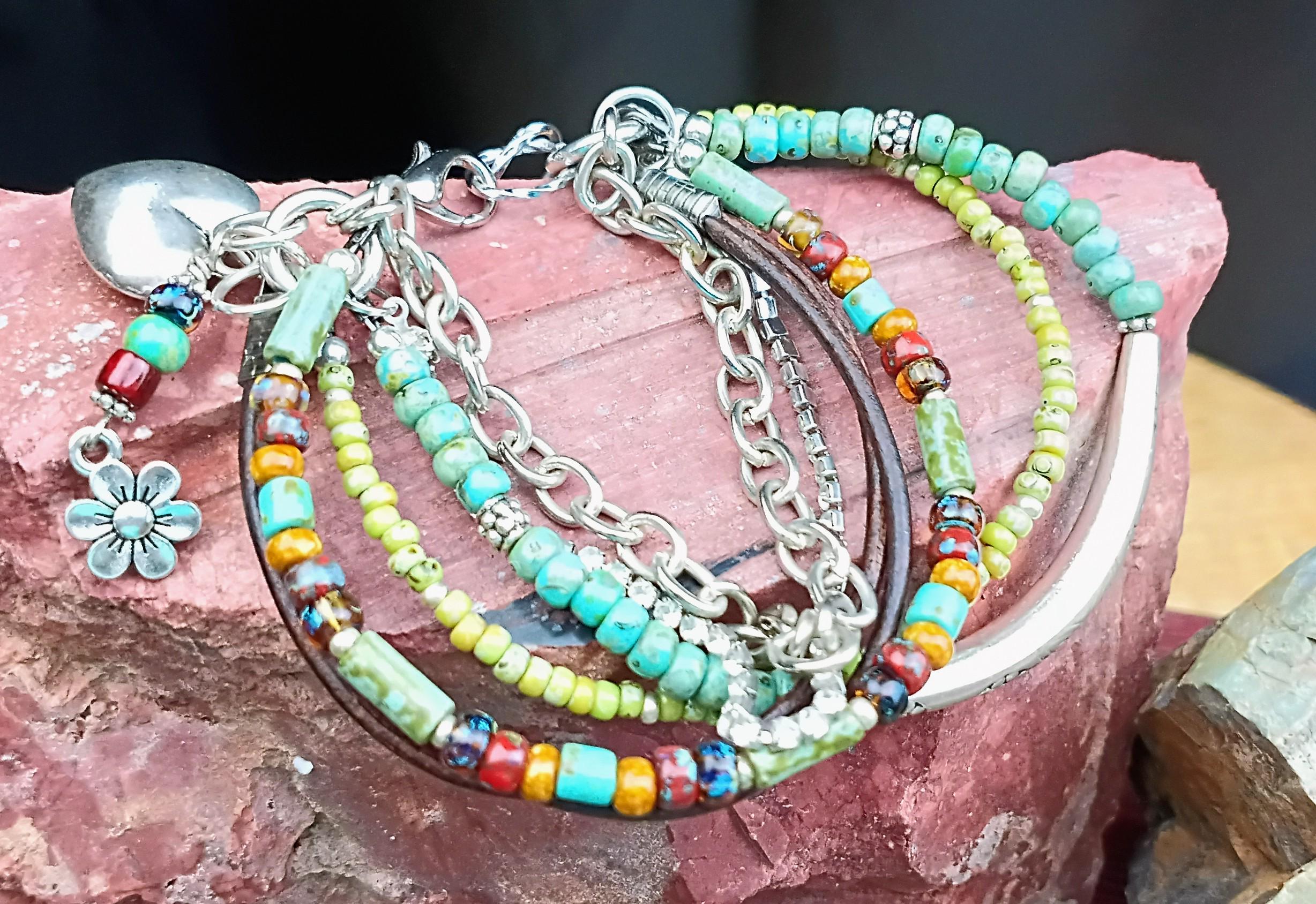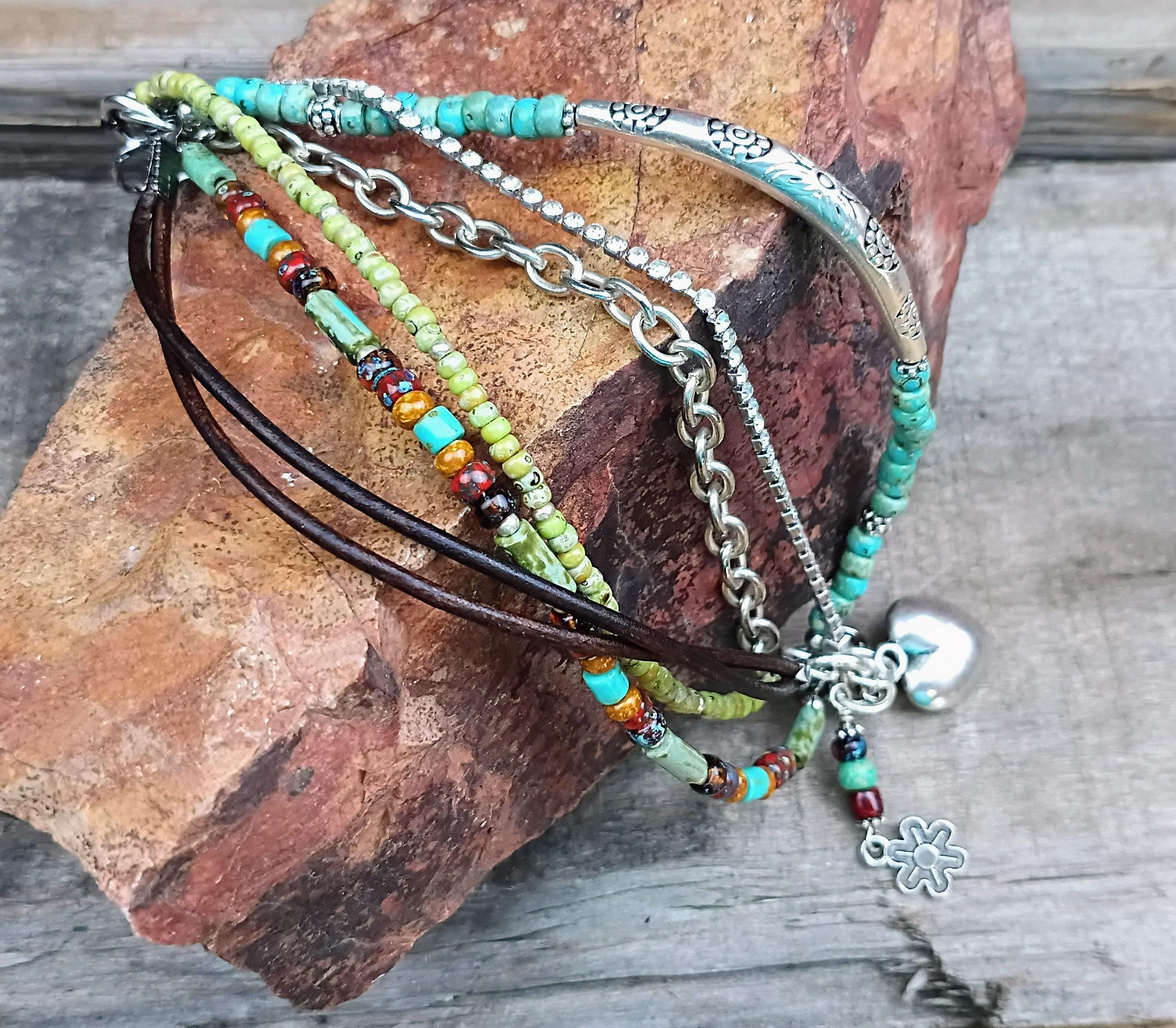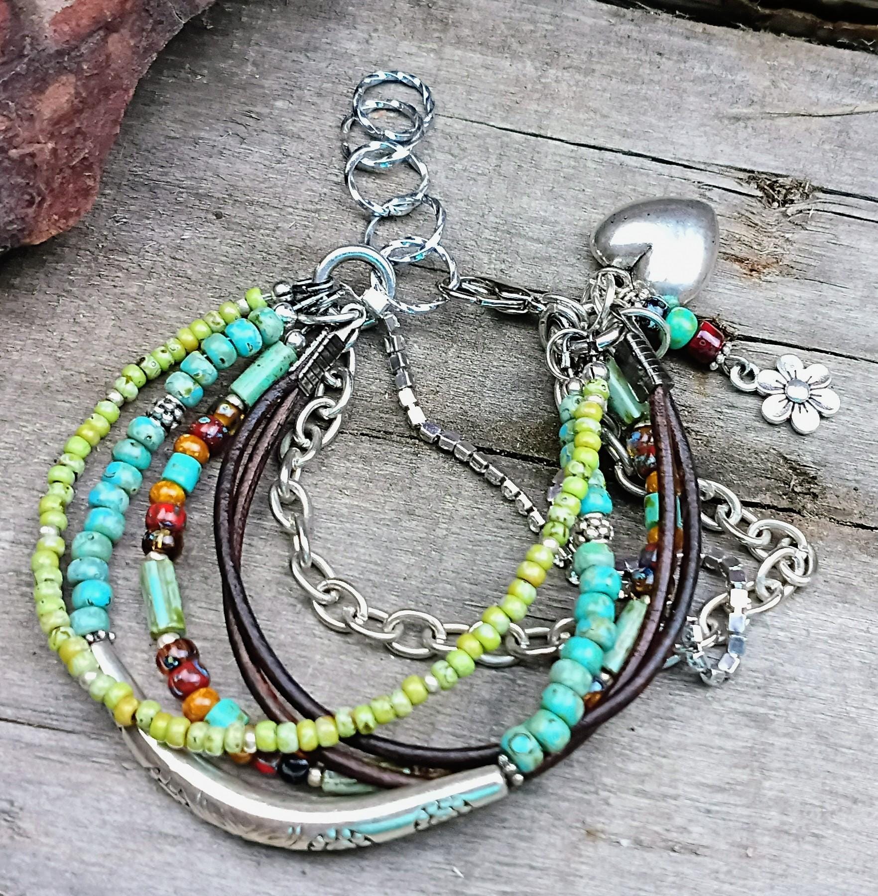 Rustic and beautiful Boho style multi strand beaded bracelet that features Picasso glass seed beads, 1.5mm leather strands, diamond rhinestone cup chain, silver plated metal chain, metal silver plated focal curved tube bead, silver seed bead spacers. All beaded on stainless steel beading wire with wire guards for added protection. 1 puffed heart & 1 flower silver charms on the end of the bracelet. Adjustable, designed to fit - 7 to 8 1/2 inch wrist with silver plated metal lobster claw close. A great bracelet for summer and beautiful gift for that special person!