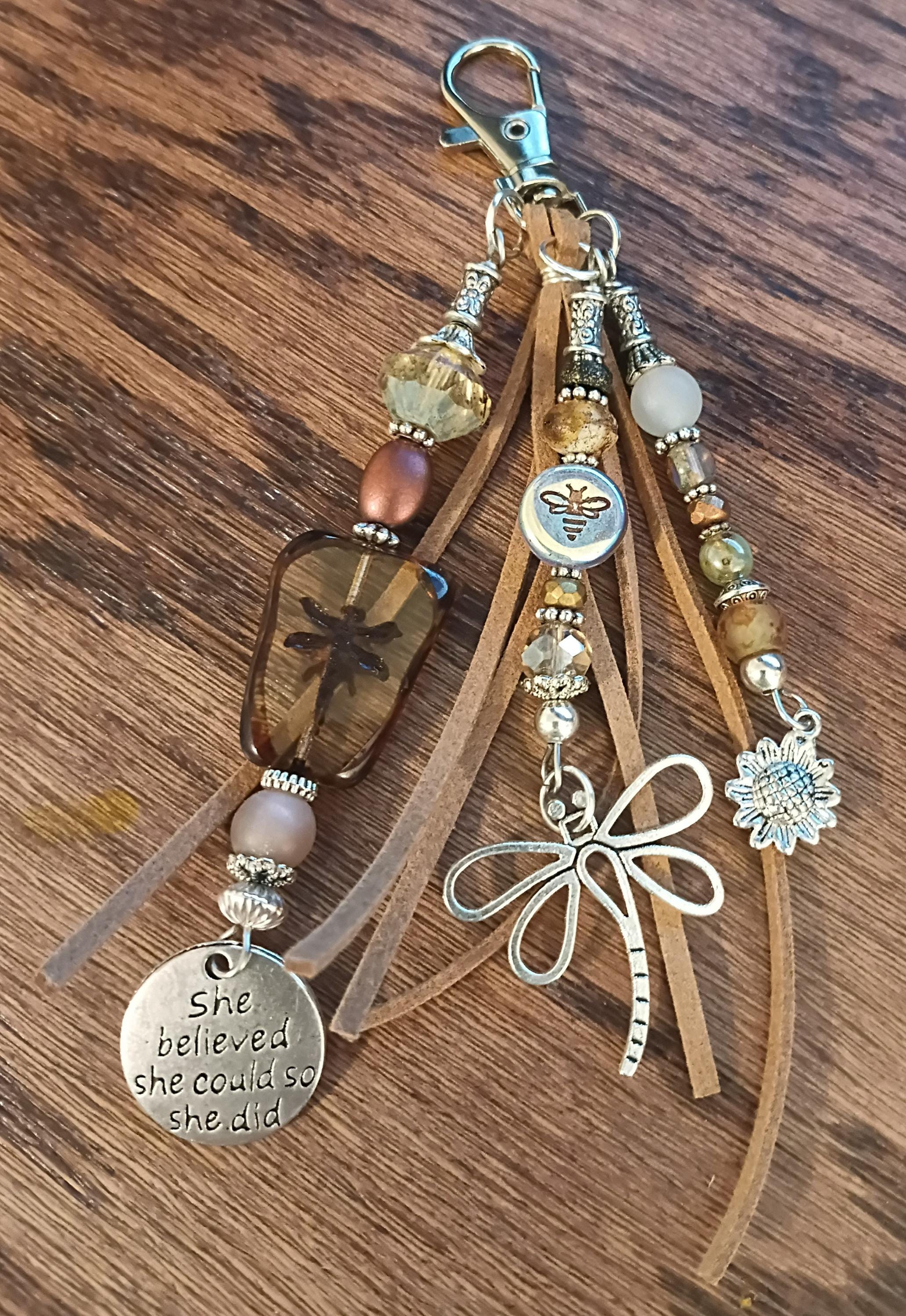 Beautiful beaded keychain zipper pull, I call them "purse bling". 5 inches long, light brown faux leather, silver plated metal spacers, a variety of beautiful Czech glass beads with silver charms. Add to you favorite bag, purse or backpack!