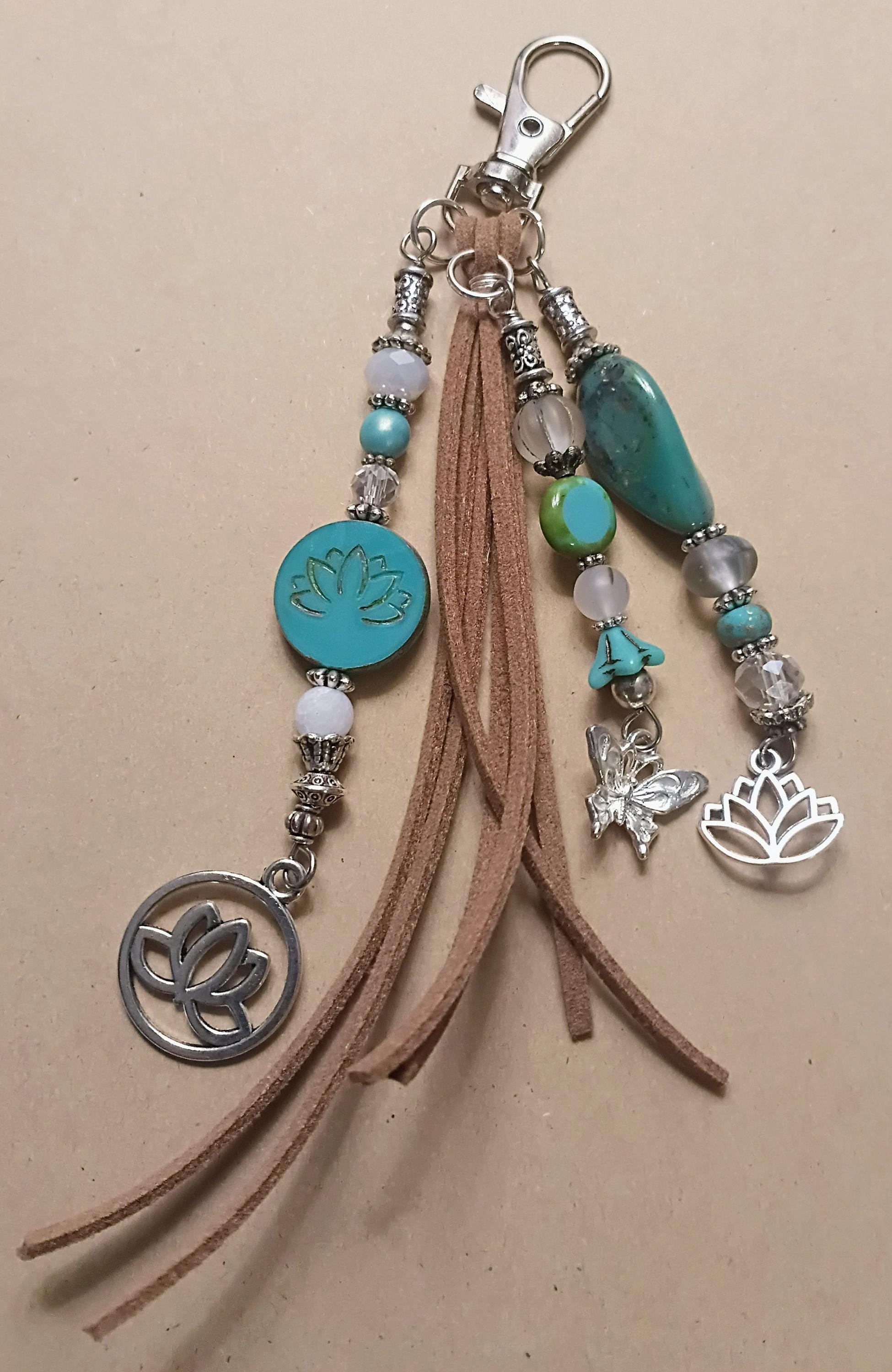 Beautiful beaded keychain zipper pull with beautiful Czech glass beads and silver plated spacers and charms. Beaded on silver wire, light brown faux leather. 5 inches long. A great addition to add to your favorite bag, purse or backpack!