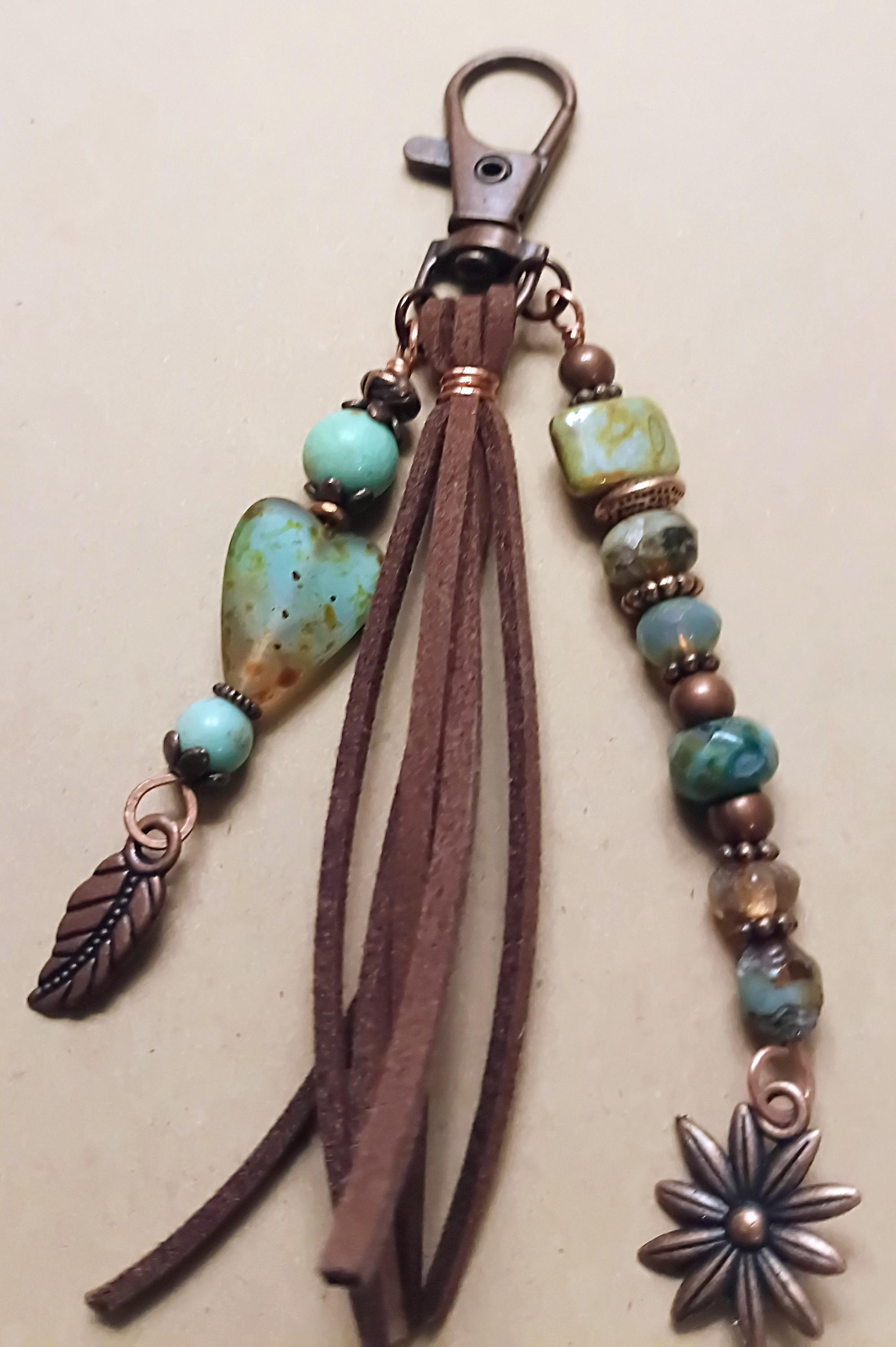 Beautiful, earthy and rustic beaded keychain zipper pull. Beaded with Czech glass beads with Picasso finish, copper metal spacers and charms. Brown faux leather. 5 inches long. A great addition to your favorite bag, purse or backpack!