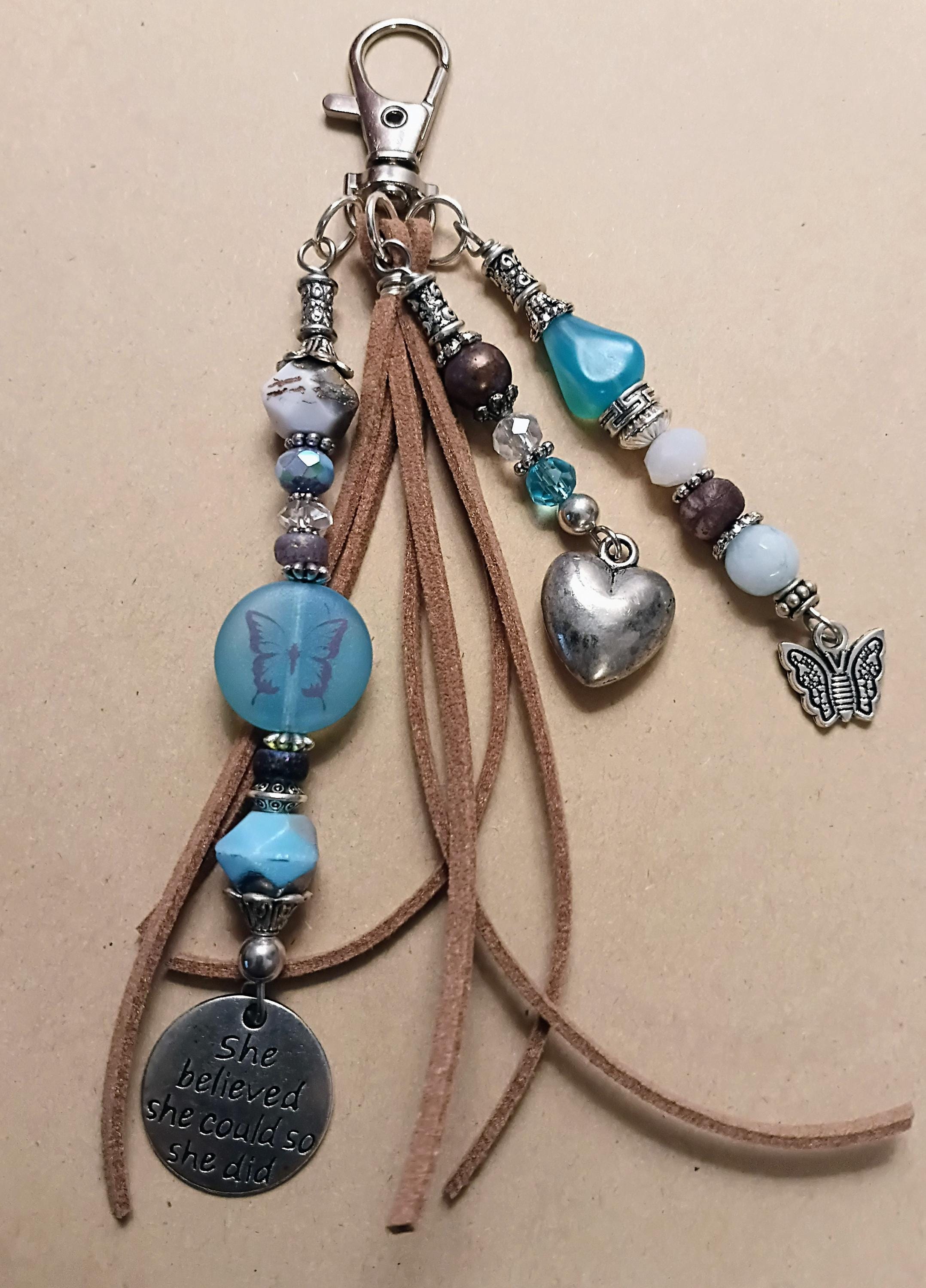 Beautiful keychain zipper pull with Czech glass beads, silver plated metal spacers, silver plated metal charms, light brown faux leather. Beaded on silver wire. Approx length is 5 1/2 inches y. Add to your favorite bag, purse or backpack!