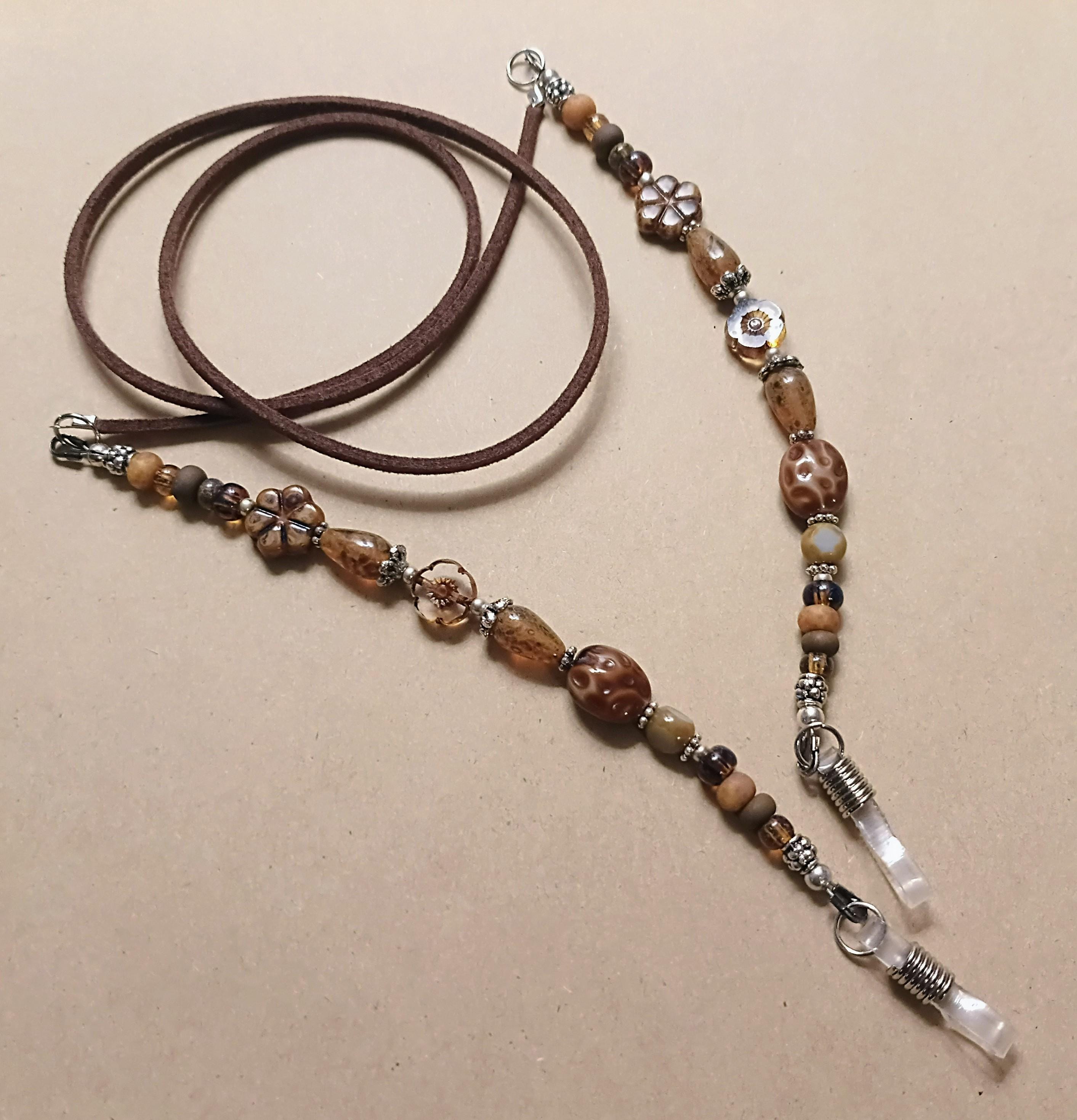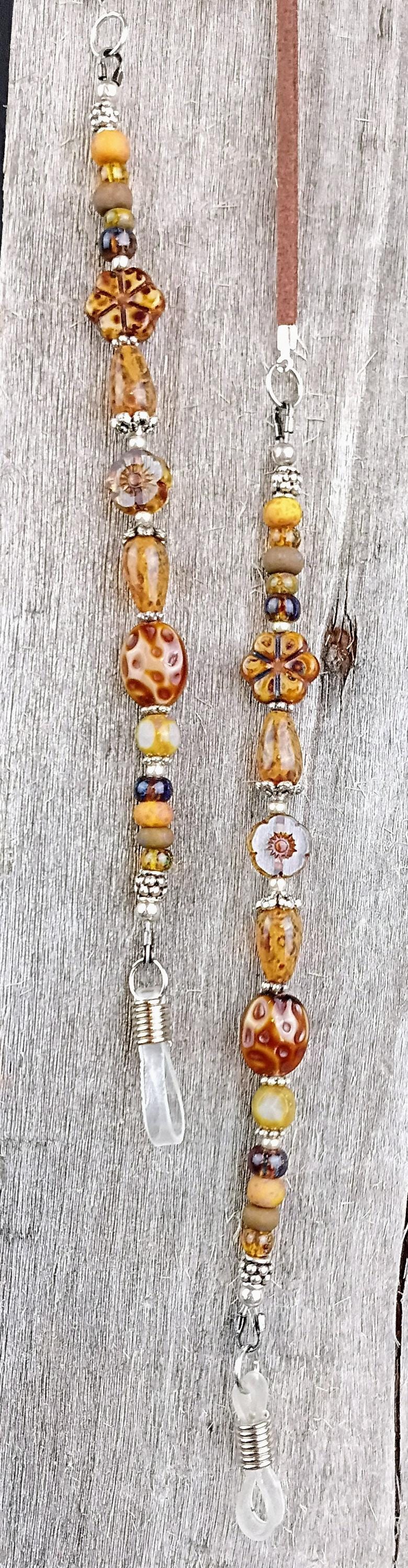 Beautiful beaded eyeglasses Necklace holder. Never loose them again! Beaded with a variety of Czech glass beads with Picasso finish, Picasso glass seed beads, silver plated metal spacers and bead caps. Beaded on brown faux leather connected by open jump rings that lead to the beard part. Beads are strung on stainless steel beading wire with wire guards for added protection. Clear and silver rubber eyeglass holders. This necklace is approx 14 inches long. Comfortable & a stylish way to hold your glasses when you are not wearing them!