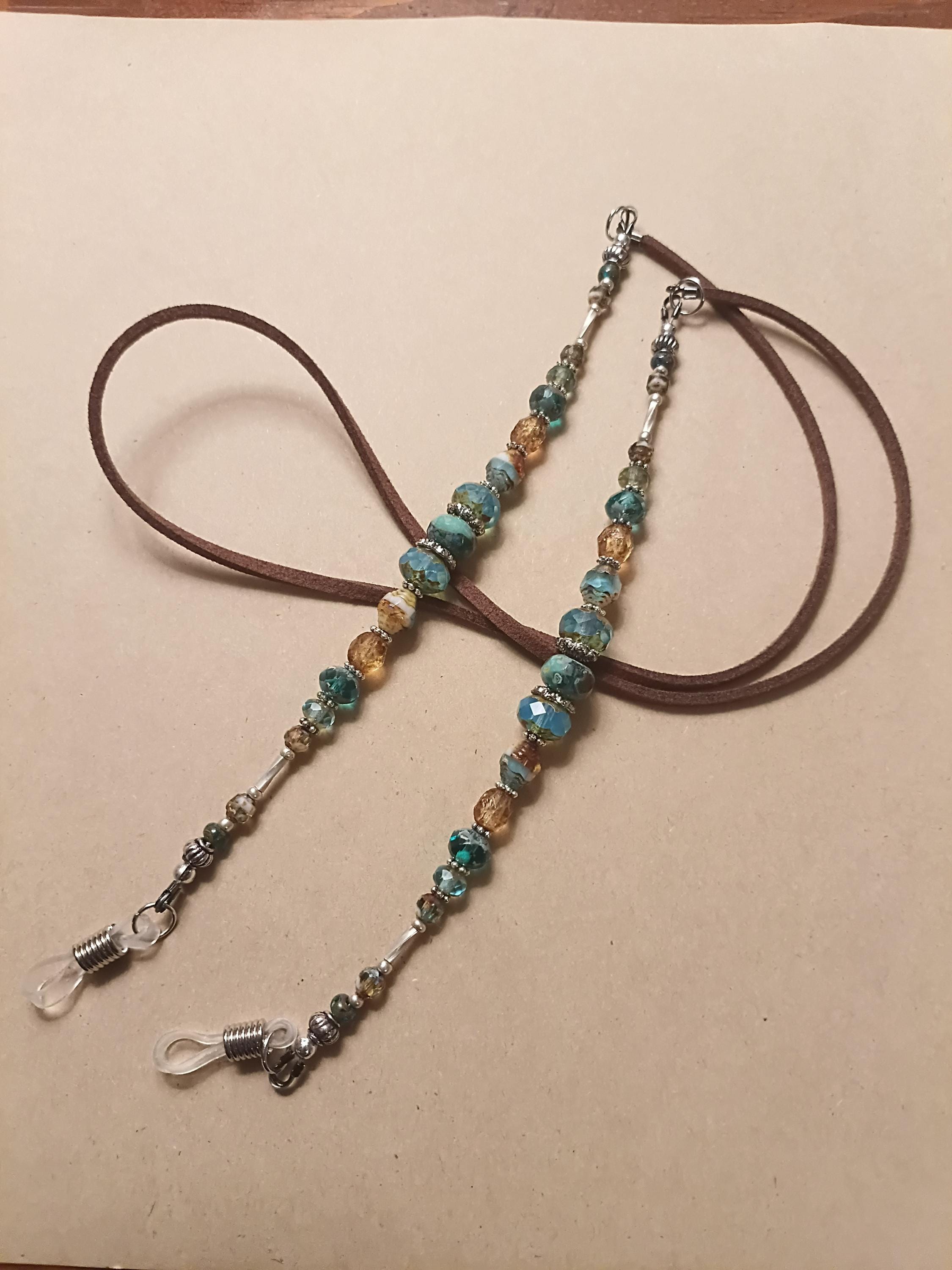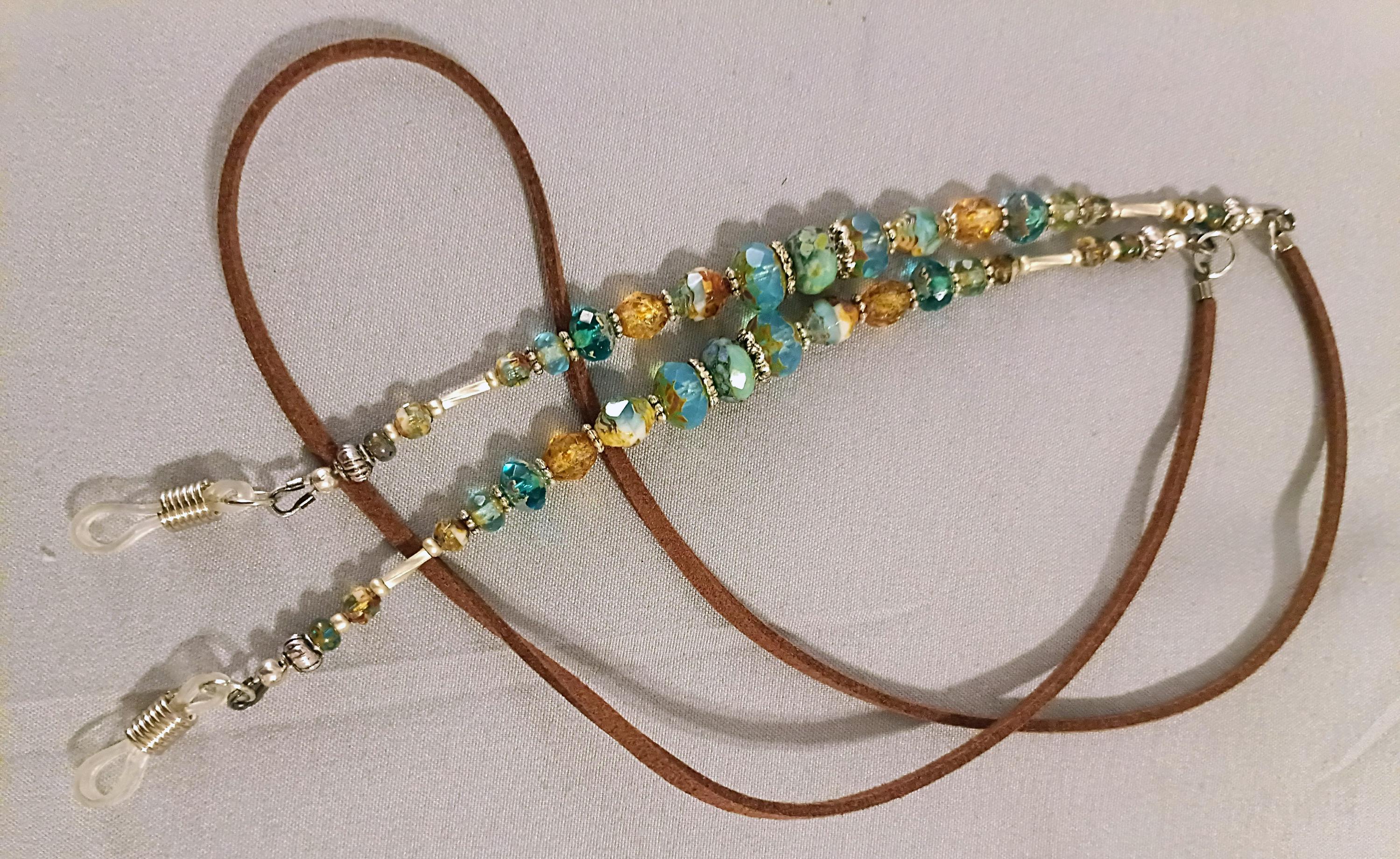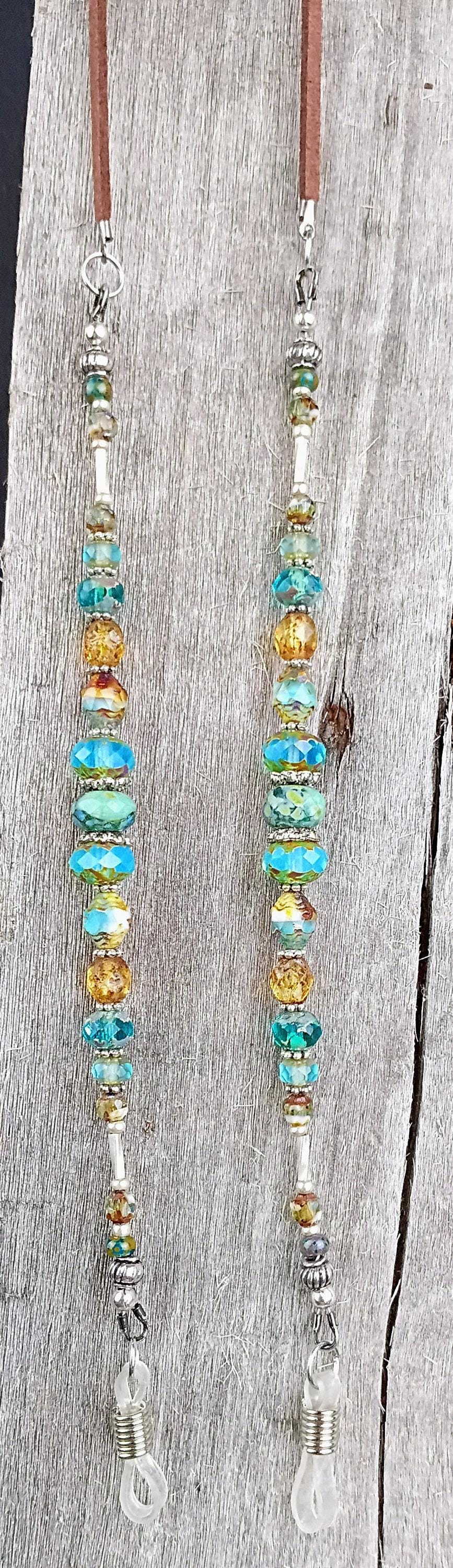 Beautiful Aqua, beach theme eyeglasses holder necklace. Beaded with a variety of Czech glass beads, Picasso finish, silver plated metal spacers on stainless steel beading wire with wire guards for added protection. Attached to brown faux leather with open jump rings. 15 inches long with clear rubber eyeglasses holder's. A great way to hold onto your glasses when you are not wearing them! A great gift for that special person!