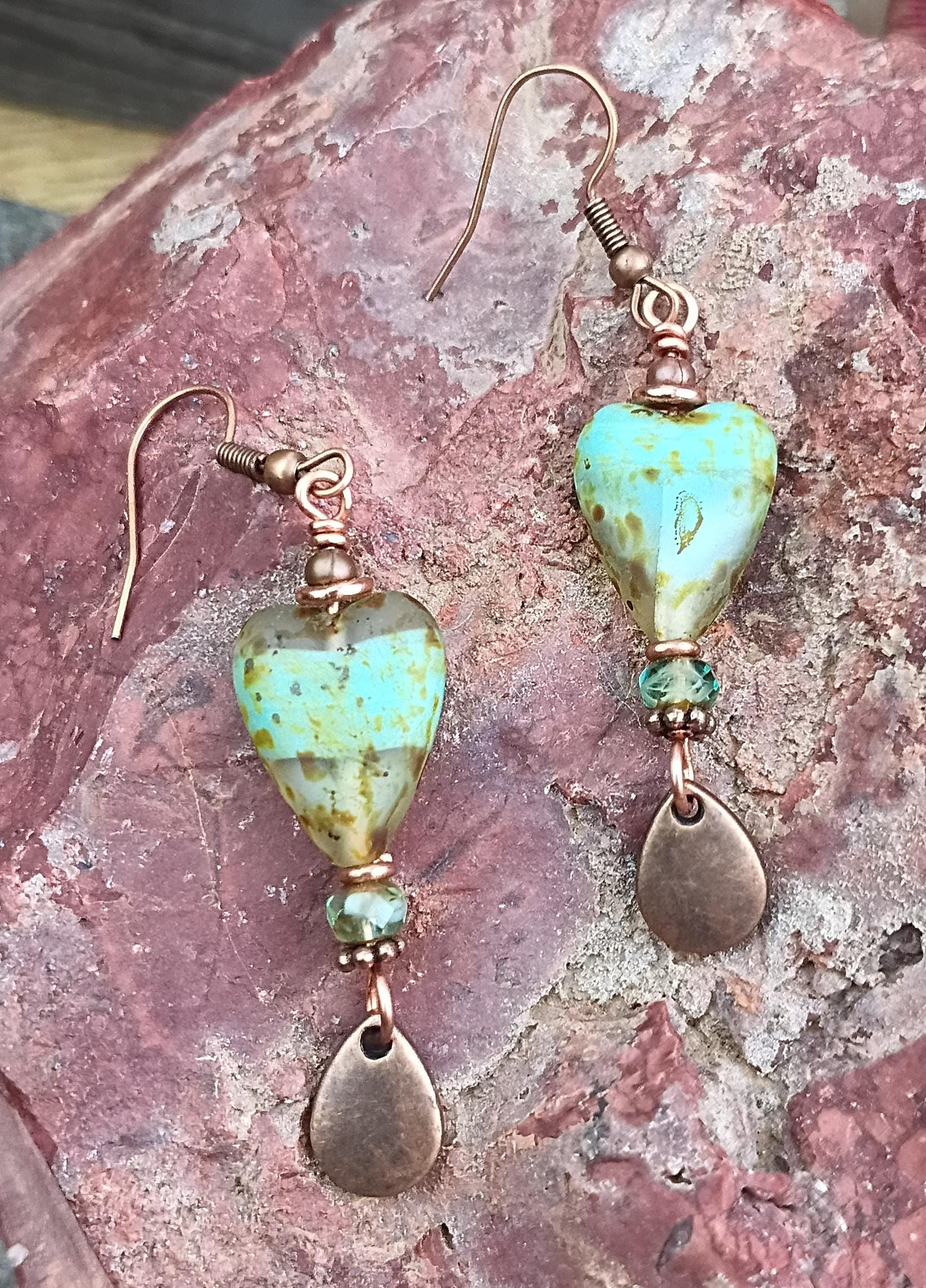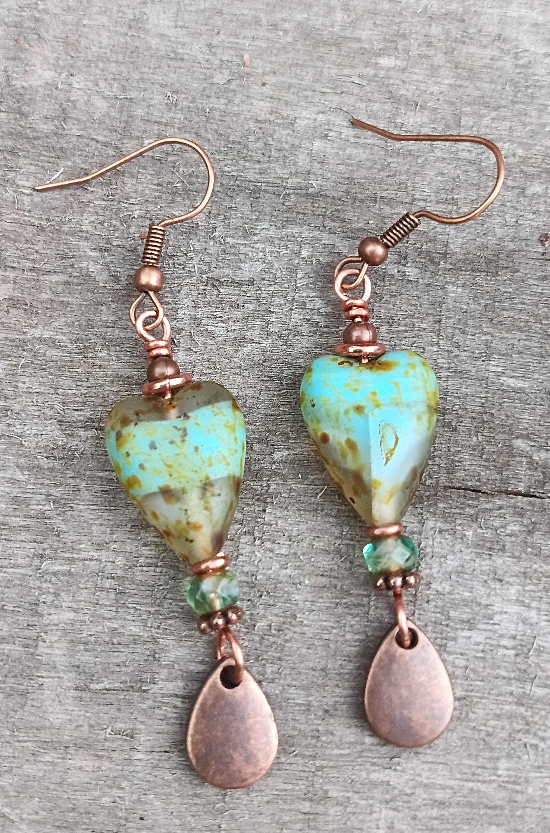 Beautiful Czech heart shape glass earrings with Czech glass rondels, copper spacers beaded on copper wire with Hypoallergenic Copper ear wires. Czech glass hearts are 13mm by 16mm. Just over 2 inches long with the metal copper teardrop dangle. Beautiful Picasso finish, give these earrings a rustic earthy look. A great pair of earrings for the summer and a perfect gift for that special person!