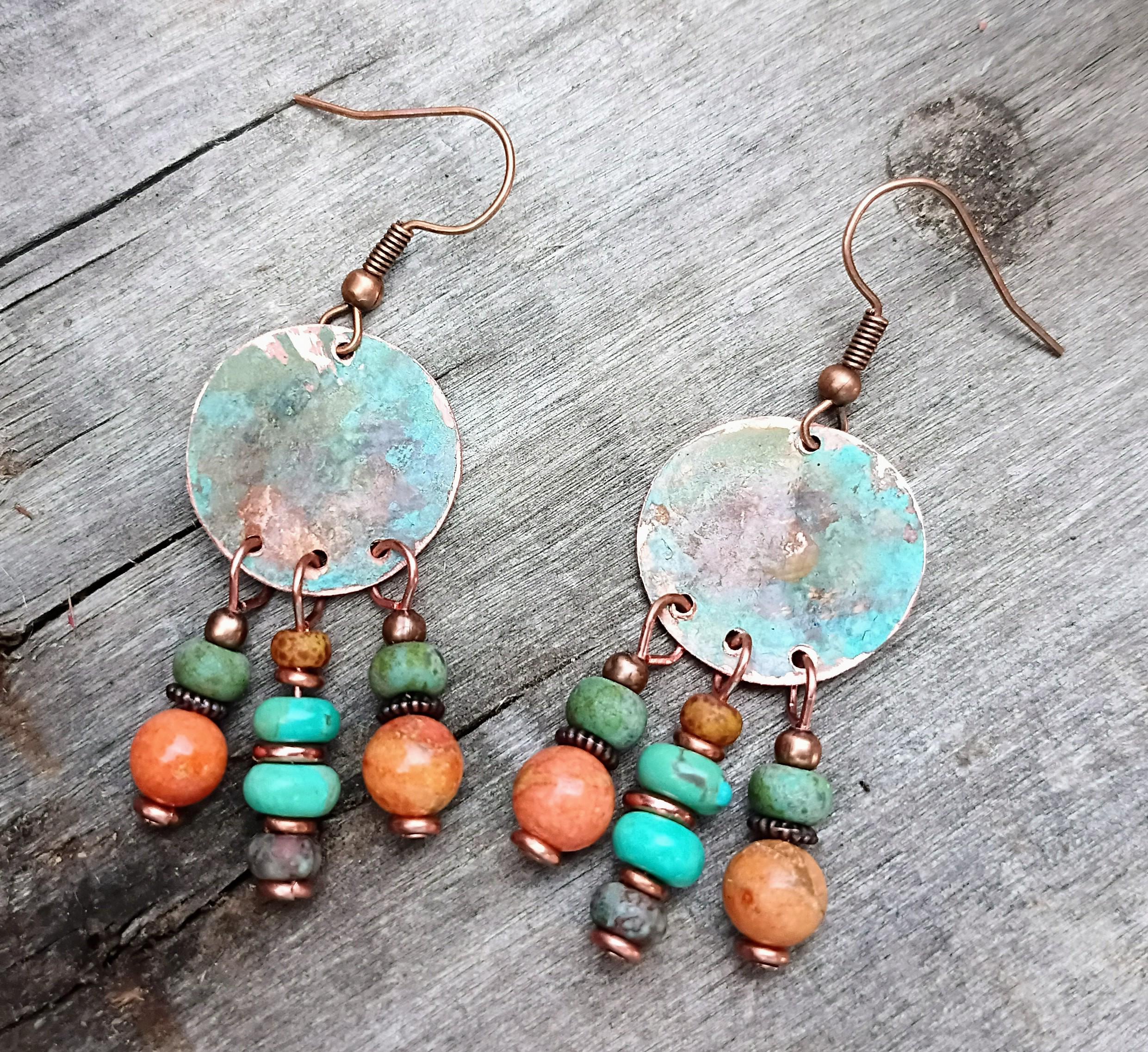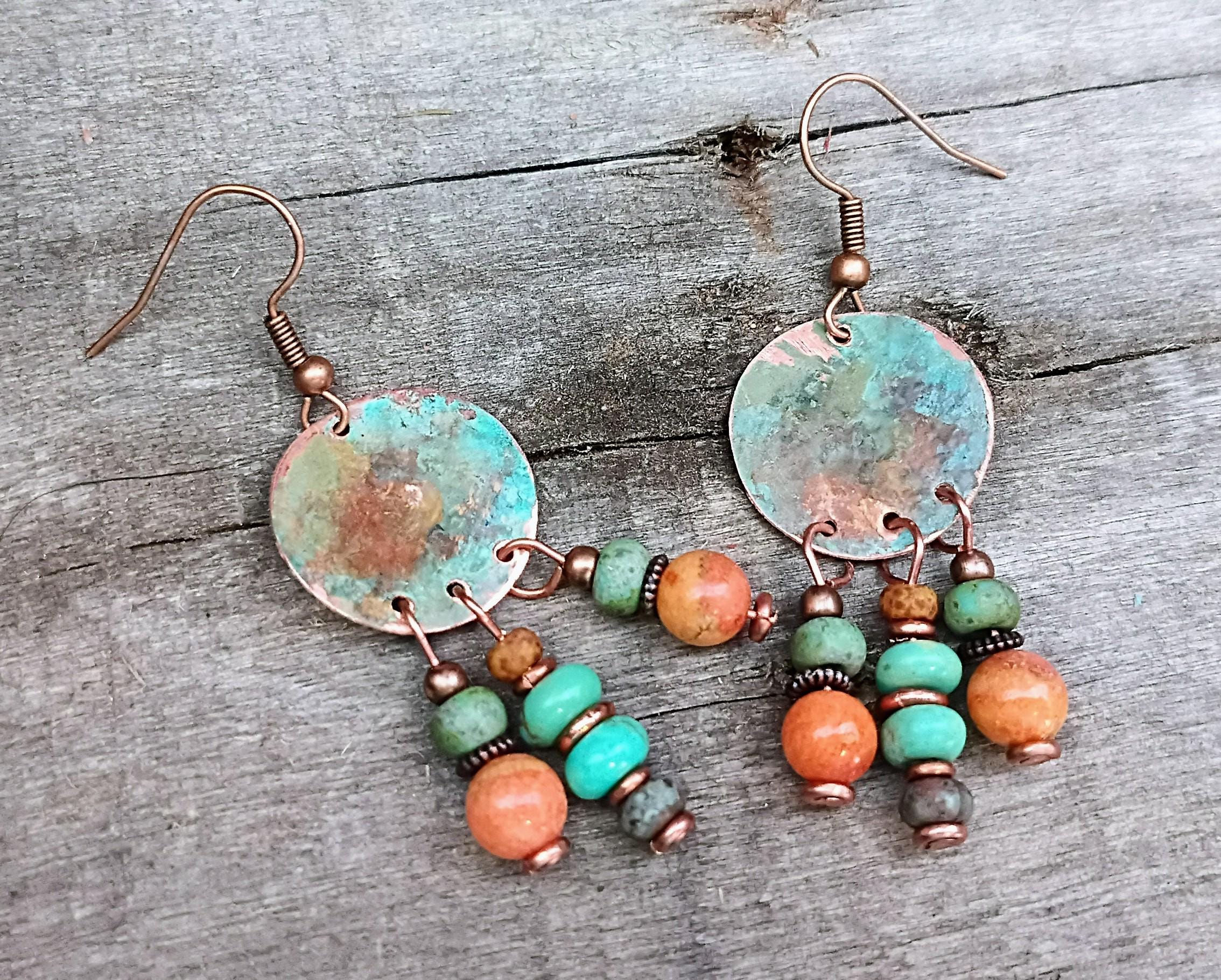 Rustic, earthy and beautiful copper coin earrings. Patina Copper coin's with Hypoallergenic Copper ear wires. Genuine Kingman Turquoise beads, Apple Coral beads, Picasso glass beads with copper spacers.