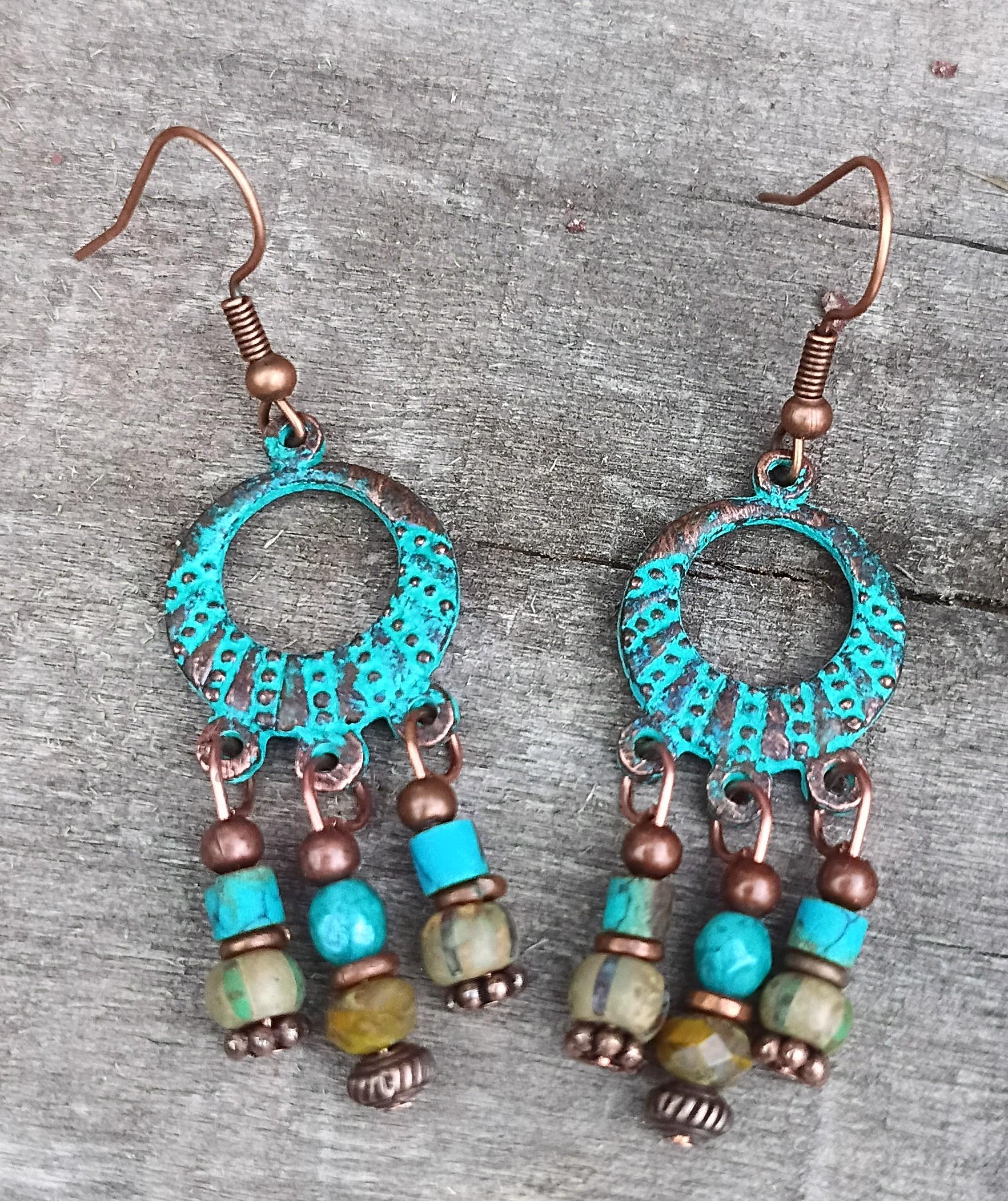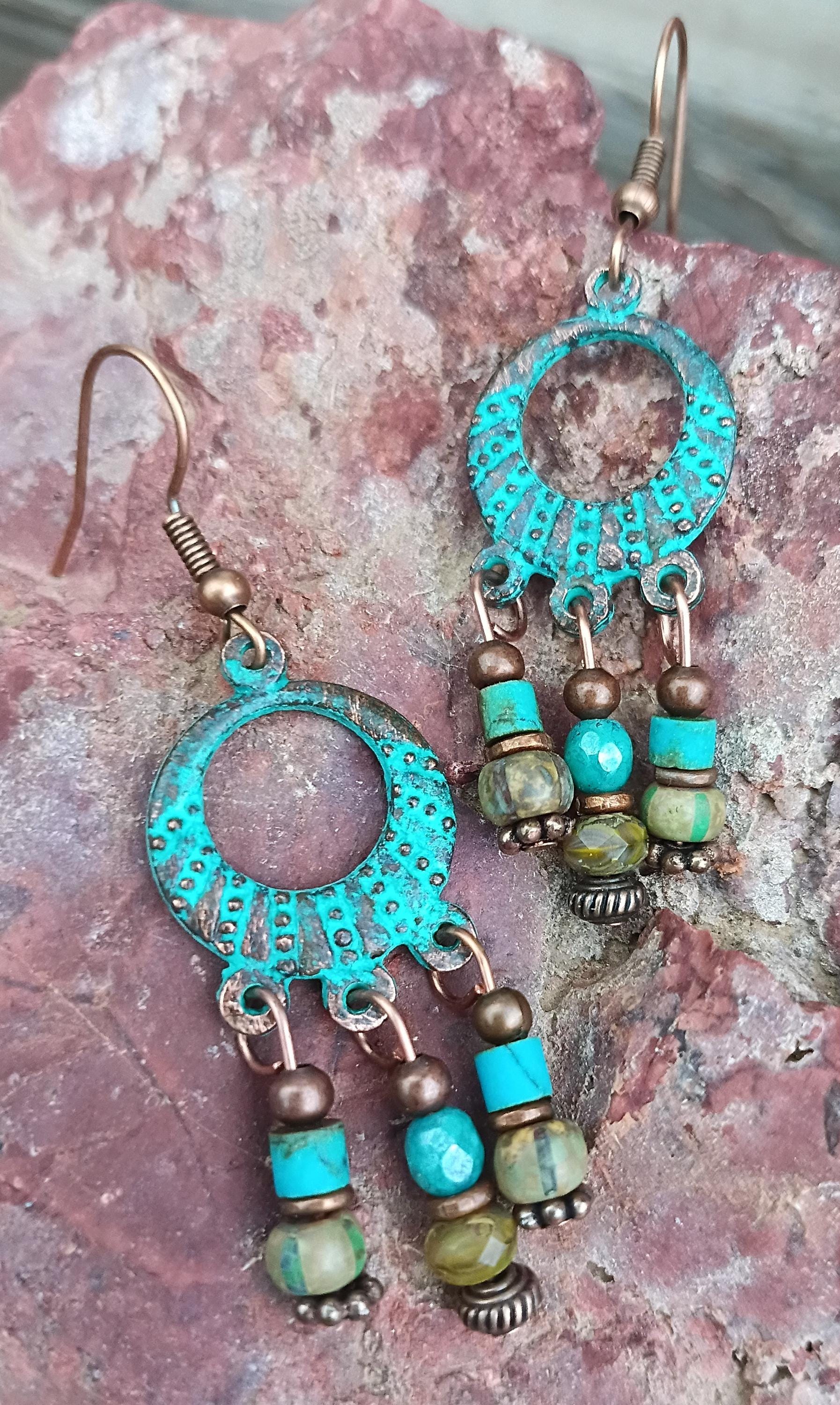 Beautiful and rustic Bohemian style beaded earrings. Greek Mykonos with green patina (clear coated for protection). Czech Glass 4mm faceted beads along with Picasso finish glass seed beads. Copper metal spacers. Beaded on copper wire with Hypoallergenic Copper ear wires. Approx 2 inches long.