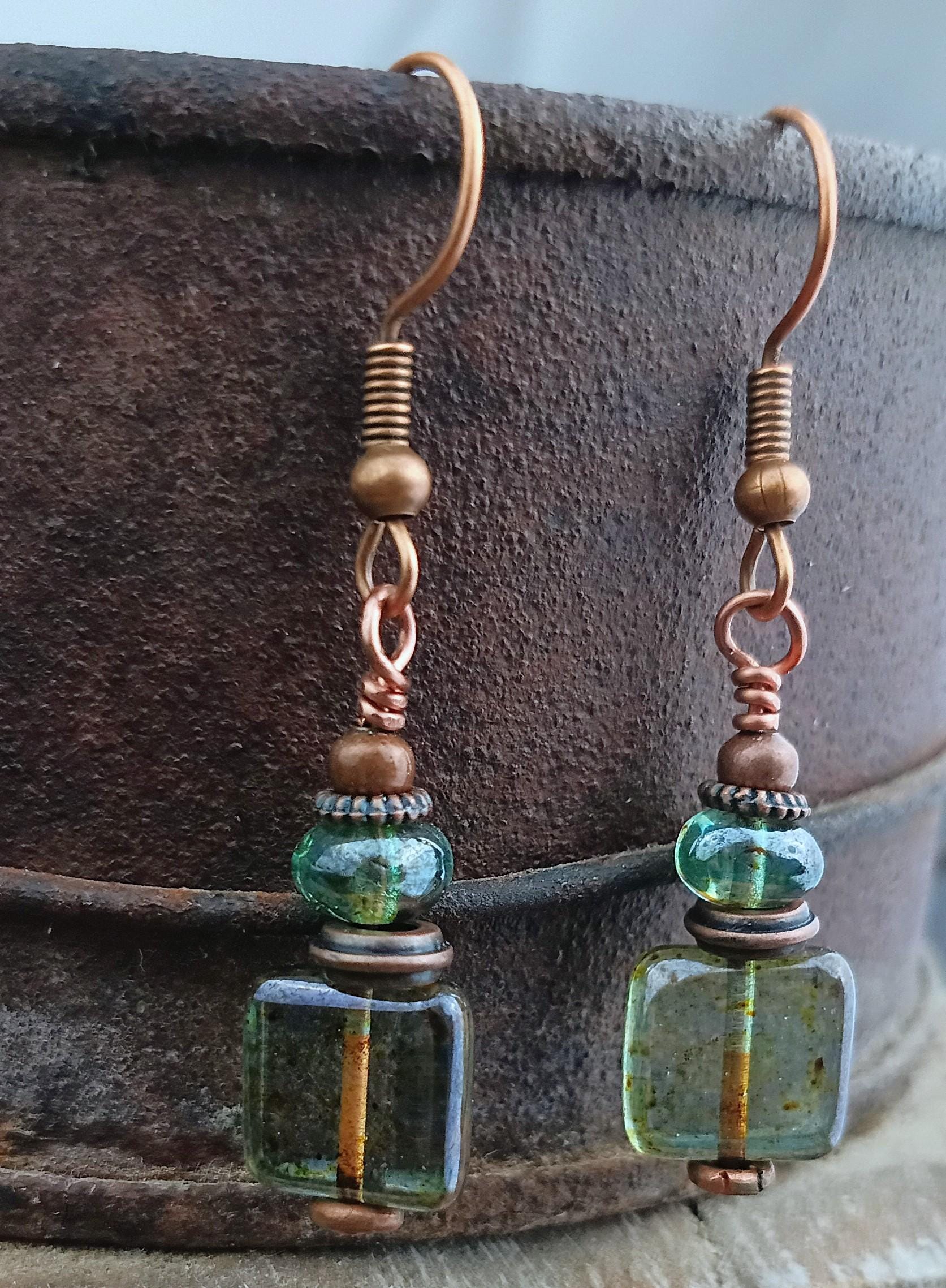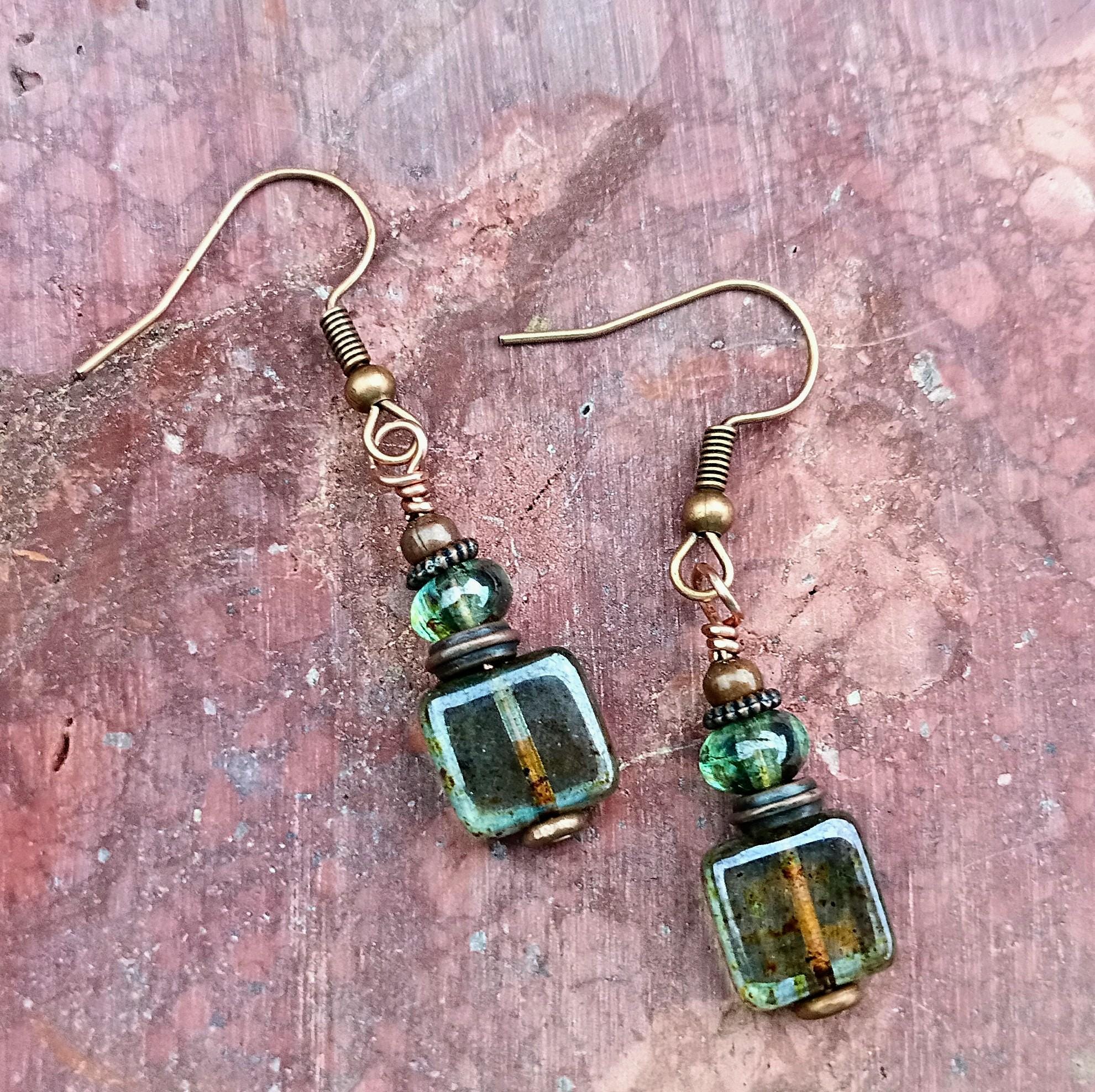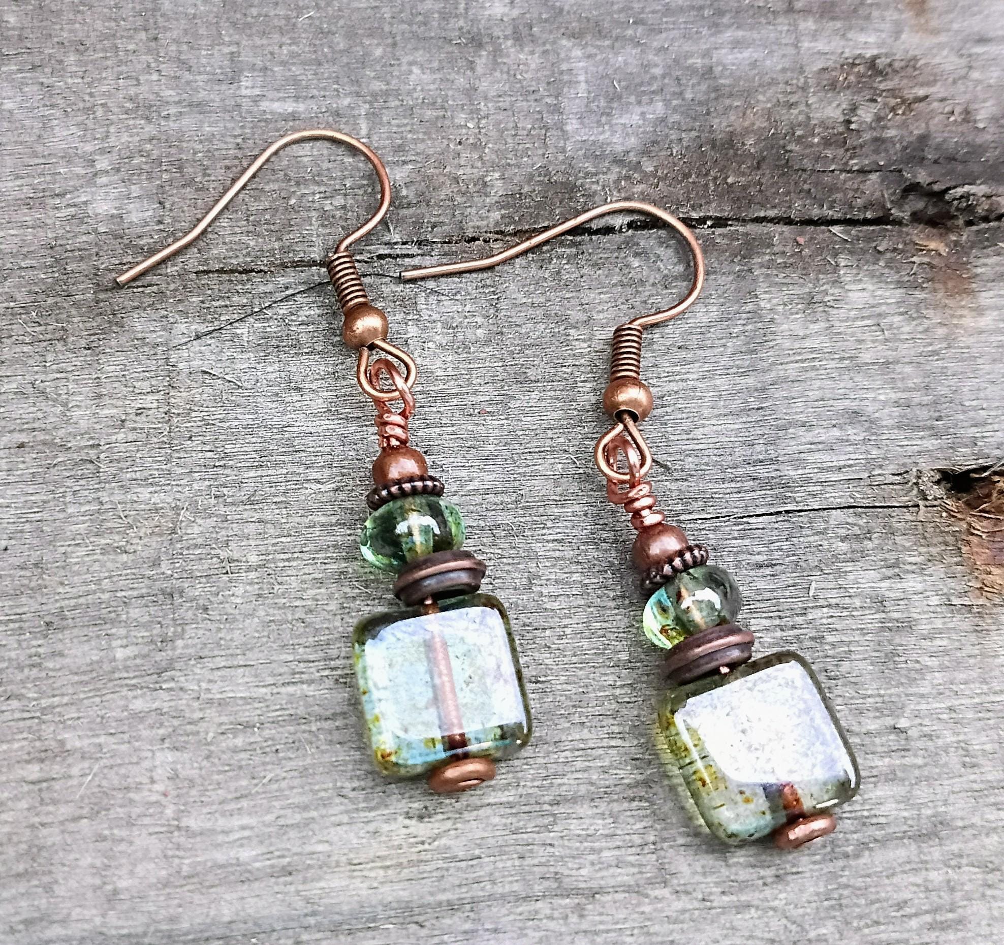 Earthy and pretty dainty dangle Czech glass earrings. Earthy pine square that are 9mm, paired with Lumi Green Potato Czech glass beads, copper spacers and copper hypoallergenic ear wires. Approx 1 1/2 inches long. Perfect light weight earrings for the summer!