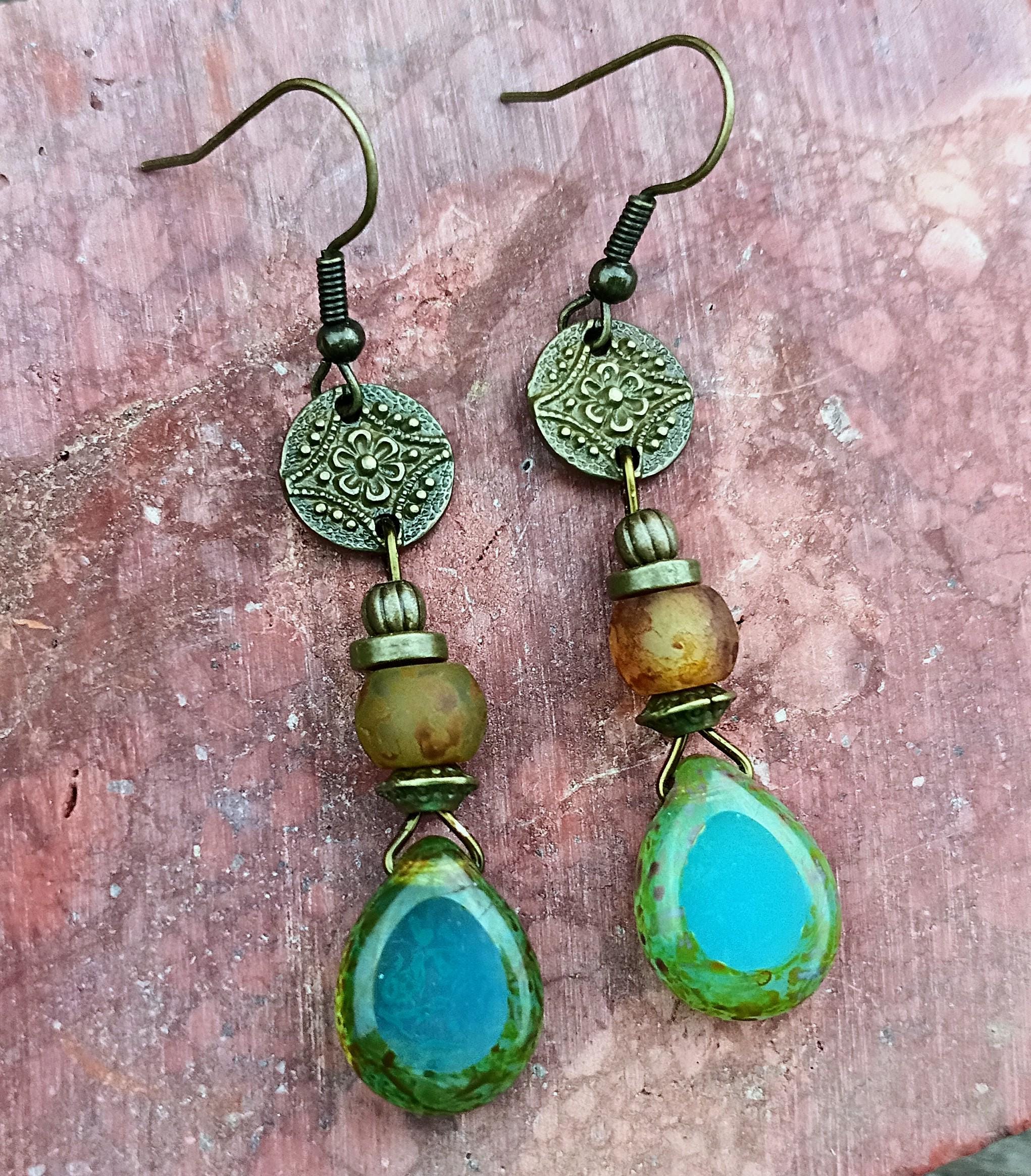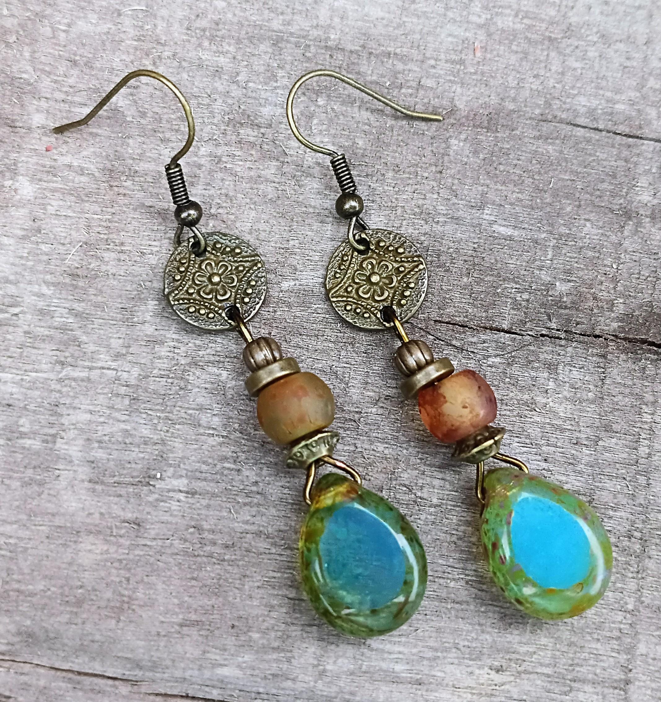 Beautiful table cut window pear drop Briolette Czech glass Beaded Earrings, Milky Aqua with Picasso finish 12 x 15mm. Paired with Czech glass 6mm rustic amber color bead, bronze metal spacers beads, beaded on antique brass wire with bronze ear wires. Bronze Flower Coin Charm, smaller than a dime in size. Approx 2 1/2 inches long. Earthy and Rustic Boho style earrings, sure to compliment any outfit! A perfect gift for that special person!