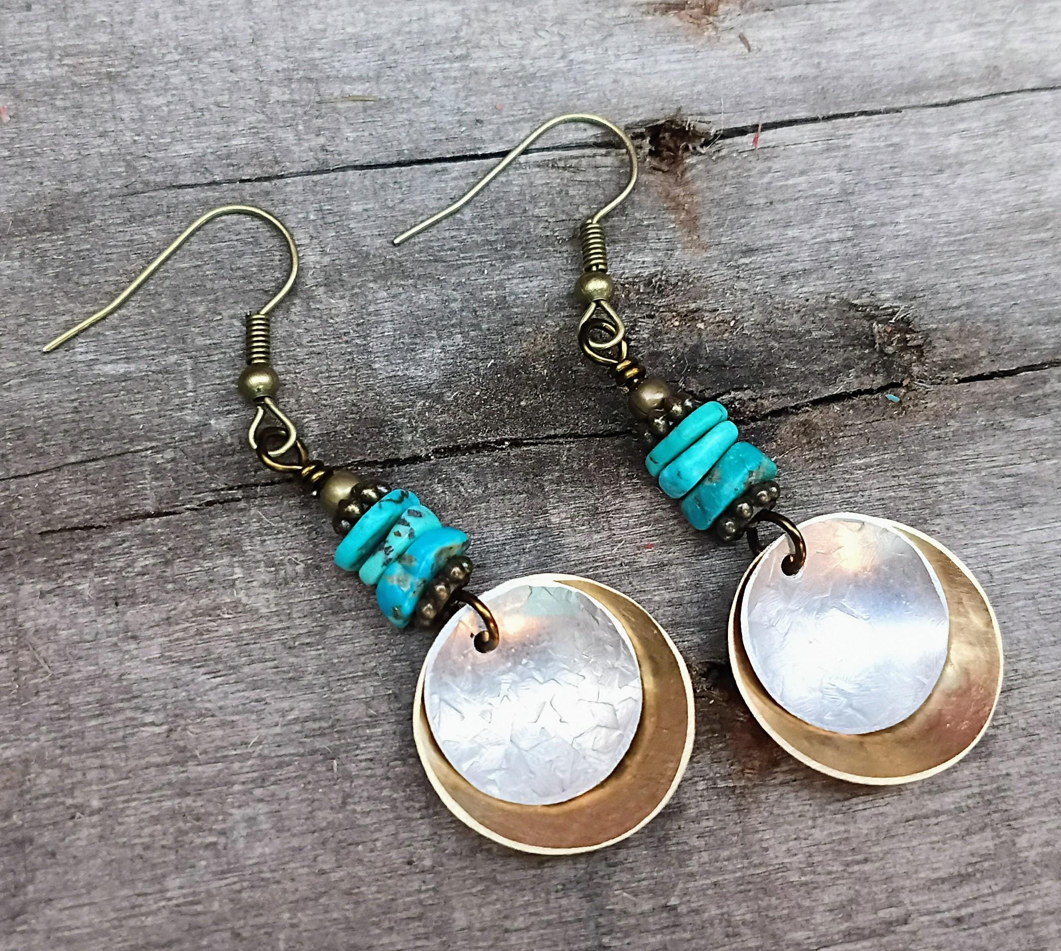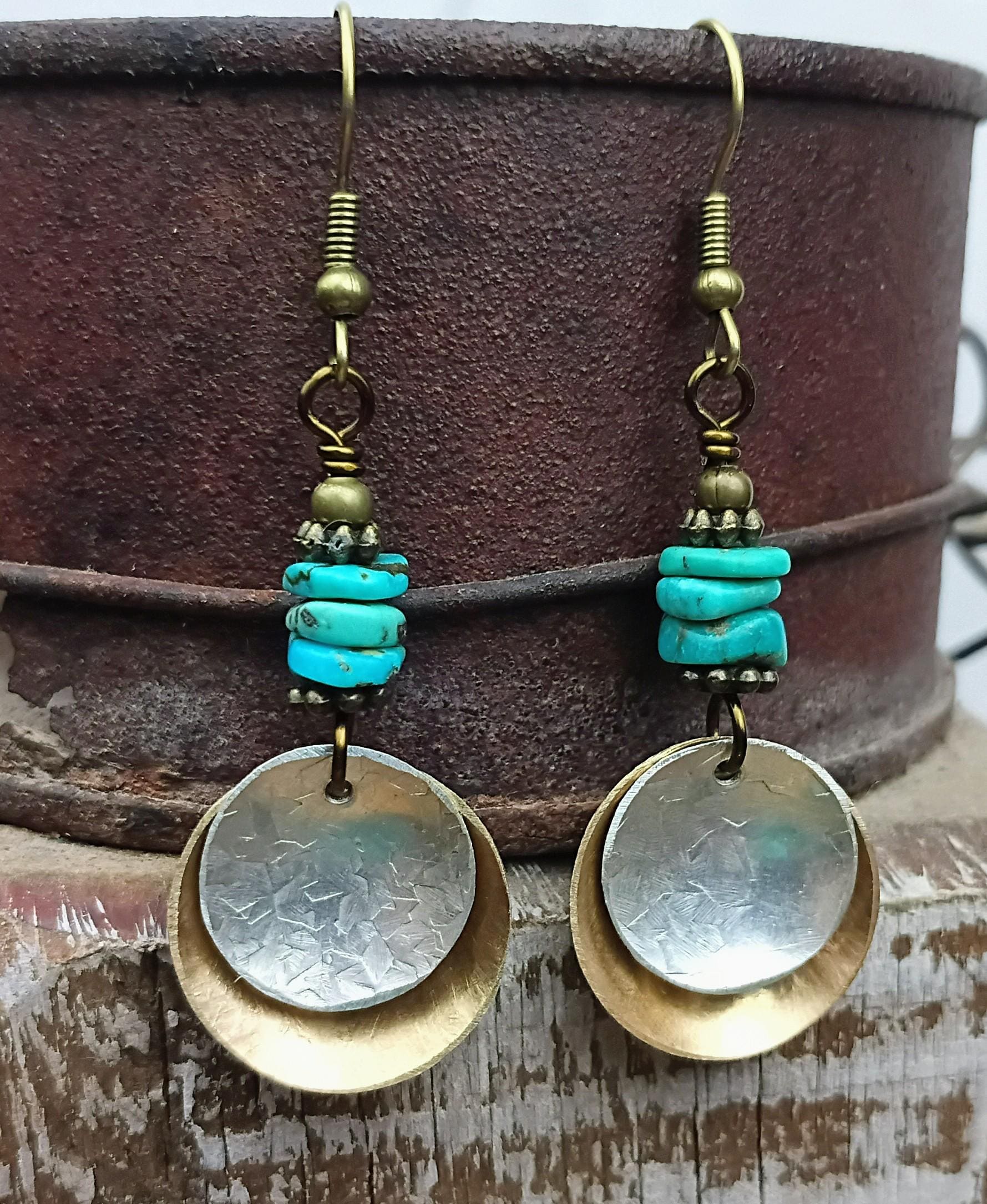Simple and beautiful, hand cut and hammered coin earrings with genuine turquoise beads. Hypoallergenic ear wires. 2 inches long, brass coin is about the size of a nickel the sterling silver coin about the size of a dime. Beaded on antique brass wire with antique brass/bronze metal spacers. Turquoise beads are irregular shape and widths. Beautiful pair of earrings for the summer or a great gift for that special person!