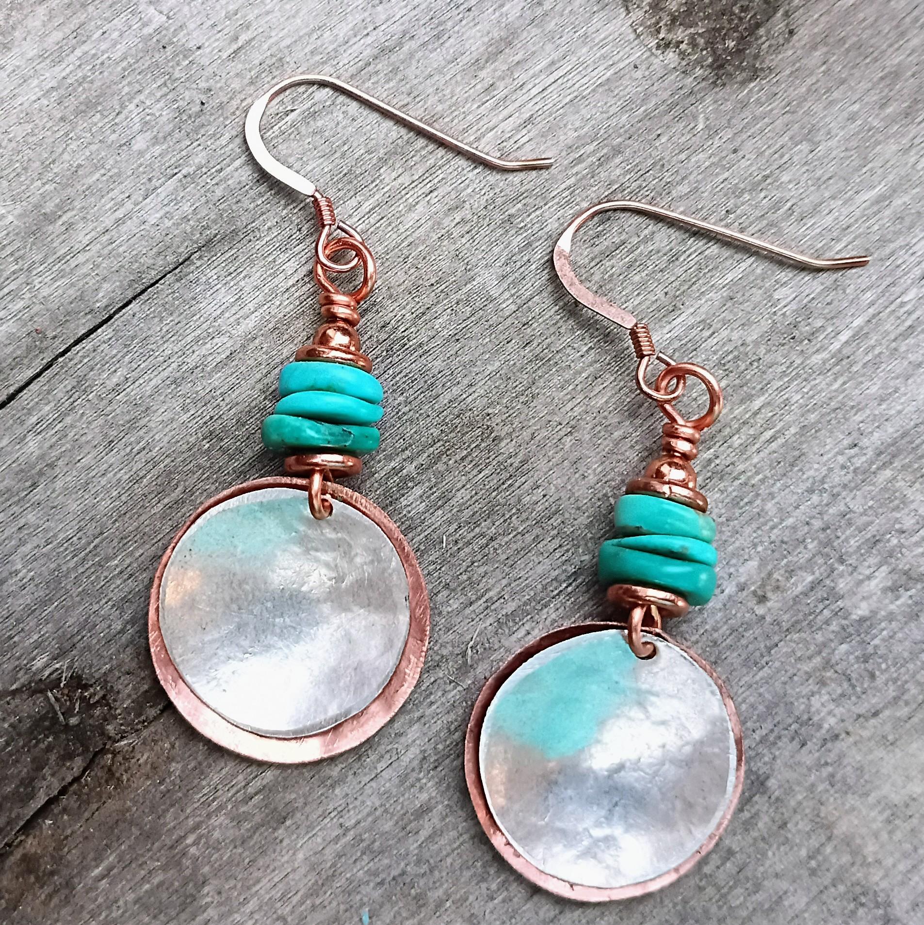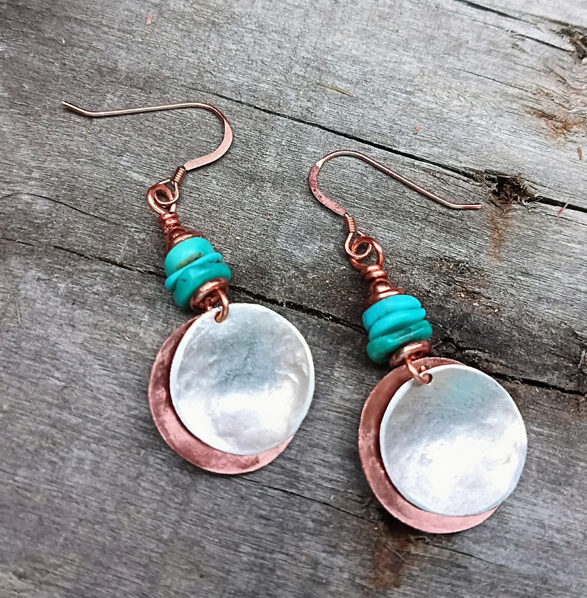 Beautiful, simple Turquoise Copper and Sterling Silver Coin Earrings. Genuine Turquoise beads... Irregular shape and widths with copper spacers, beaded on copper wire. Copper ear wires, hand cut and hammered copper coin. Copper coin is about the size of a nickel. Hand cut and hammered sterling silver coin... Dime in size. Perfect summer earrings!
