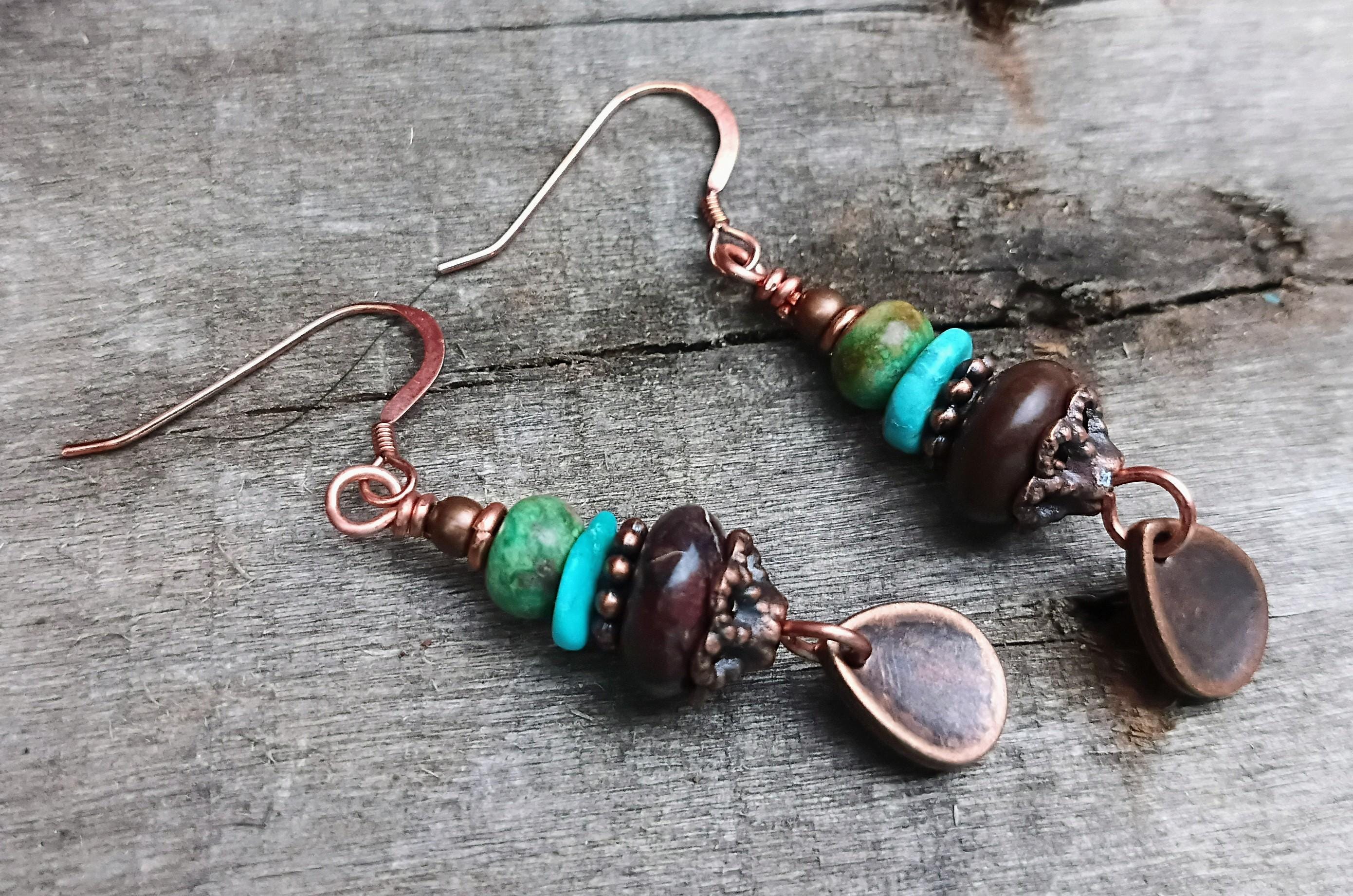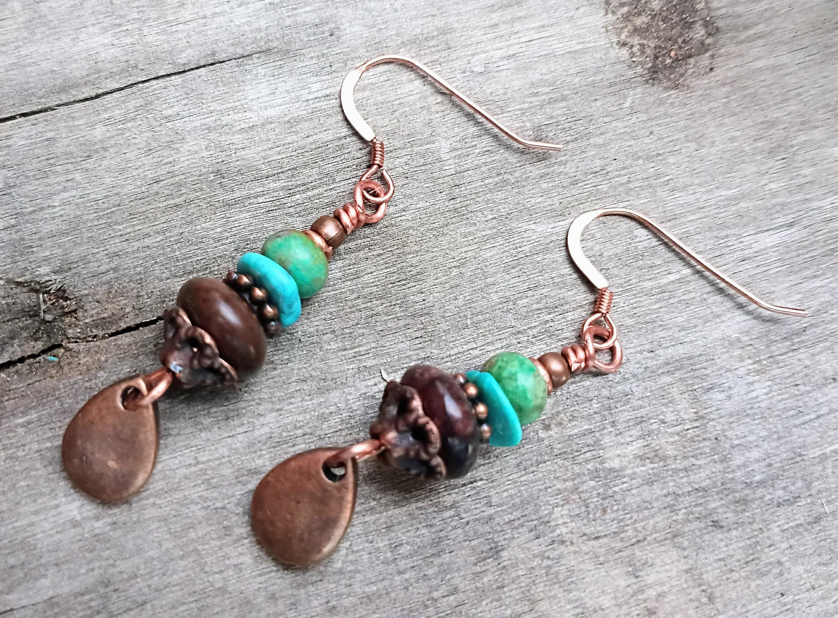 Rustic and Earthy Turquoise and Botswana Copper earrings, beaded on copper wire with copper ear wires, copper spacers. Kingman Turquoise beads, irregular shape and widths. Botswana rondels style beads are a dark plum to a dark burgundy in color with light matrix. Copper bead caps. Approx 2 inches long with the copper teardrop dangle. Great earrings for the summer and a great gift for that special person!