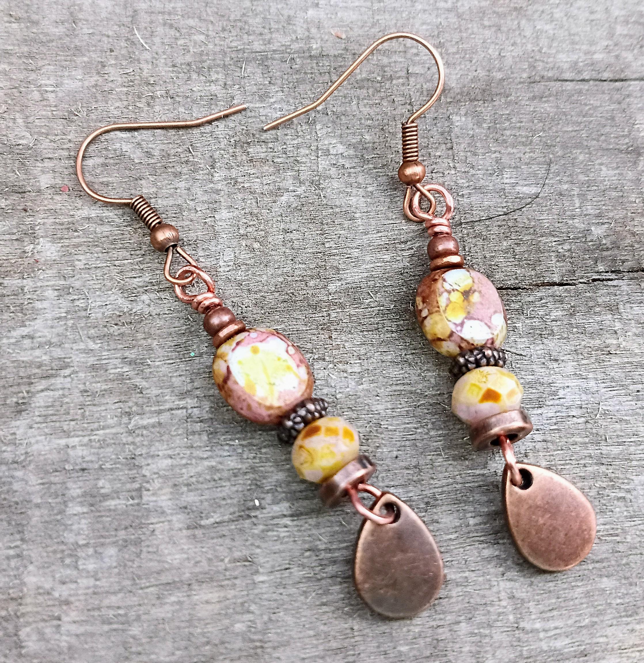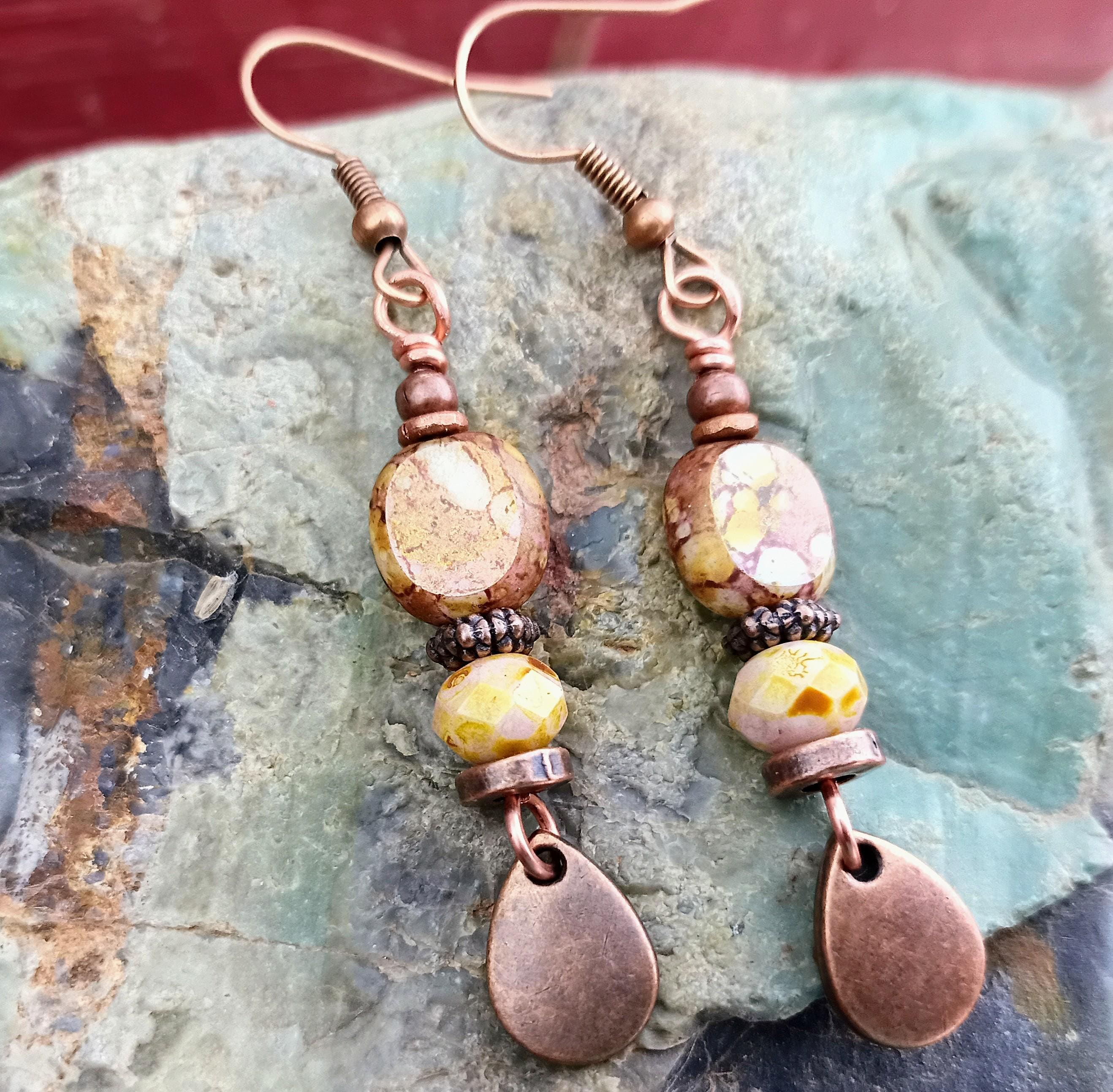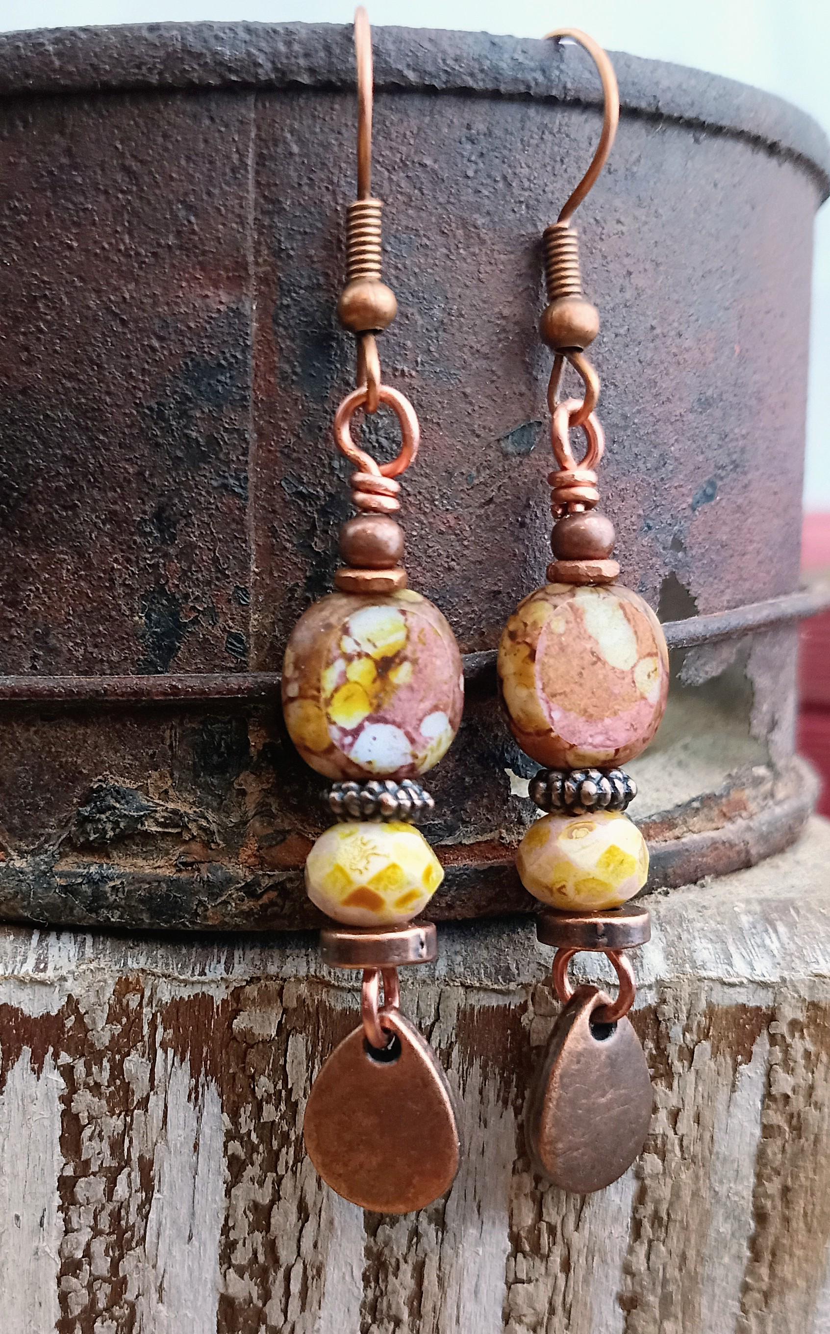 Beautiful Czech glass earrings that have a unique charm! Pink and cream Czech glass beads with Picasso finish, copper spacers and copper hypoallergenic ear wires. Copper metal teardrop dangle. These earrings are just a little over 2 inches long. I think they have a lovely antique look, perfect summer earrings or a great gift for that special person! Raspberry Cream Picasso Tablet Czech glass beads. Earrings are light weight.