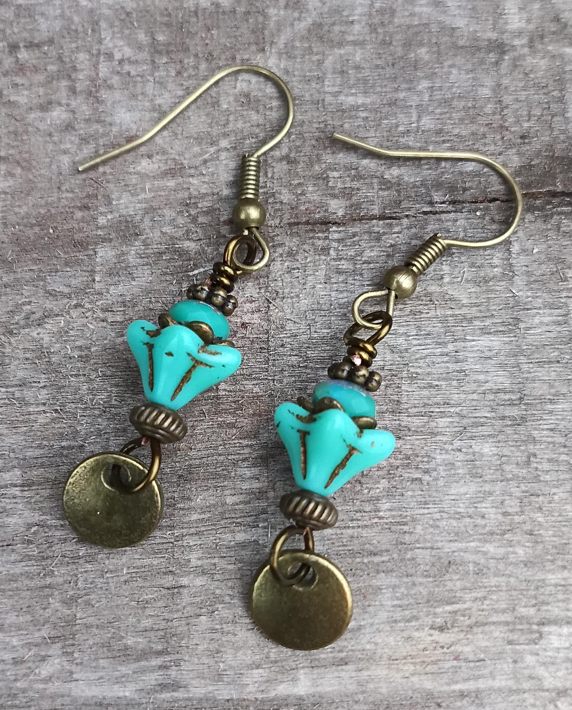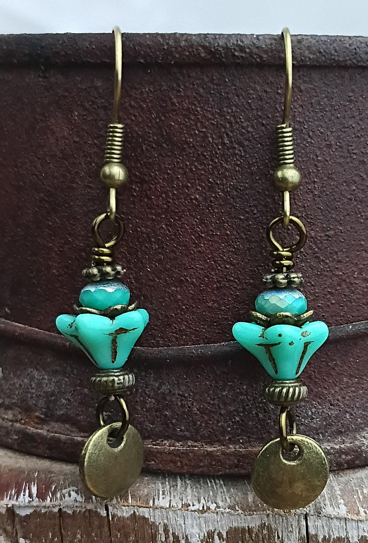 Simple and pretty, these dangle earrings are light weight and perfect for the summer! Czech Glass bellflower beads in beautiful turquoise green color with etched finish, Czech glass faceted beads, bronze metal spacers and bead caps. Beaded on antique brass wire with bronze hypoallergenic ear wires. They are just over 1.5 inches with the bronze metal coin dangle that is 7/8mm size. A great gift for that special person!