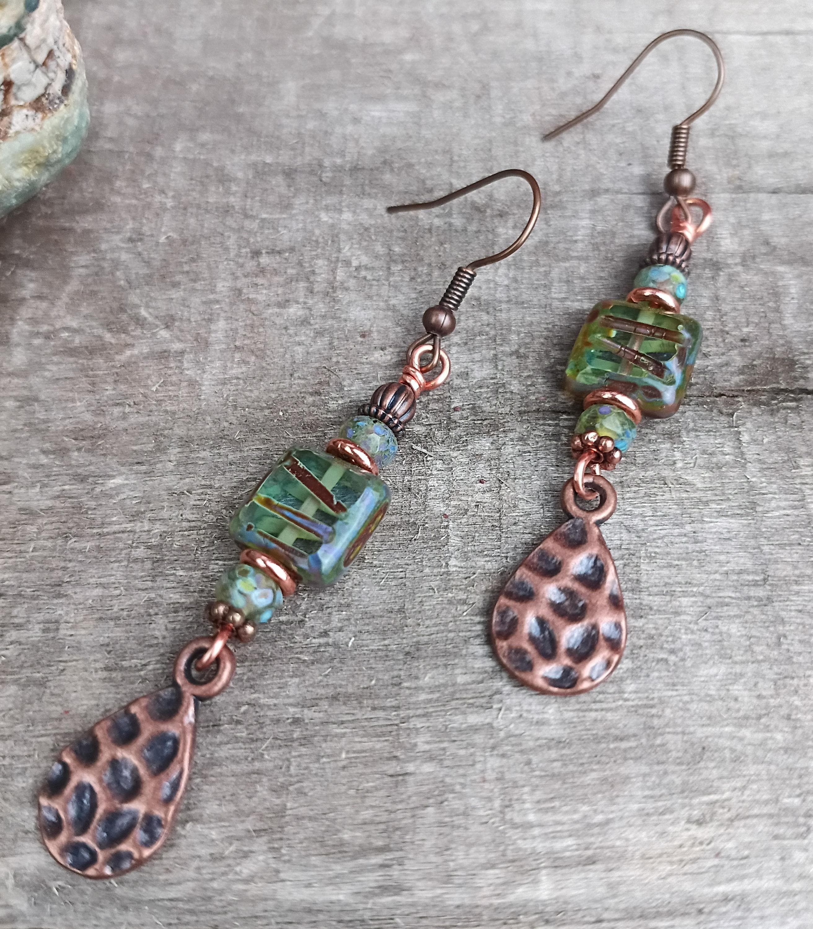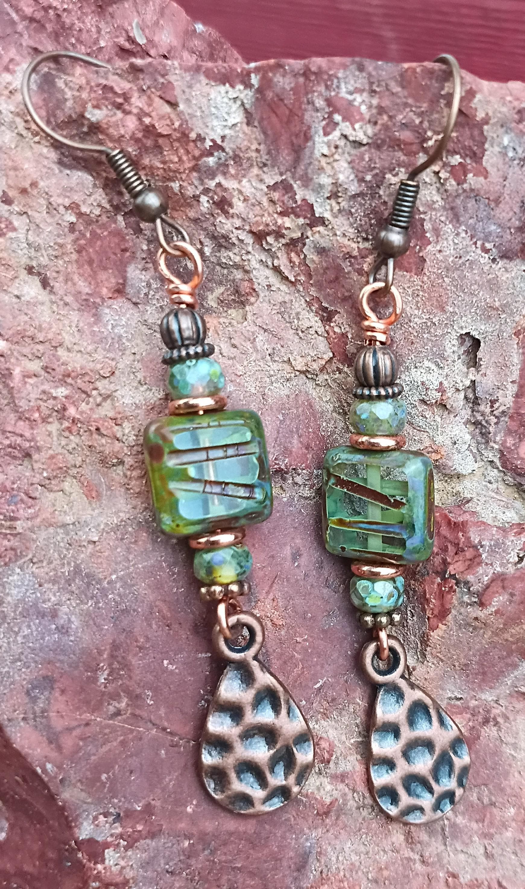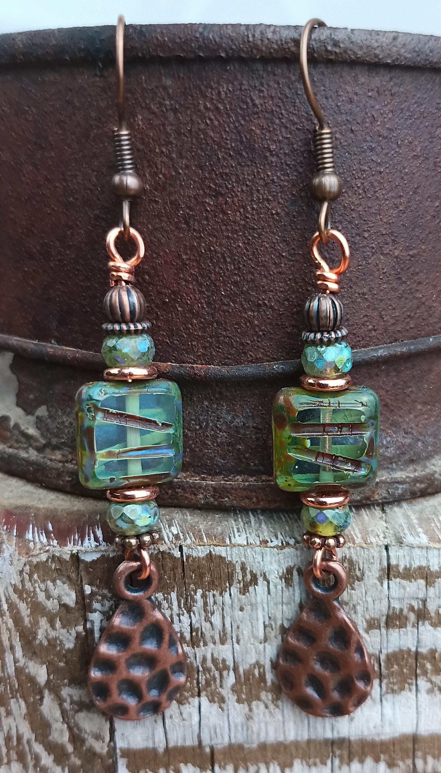 Rustic Earthy and Beautiful, Czech Glass Beaded Earrings, light weight and perfect earrings for the summer or year around! Czech Glass beads ar 10mm River Grooves square tiles with Picasso finish, Czech glass faceted rondels, Picasso seed beads along with copper metal spacers, hammered copper teardrops beaded on copper wire with copper ear wires. 2.5 inches long. Earthy earrings that make me think of being up north in the pines! A great gift for that special person!