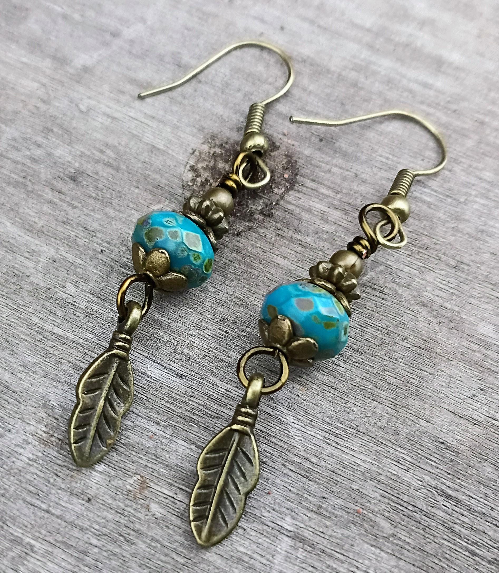 Beautiful dangle earrings, light weight, perfect for summer! Czech Glass, turquoise blue Picasso Rondelle 9x6 beads, bronze metal spacers, bronze metal leaf charm. Beaded on antique brass wire with Hypoallergenic bronze ear wires. 2 inches long. Earthy, rustic Bohemian style earrings!