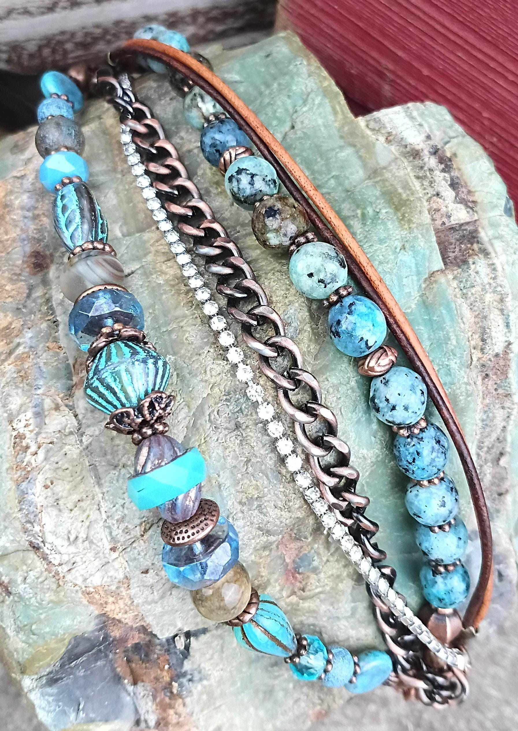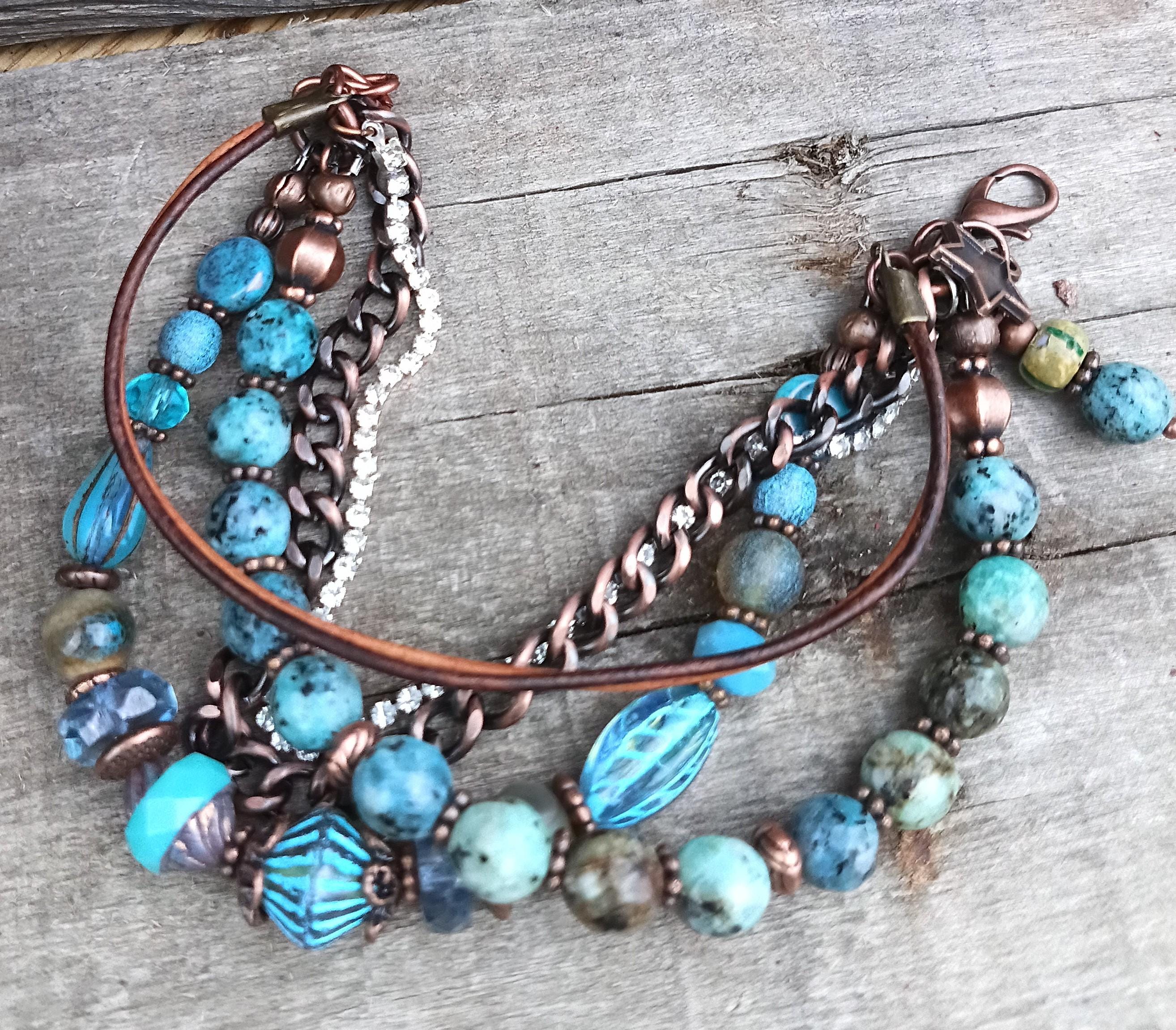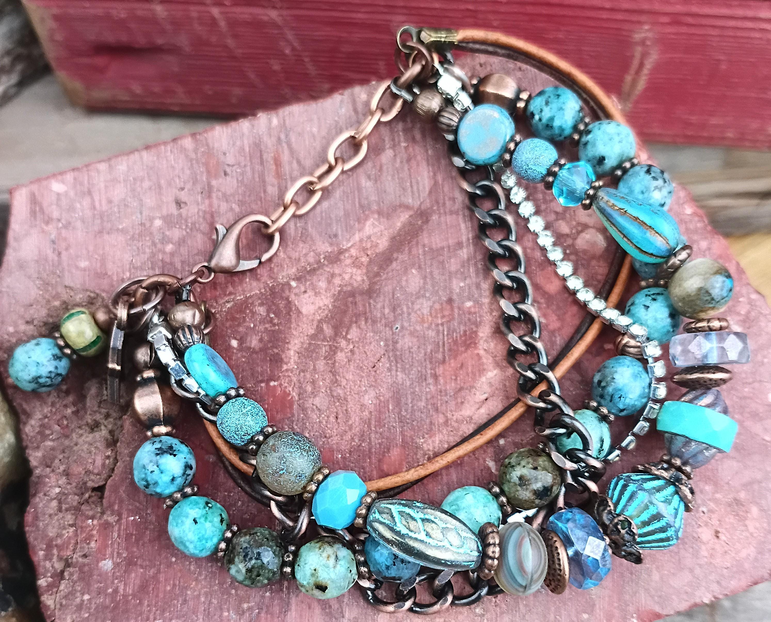 Beautiful multi strand beaded bracelet, 5 stands total. Beaded on stainless steel beading wire with wire guards for added protection. Adjustable, designed to fit - 7 to 8 1/2 inch wrist. Lobster claw close. Variety of different Czech glass beads in blue's with Picasso or etched finish. Different shapes and sizes! Glass faceted beads with matrix, metal copper spacers and beads, copper metal chain , diamond rhinestone cup chain and 1.5mm leather strands. Perfect summer bracelets or all year around! Makes for a great gift for that special person!