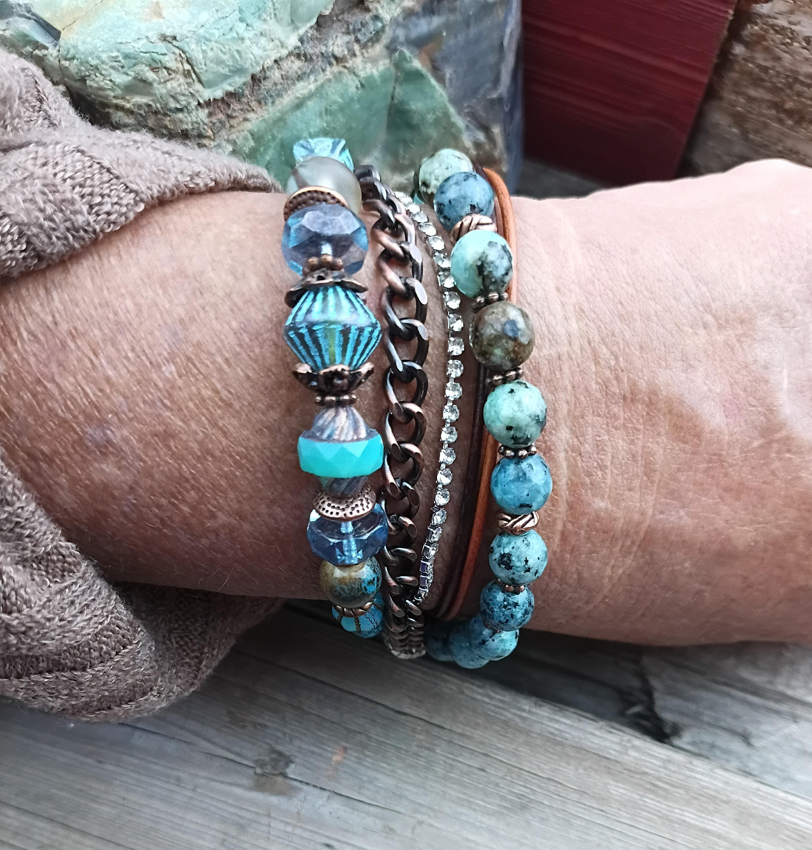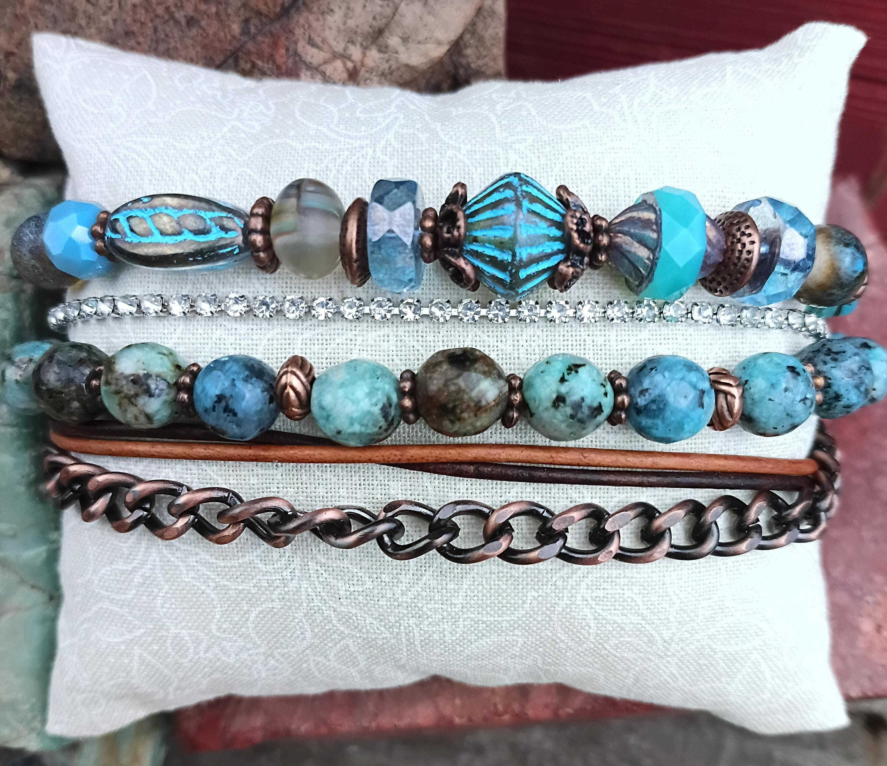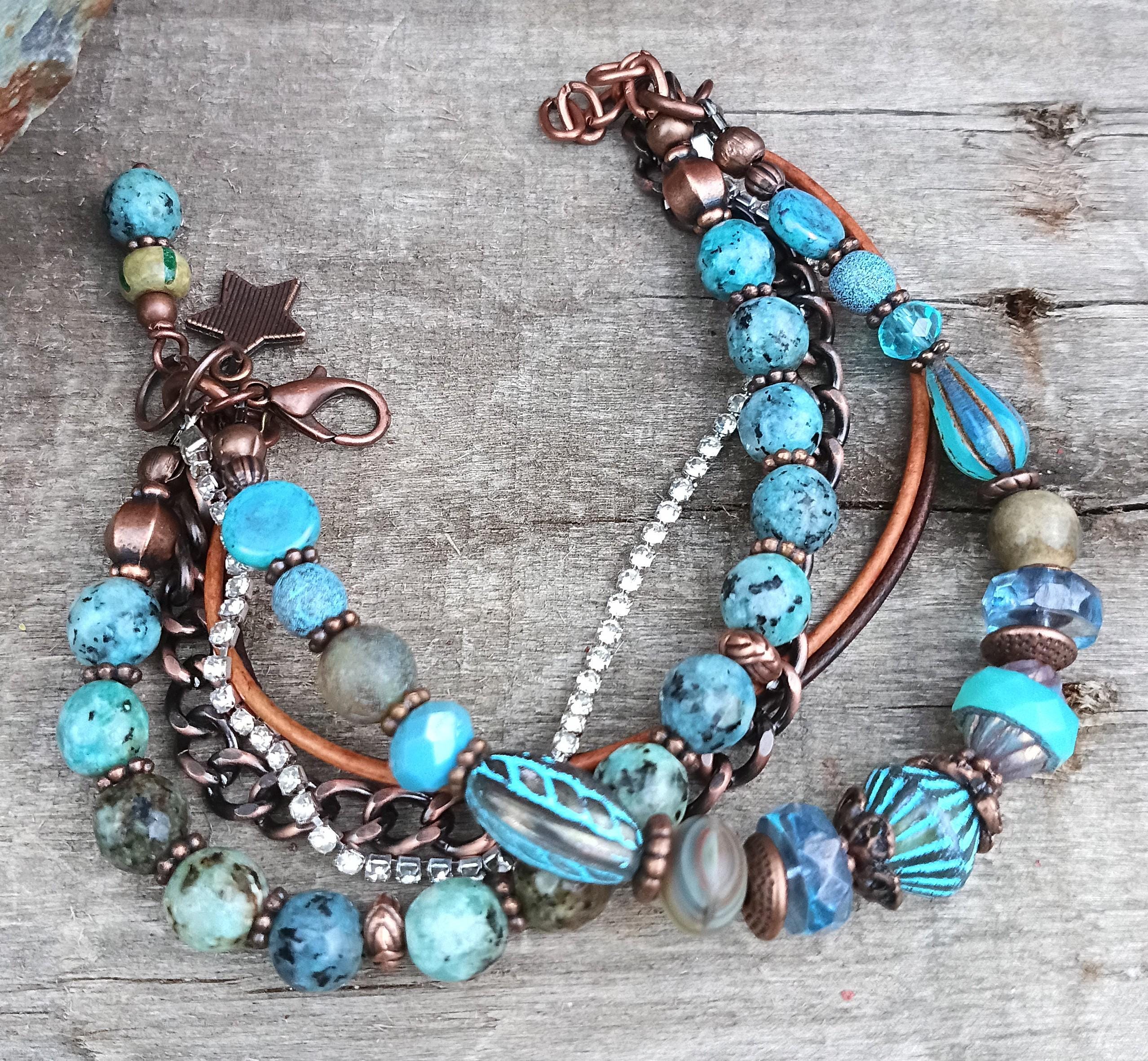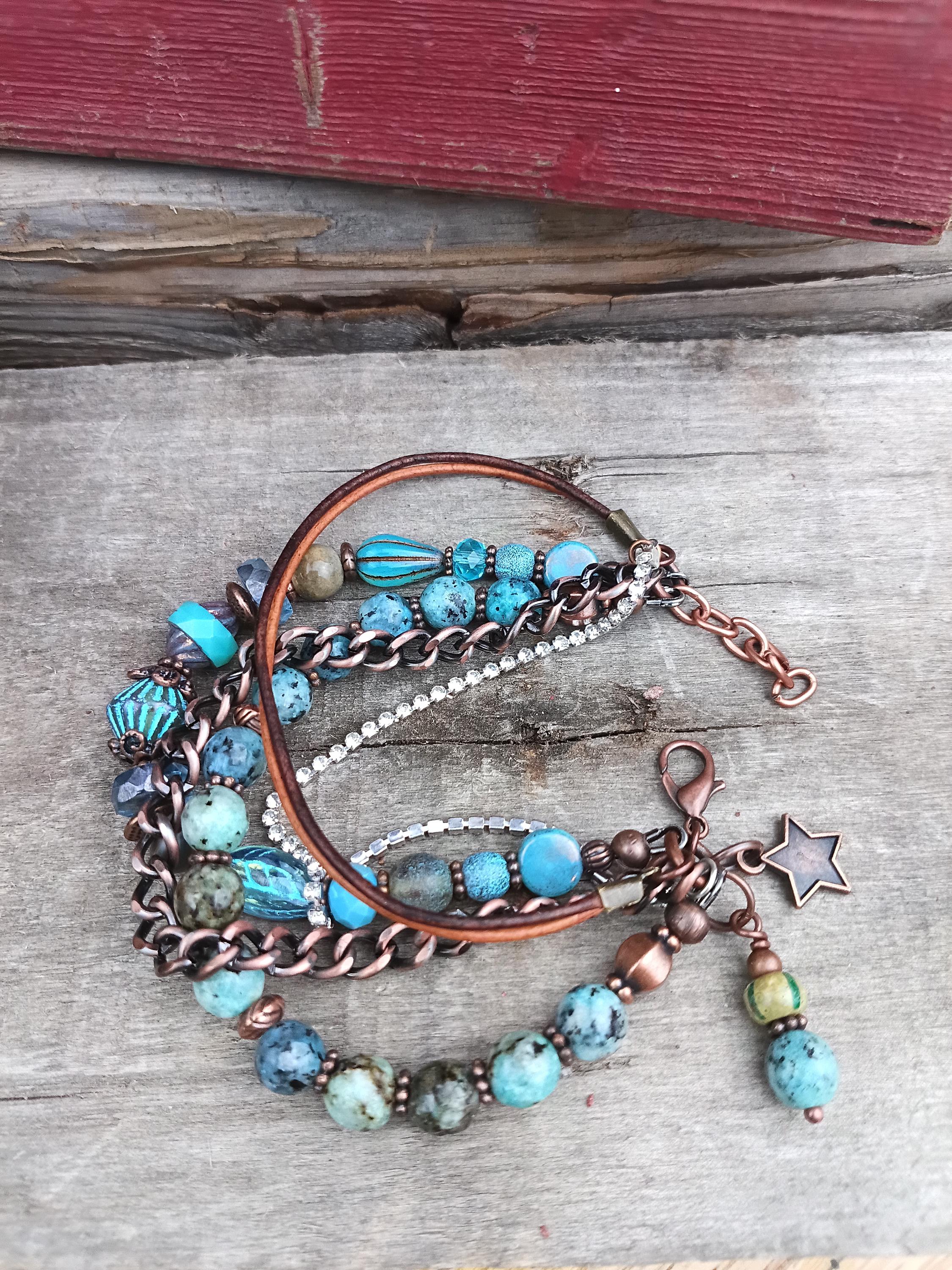 Beautiful multi strand beaded bracelet, 5 stands total. Beaded on stainless steel beading wire with wire guards for added protection. Adjustable, designed to fit - 7 to 8 1/2 inch wrist. Lobster claw close. Variety of different Czech glass beads in blue's with Picasso or etched finish. Different shapes and sizes! Glass faceted beads with matrix, metal copper spacers and beads, copper metal chain , diamond rhinestone cup chain and 1.5mm leather strands. Perfect summer bracelets or all year around! Makes for a great gift for that special person!