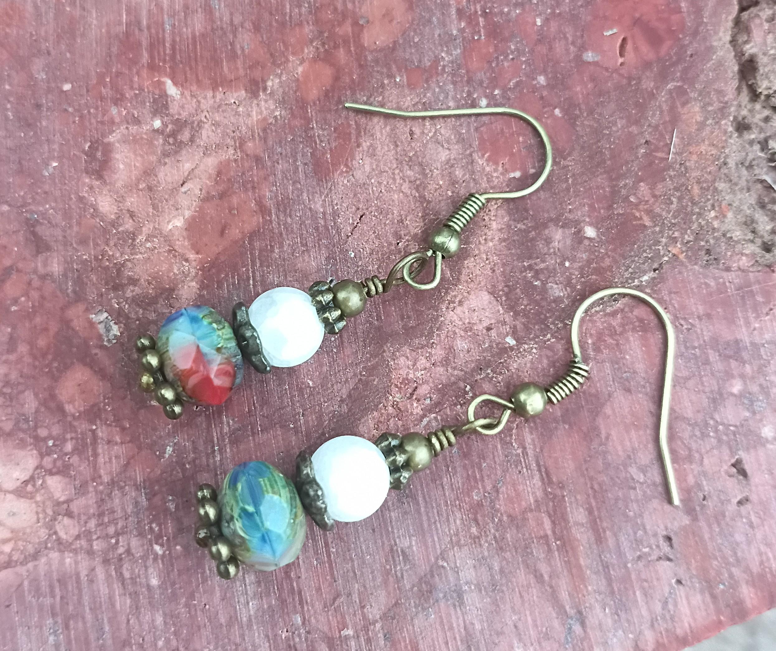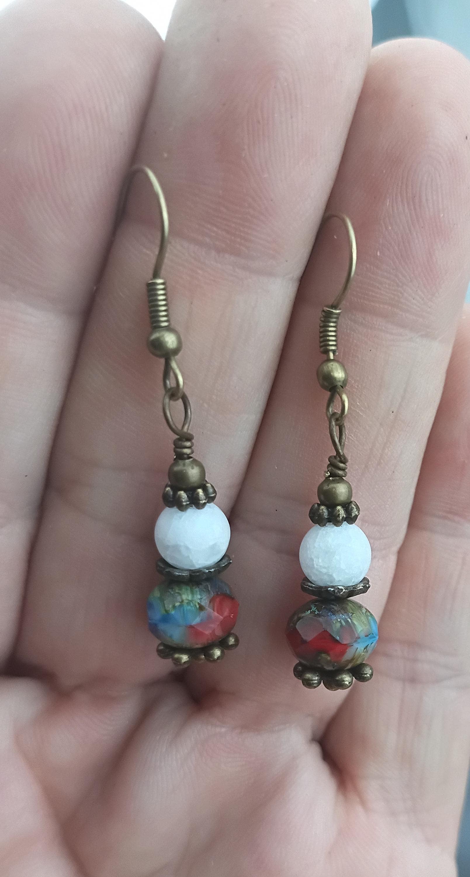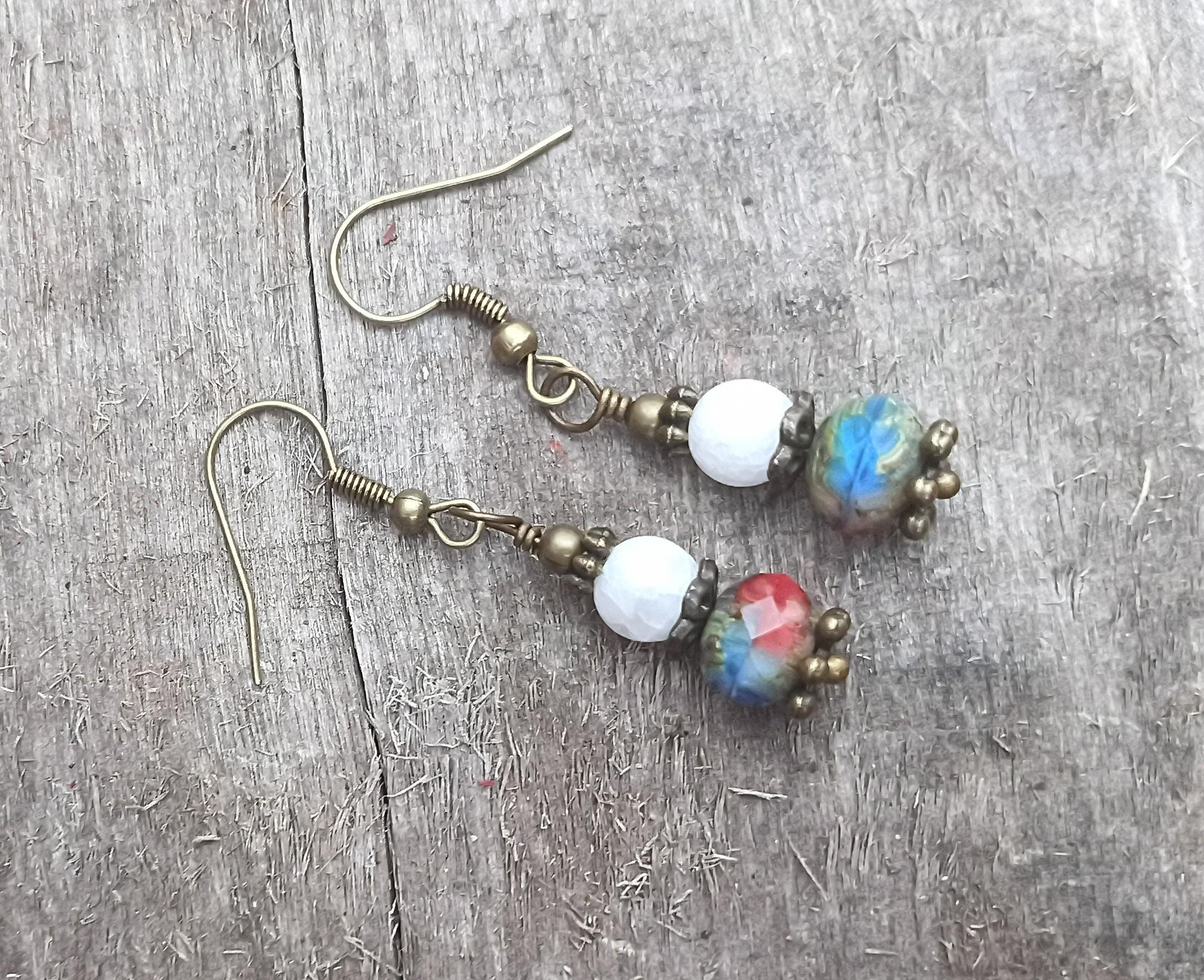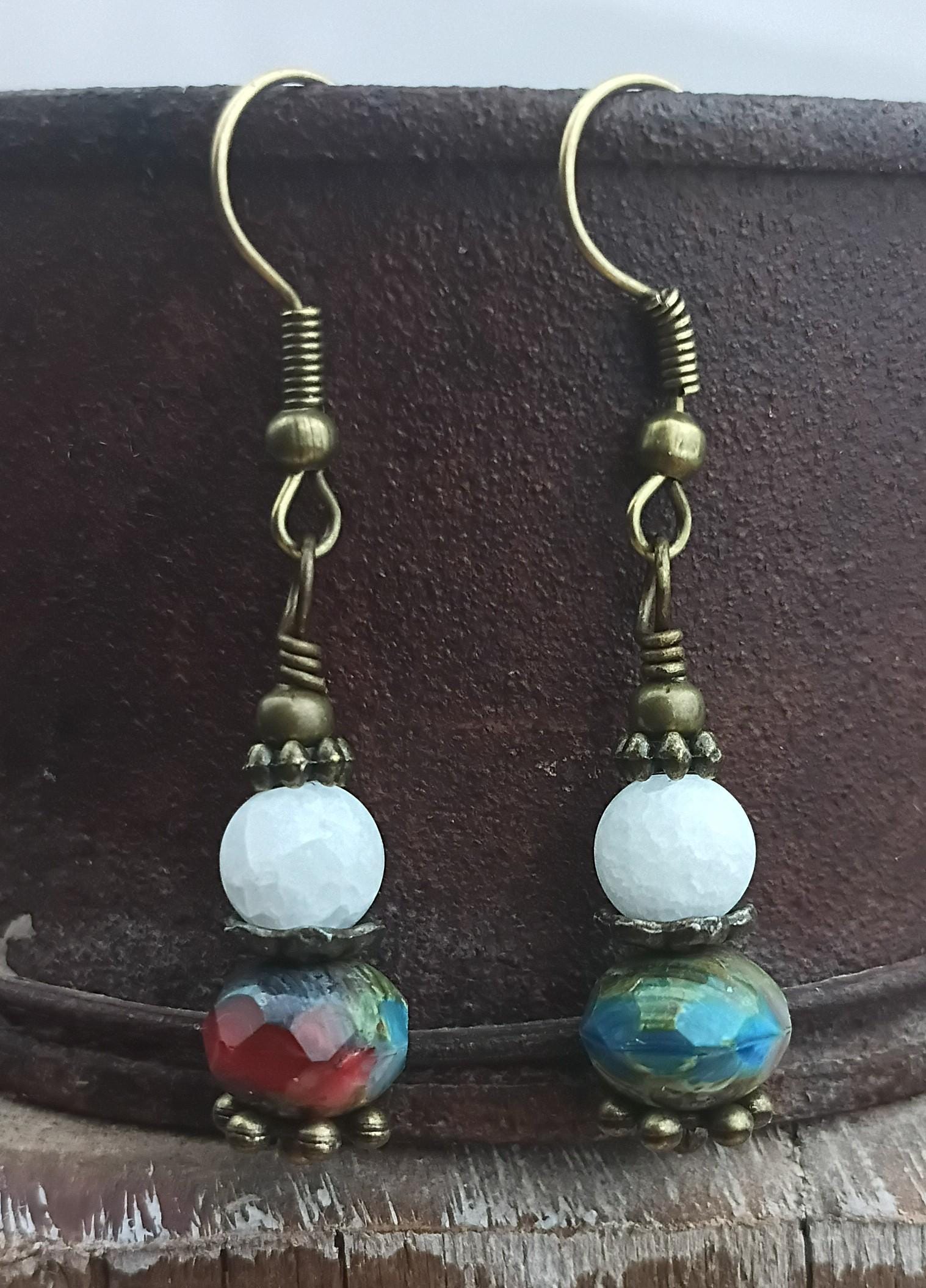 Cute and fun pair of earrings in red, white and blue colors for Independence Day or year around! These dangle earrings are 1 1/2 inches long, beaded with Czech glass faceted "Americana" 10mm beads and 6mm cracked white glass beads. Antique brass wire with Hypoallergenic ear wires, bronze metal spacers. Light weight and festive!