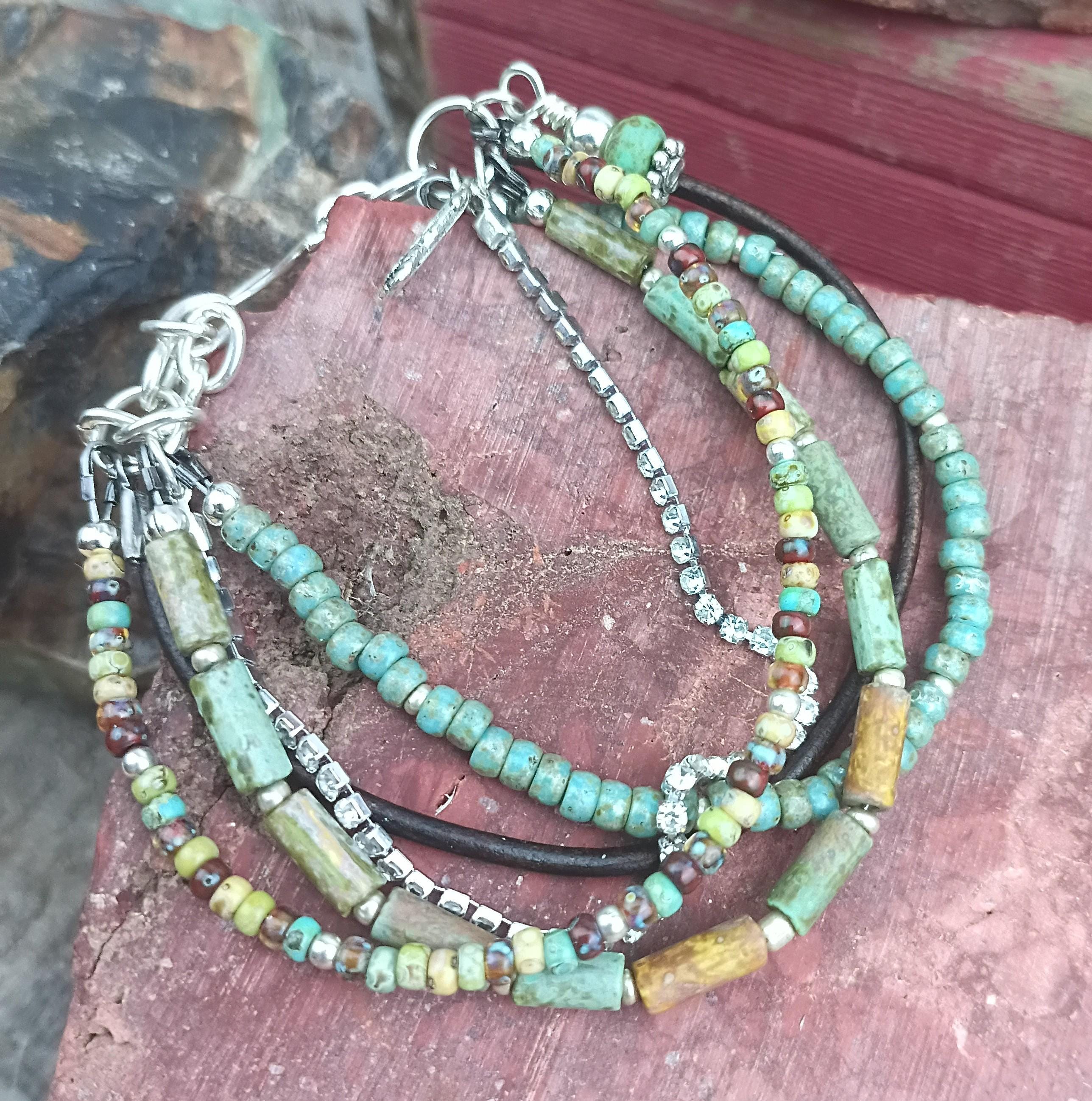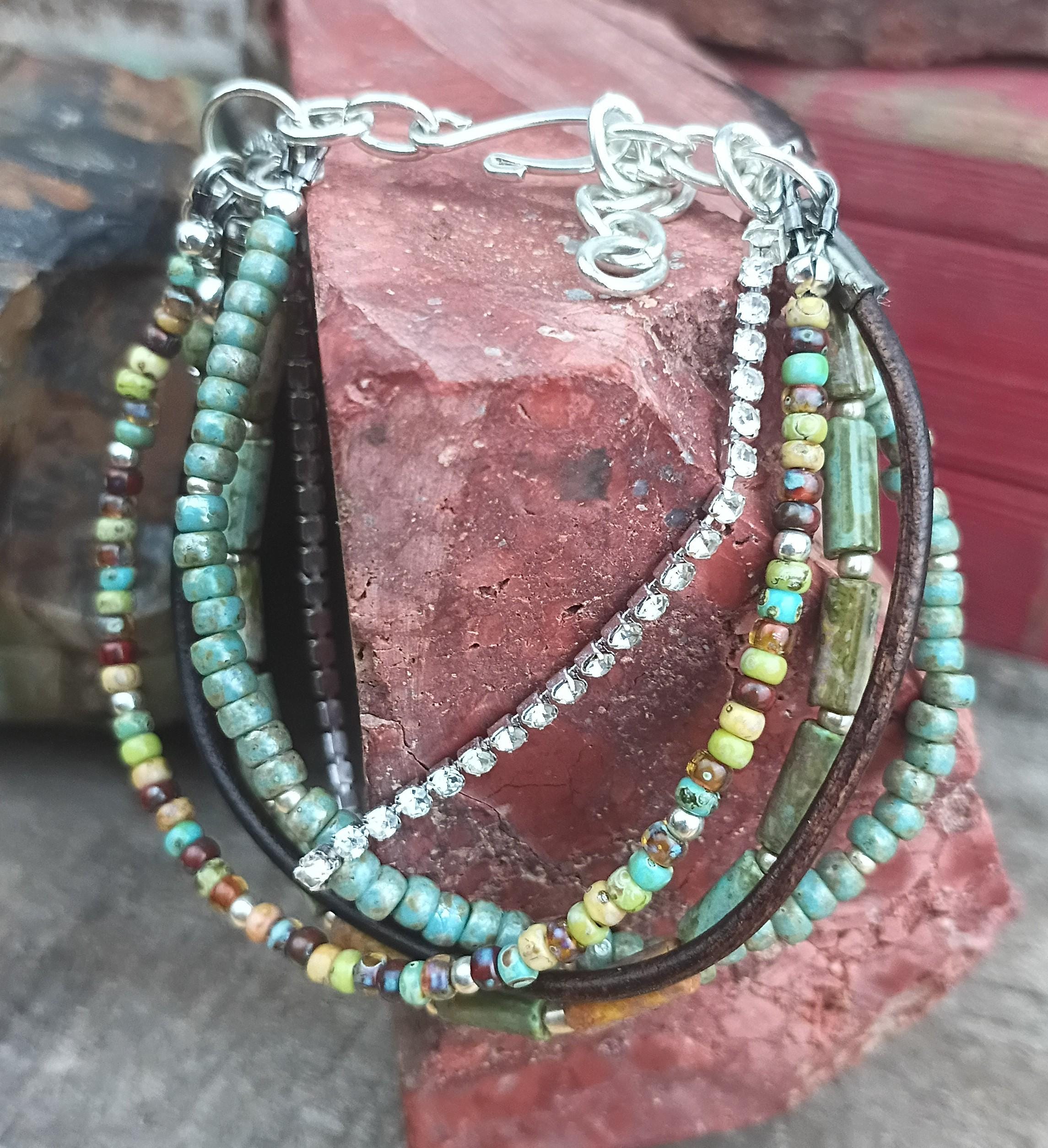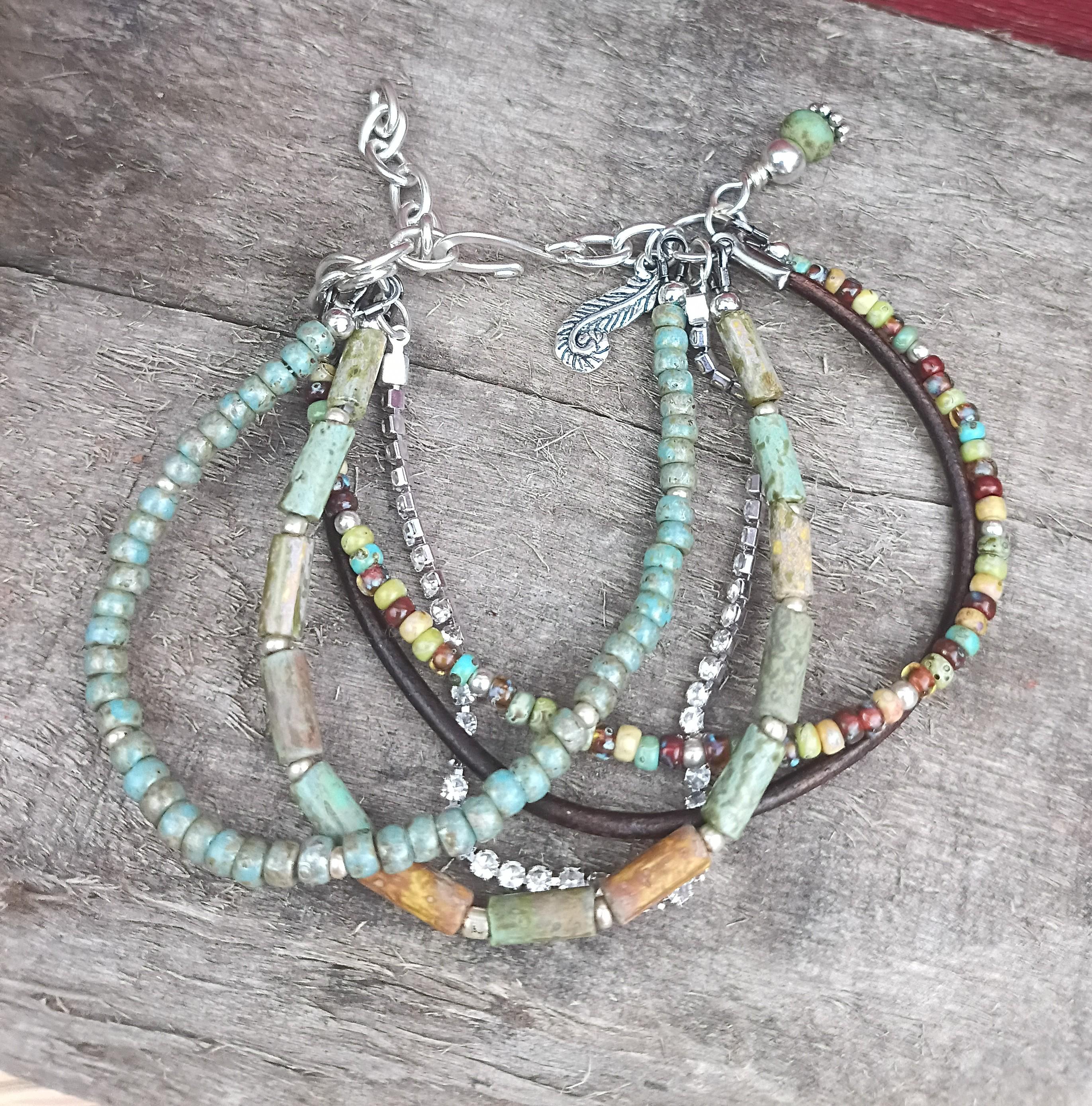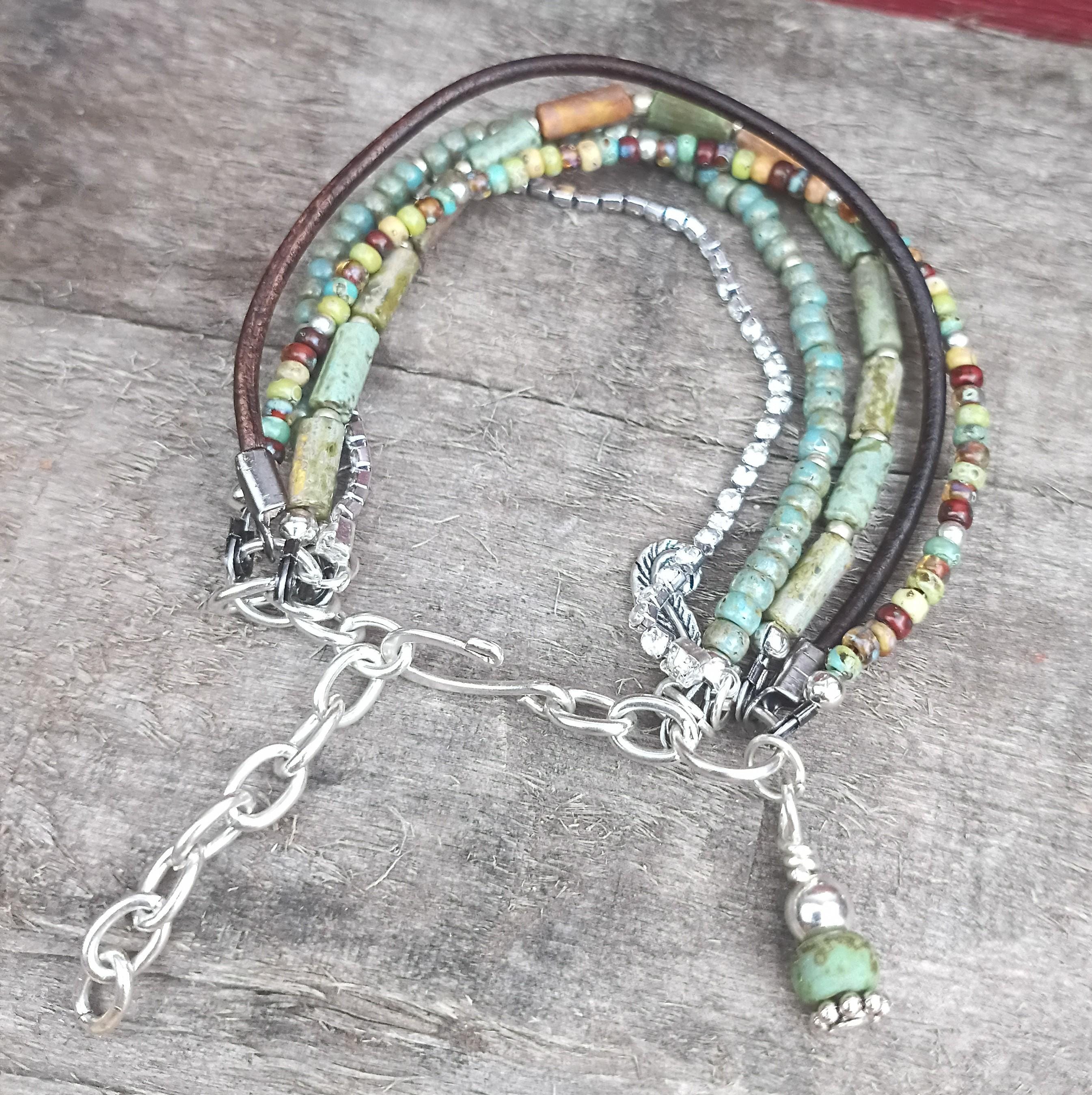 Beaded on stainless steel beading wire with wire guards for added protection, adjustable with silver tone extension chain and silver tone hook. 1 strand - diamond rhinestone cup chain, 1 - stand 1.5mm leather cord and 3 strand's beaded with Picasso finish seed beads and Czech glass. Silver tone seed bead spacers. This bracelet is designed to fit wrist size - 7 to 8 1/8. 1 feather silver okayed metal charm and 1 beaded wrap charm. Earth tone colors of light greens, beige Picasso reds and amber. Light weight bracelet.
