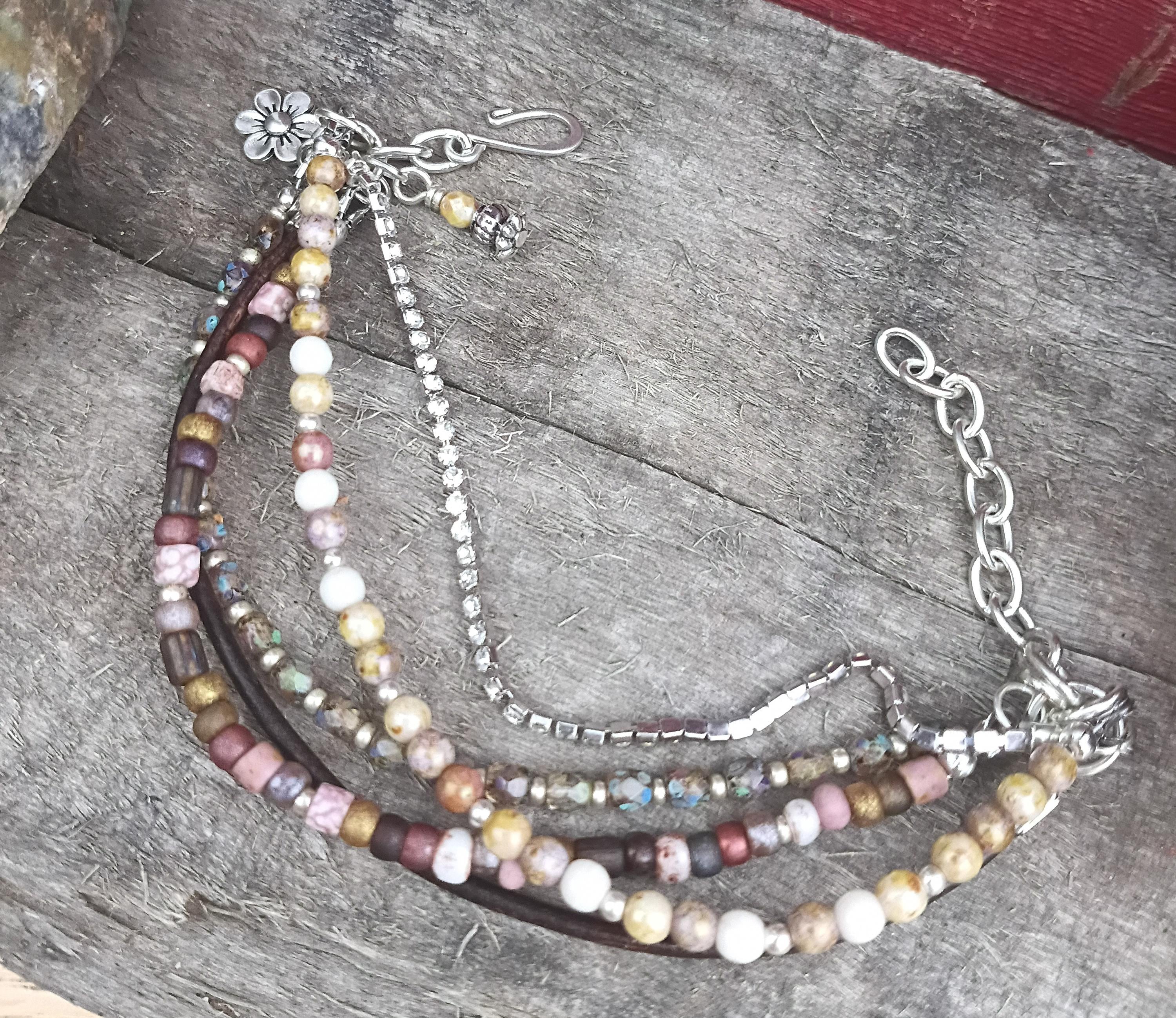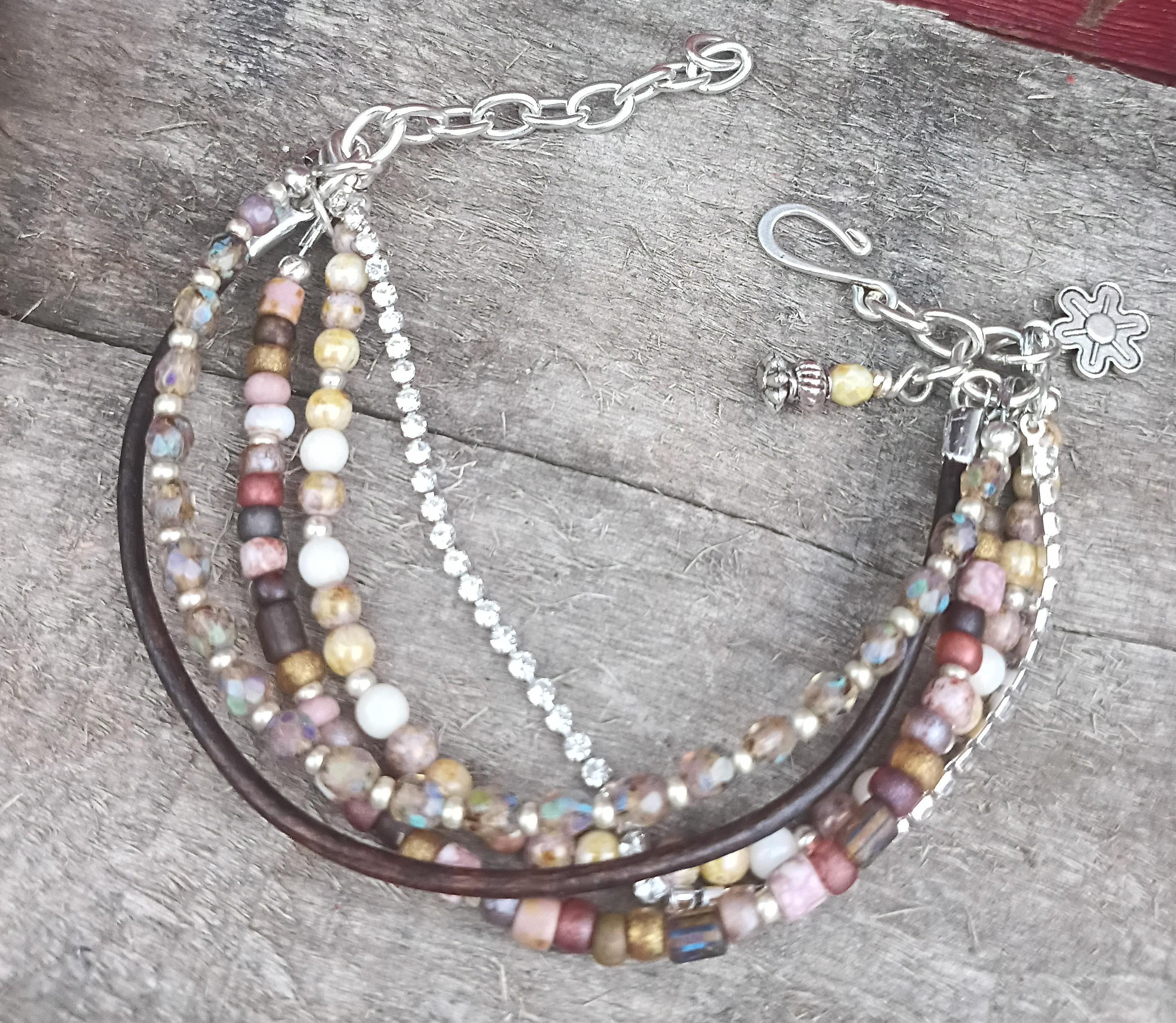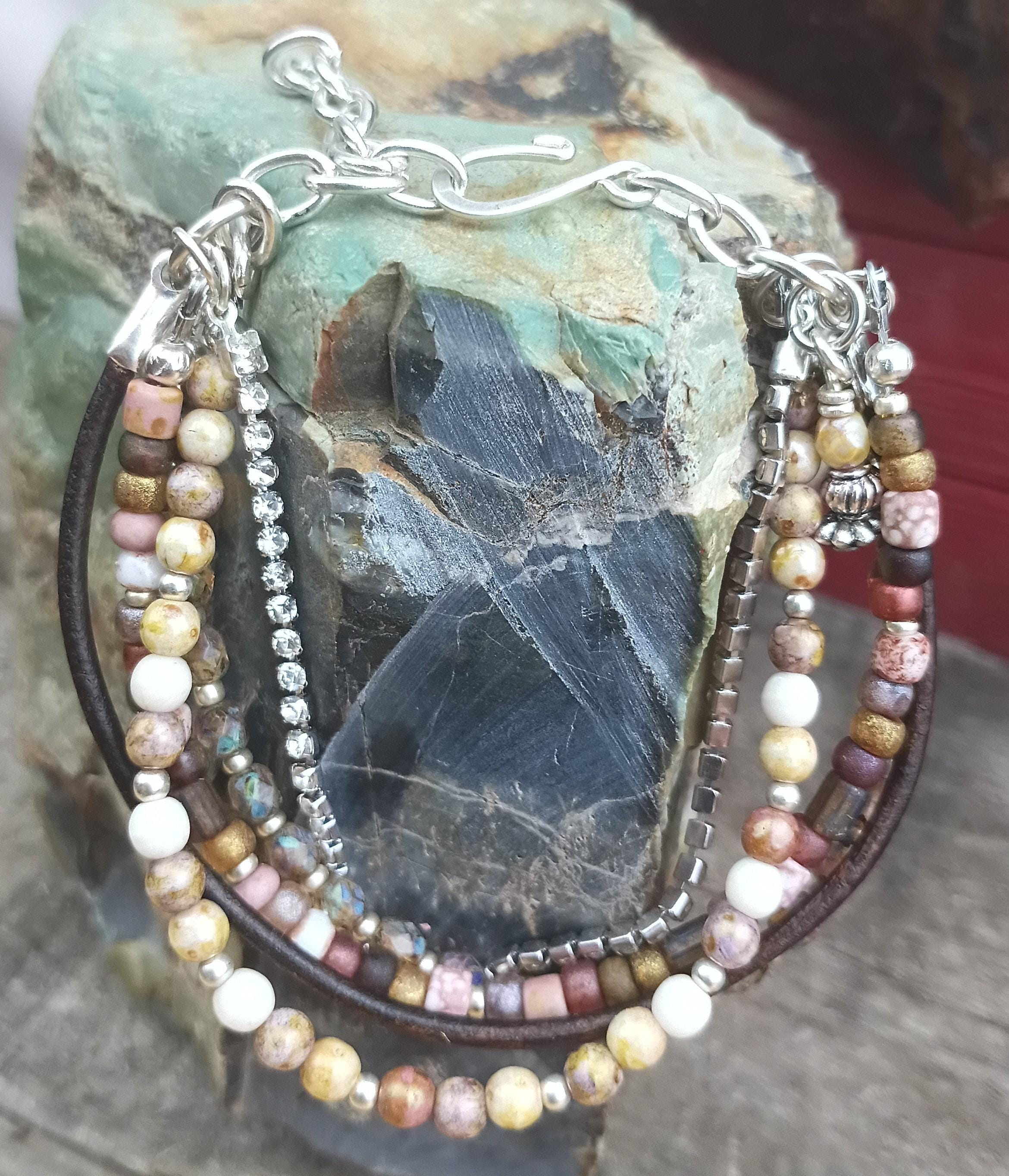 Beautiful multi Strand Bracelet, perfect for the summer or year around! This dainty Boho style bracelet features 1.5mm leather cord, 1 diamond rhinestone cup chain, 3 strands of Czech glass beads, glass seed beads, silver tone seed beads, faceted beads. 4mm and smaller. All beaded on stainless steel beading wire with wire guards for added protection! Silver tone hook for close, silver tone extension chain. Silver tone metal flower charm and 1 beaded charm. All in earth creams and pinks and rustic pinks ( Picasso finish) Adjustable to fit 7 to 8 1/2 inch wrist. 5 strands total. Light weight. Beautiful stack ir layered look! Be sure to check my other listings for more multi stand bracelets and dangle earrings! Thank you for visiting, have an amazing day!