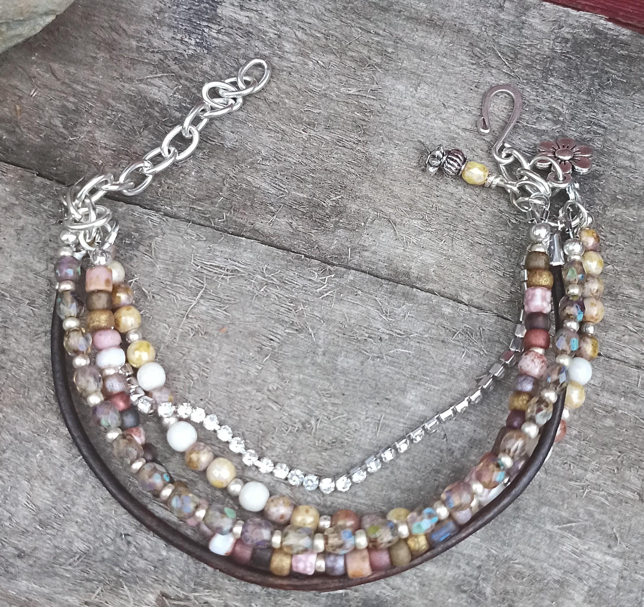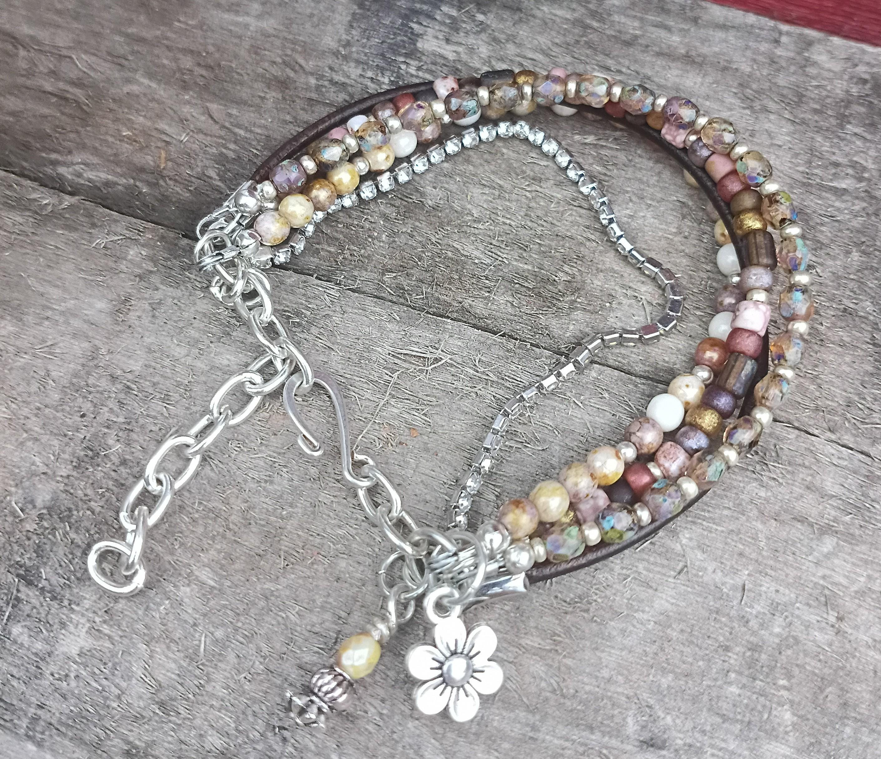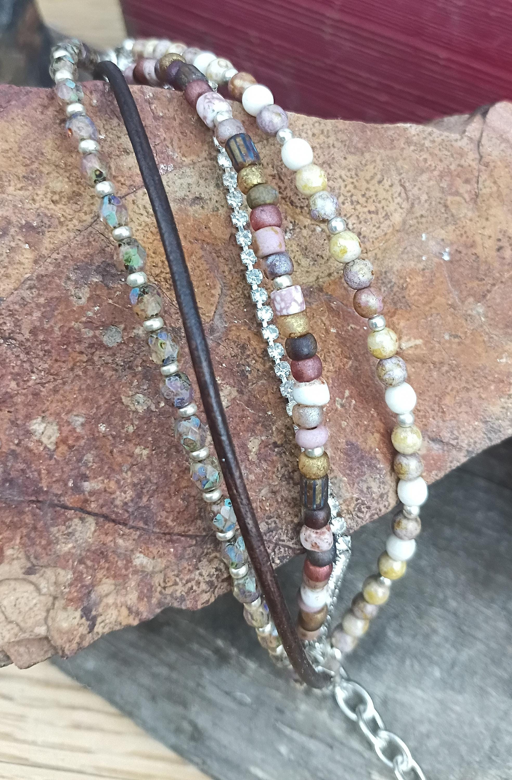 Beautiful multi Strand Bracelet, perfect for the summer or year around! This dainty Boho style bracelet features 1.5mm leather cord, 1 diamond rhinestone cup chain, 3 strands of Czech glass beads, glass seed beads, silver tone seed beads, faceted beads. 4mm and smaller. All beaded on stainless steel beading wire with wire guards for added protection! Silver tone hook for close, silver tone extension chain. Silver tone metal flower charm and 1 beaded charm. All in earth creams and pinks and rustic pinks ( Picasso finish) Adjustable to fit 7 to 8 1/2 inch wrist. 5 strands total. Light weight. Beautiful stack ir layered look! Be sure to check my other listings for more multi stand bracelets and dangle earrings! Thank you for visiting, have an amazing day!