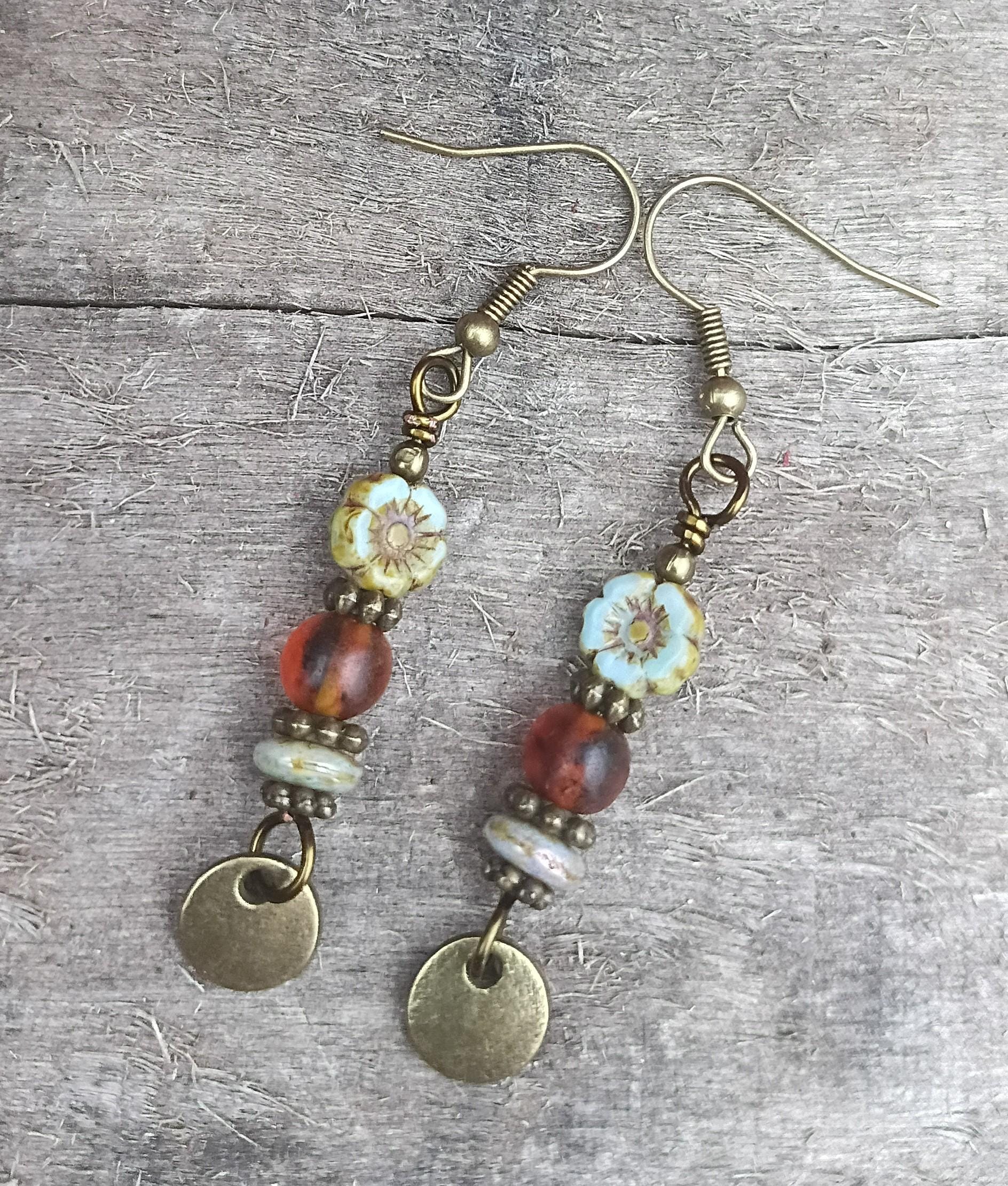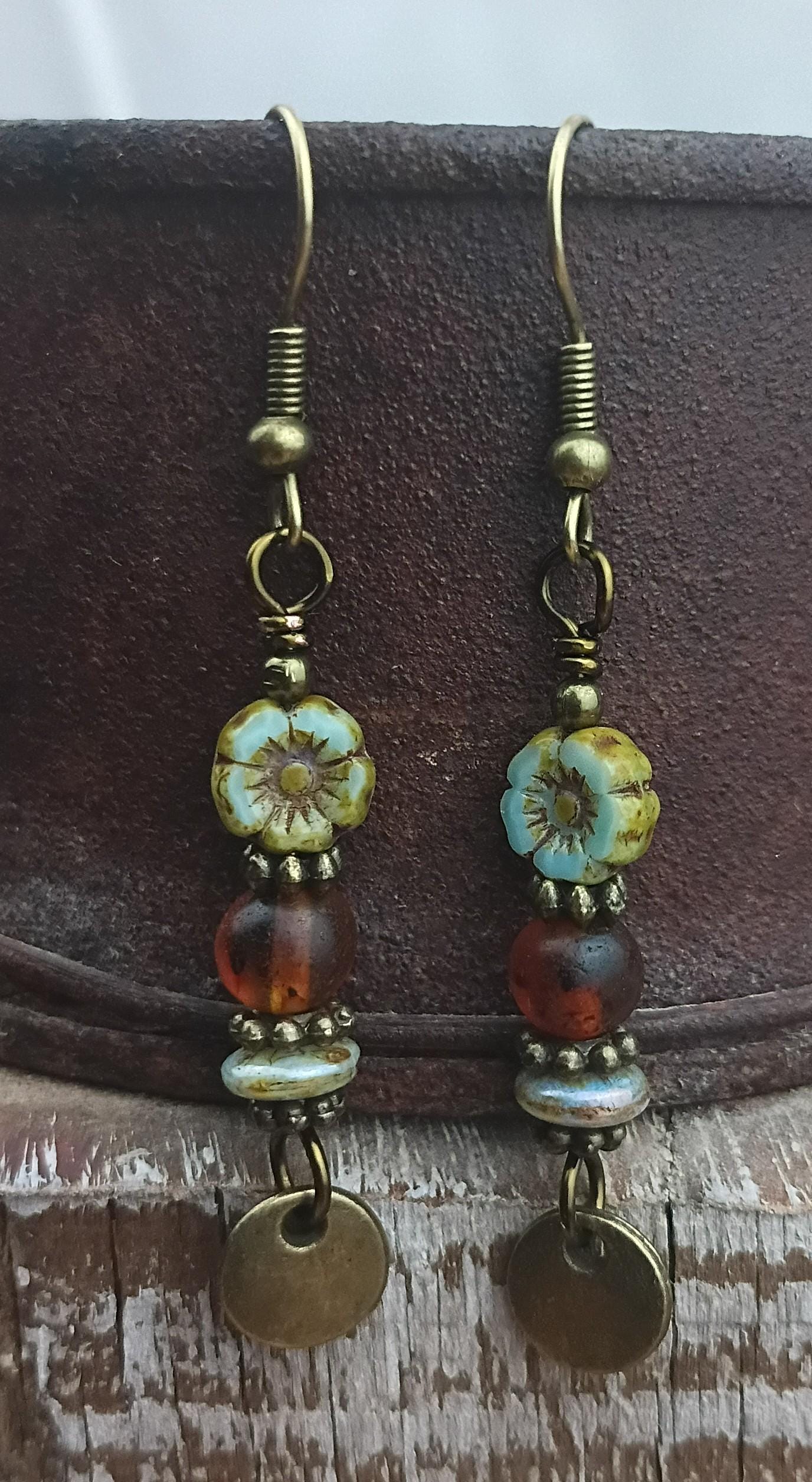 Pretty, earthy Bohemian style dangle earrings with Czech glass flower beads in a very light blue/turquoise blue. The color is very light. 6mm in size with Picasso finish. Baltic Amber beads, bronze metal spacers and metal coin dangle. Czech Glass Picasso spacers.