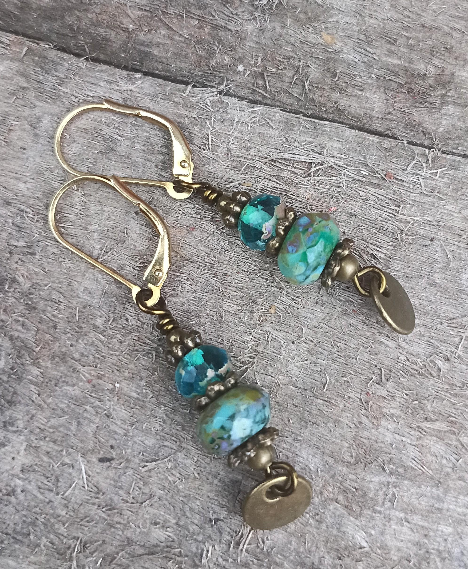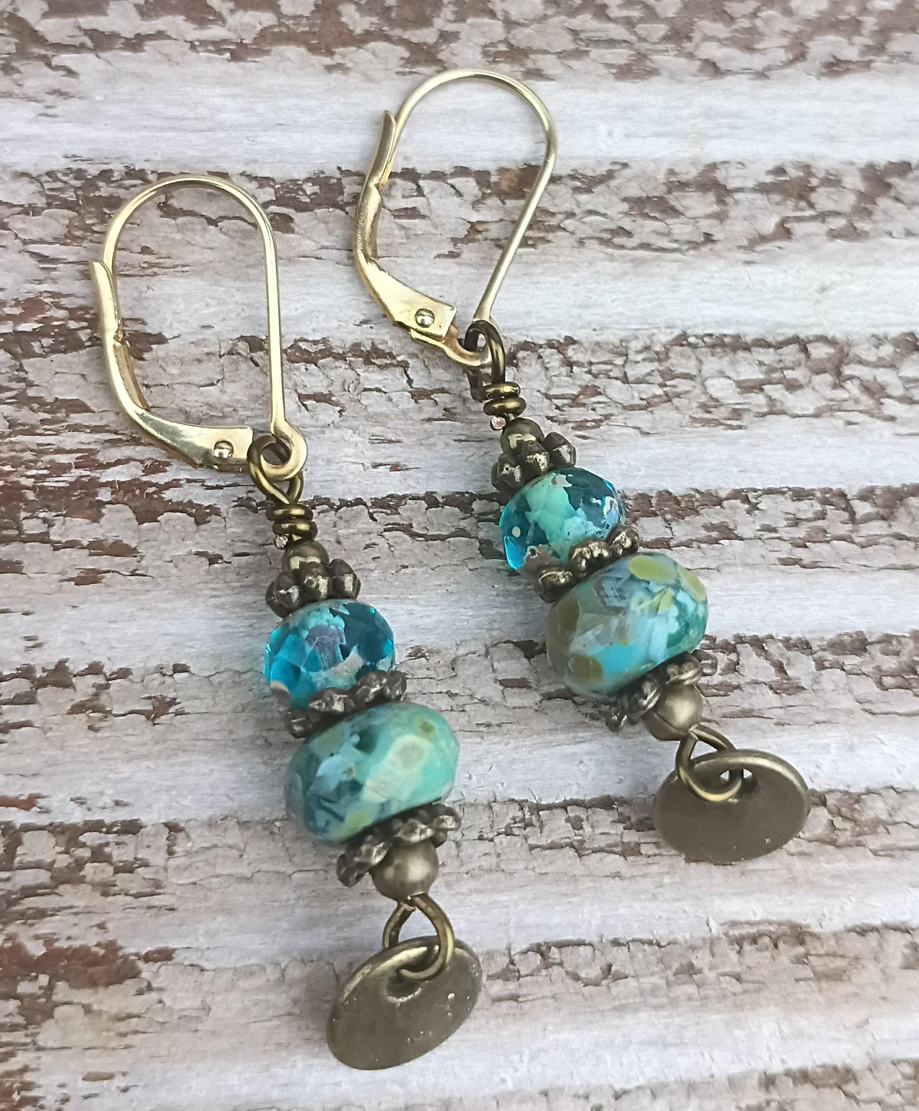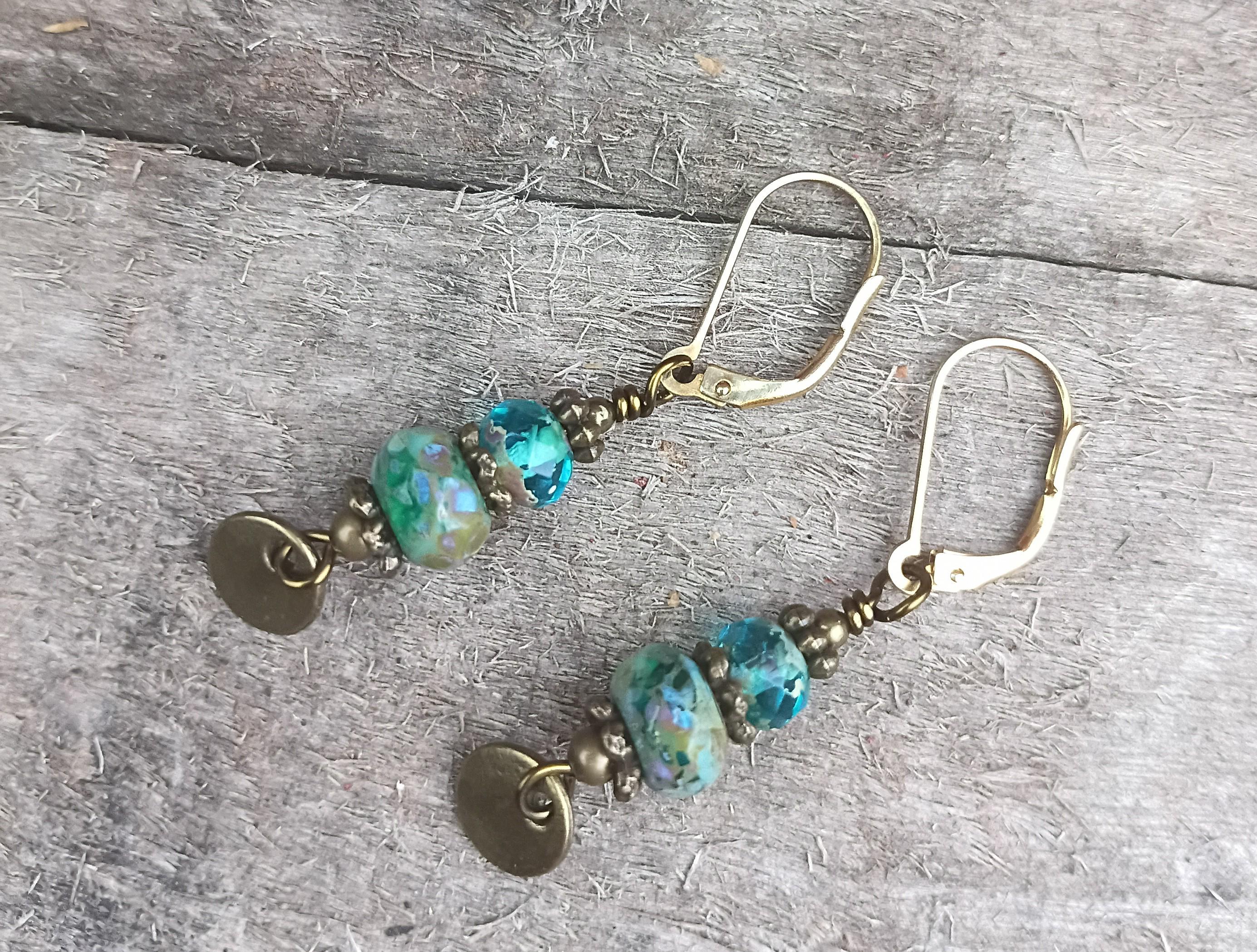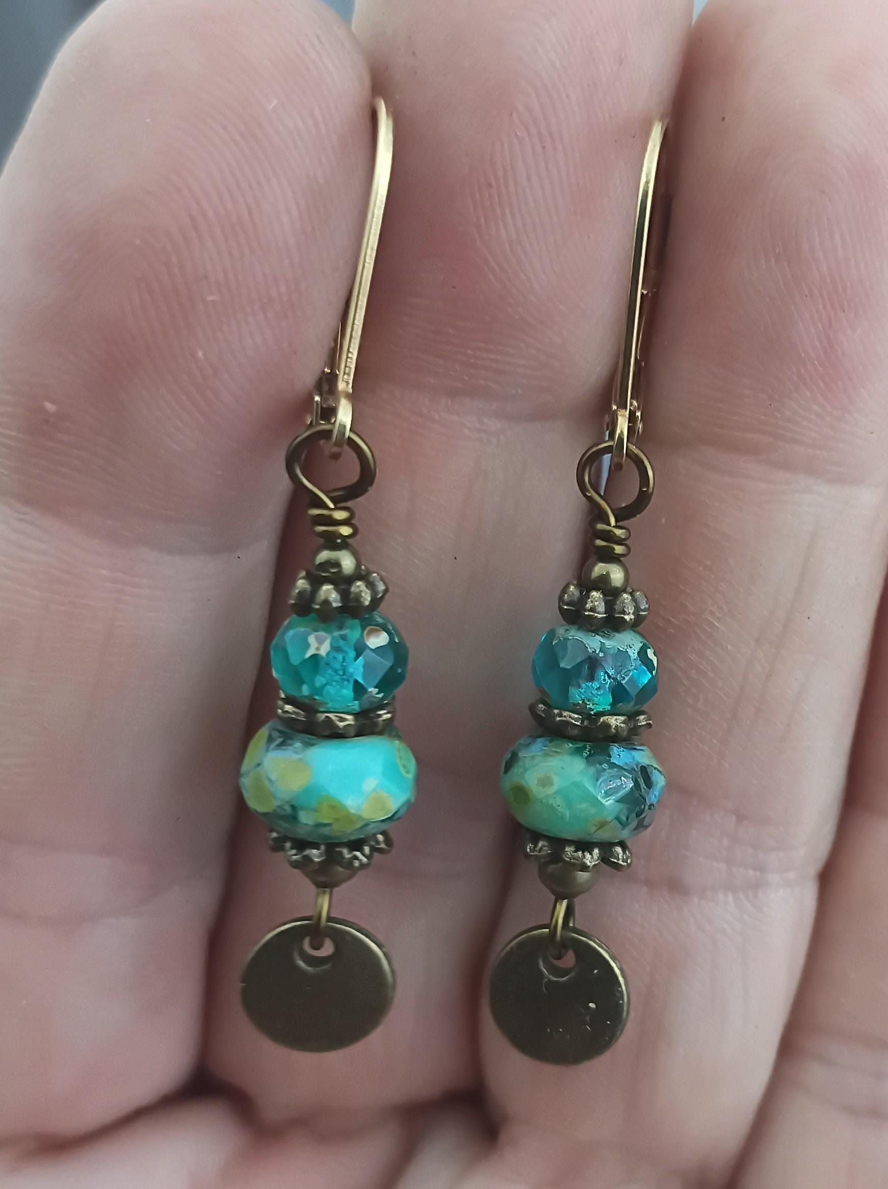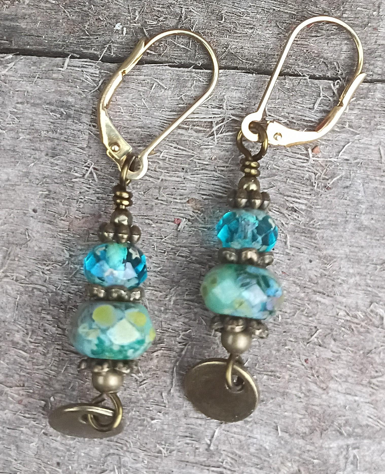 Aqua just has its own realm when it comes to colors! These beautiful earrings are beaded with Aqua Seahorse Rollers 6x9mm along with Czech glass faceted aqua beads. Paired with bronze metal spacers and coin dangle. Beaded on antique brass wire. 2 inches long. Perfect beach and summer earrings!