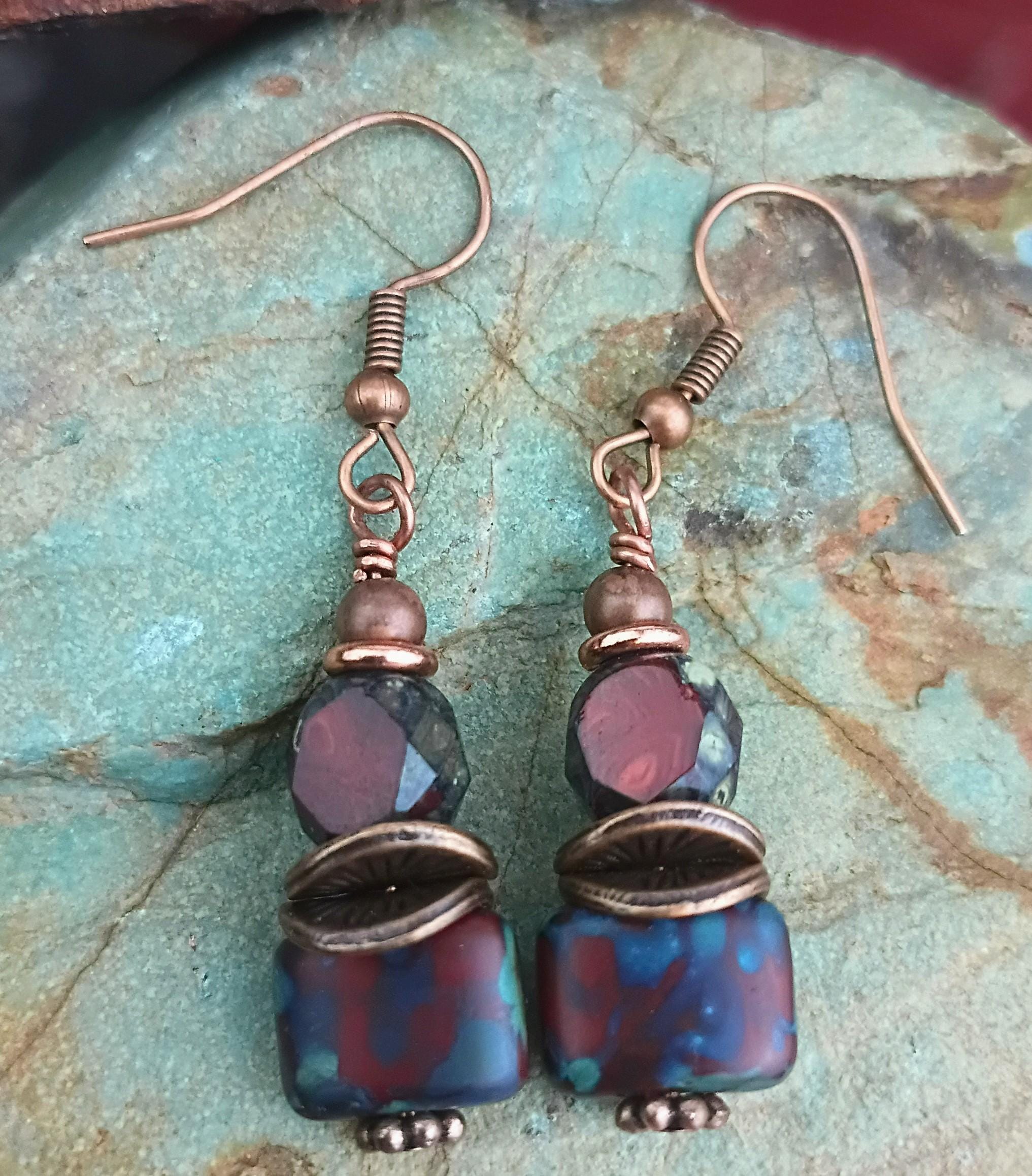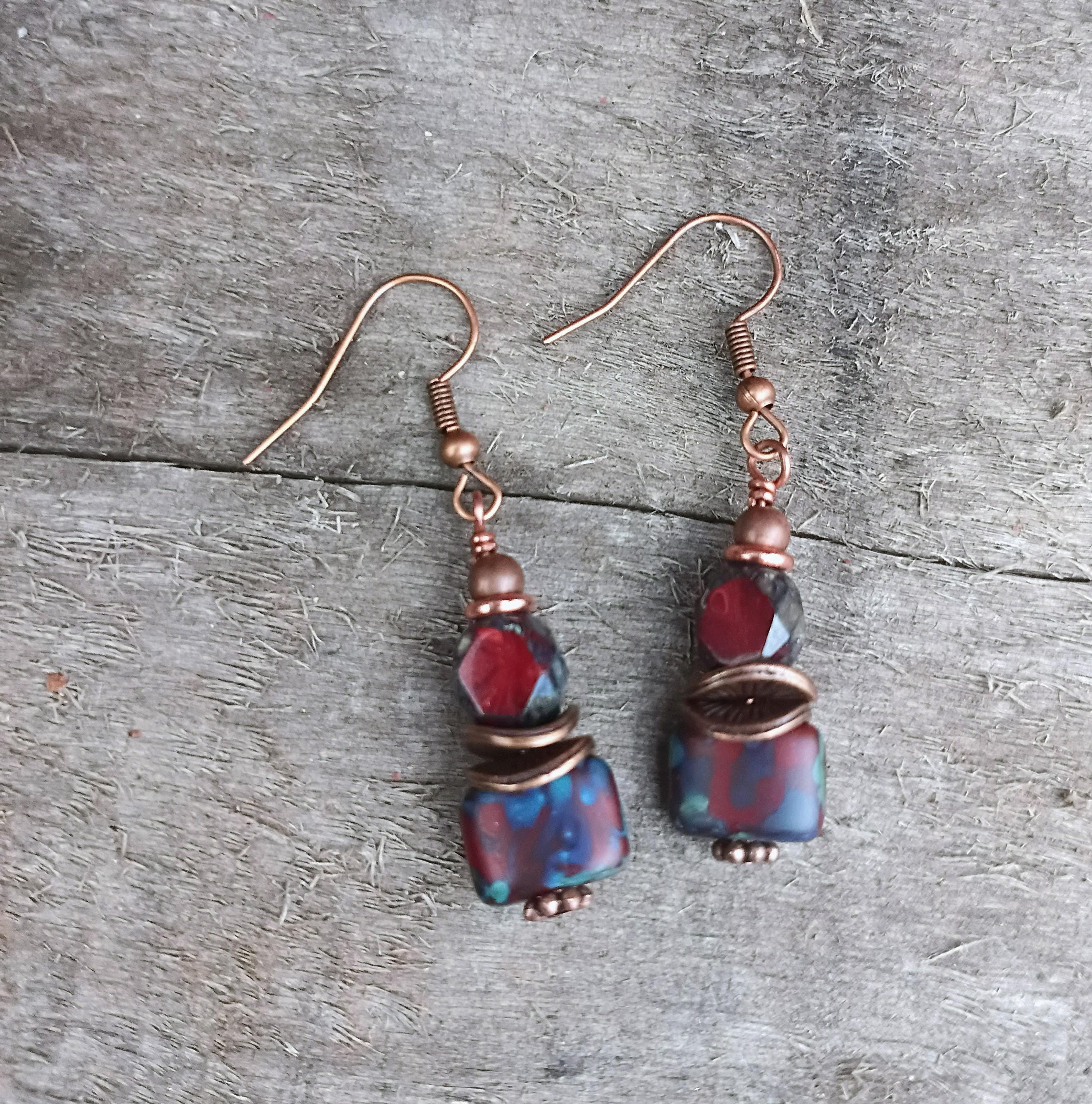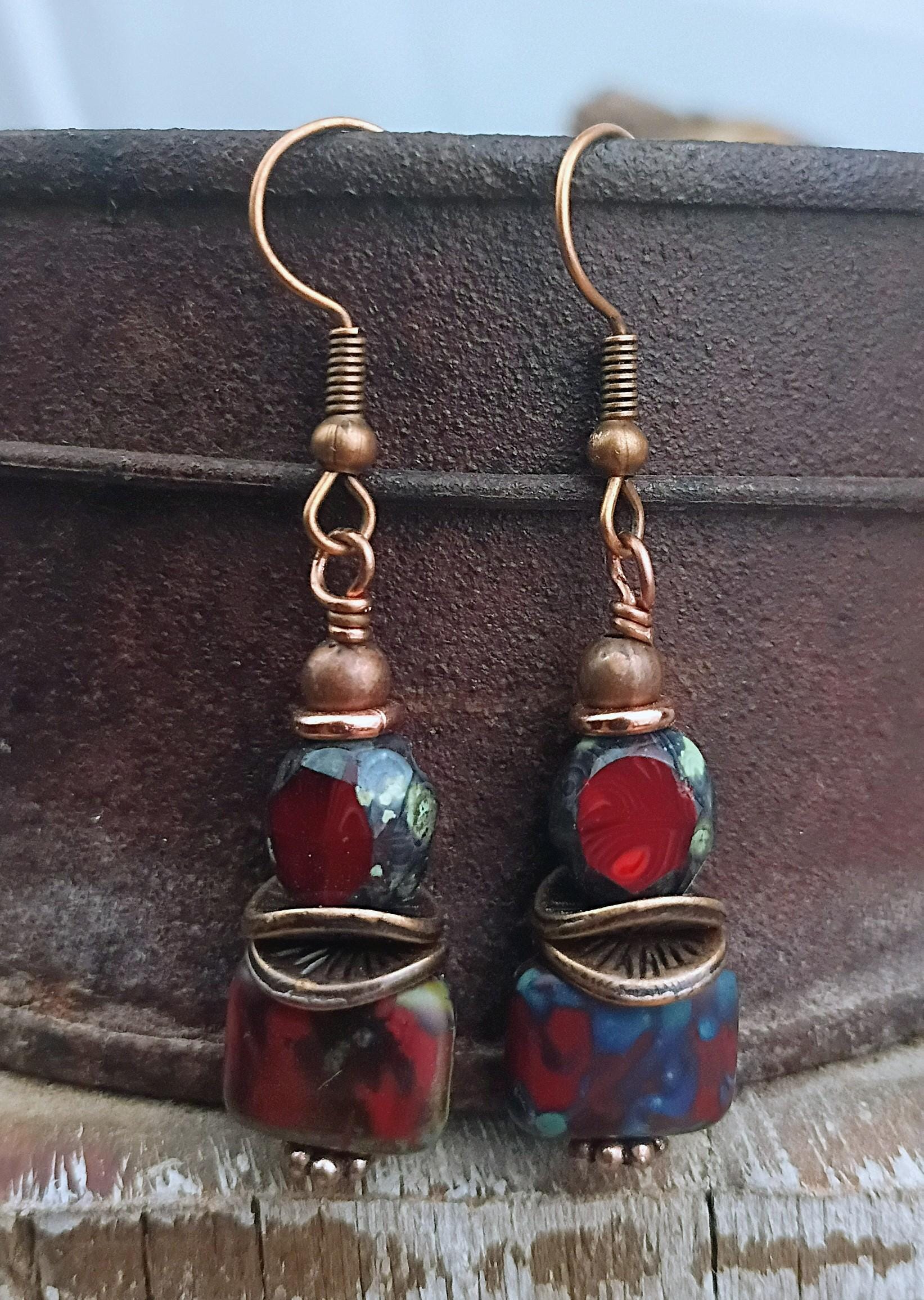 Earthy & Rustic these pretty Czech glass earrings are pretty, the red and copper just pop together! Beaded in copper wire with Hypoallergenic ear wires. Copper wavy metal spacers, copper spacers and ball beads. Czech Red slabs 8 mm, and rectangle Czech beads. they have an earthy Picasso finish. These earrings measure just shy of 2 inches long. Perfect earrings for year around, sure to compliment any outfit!