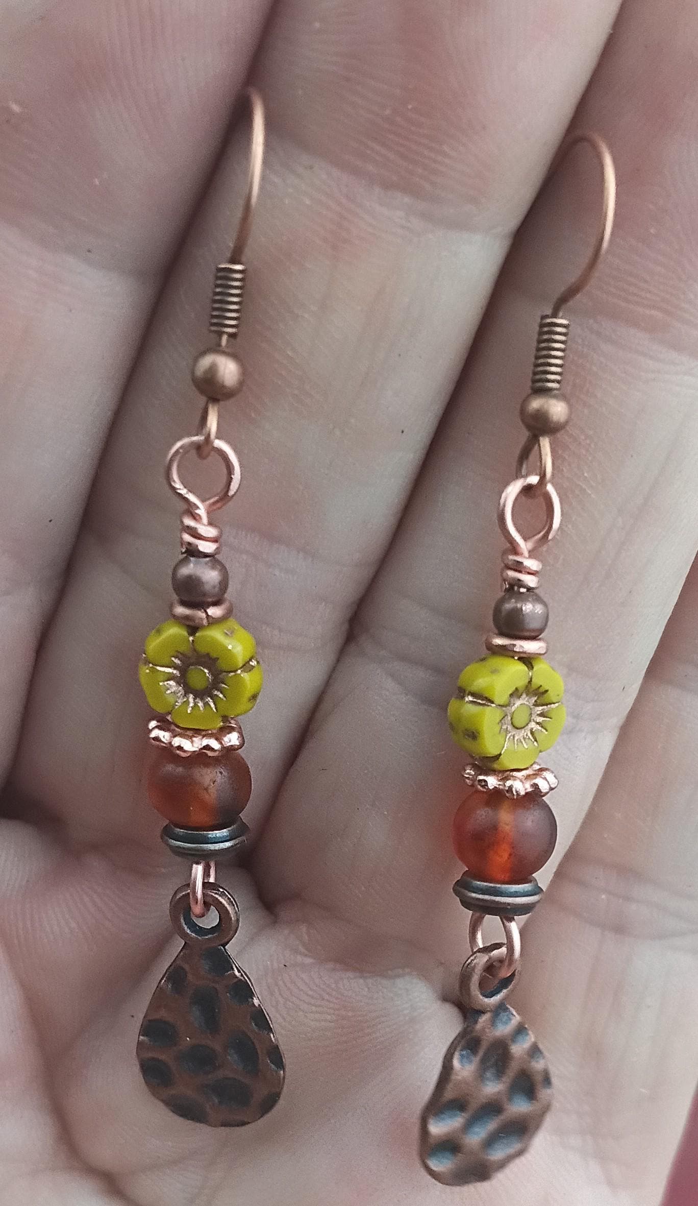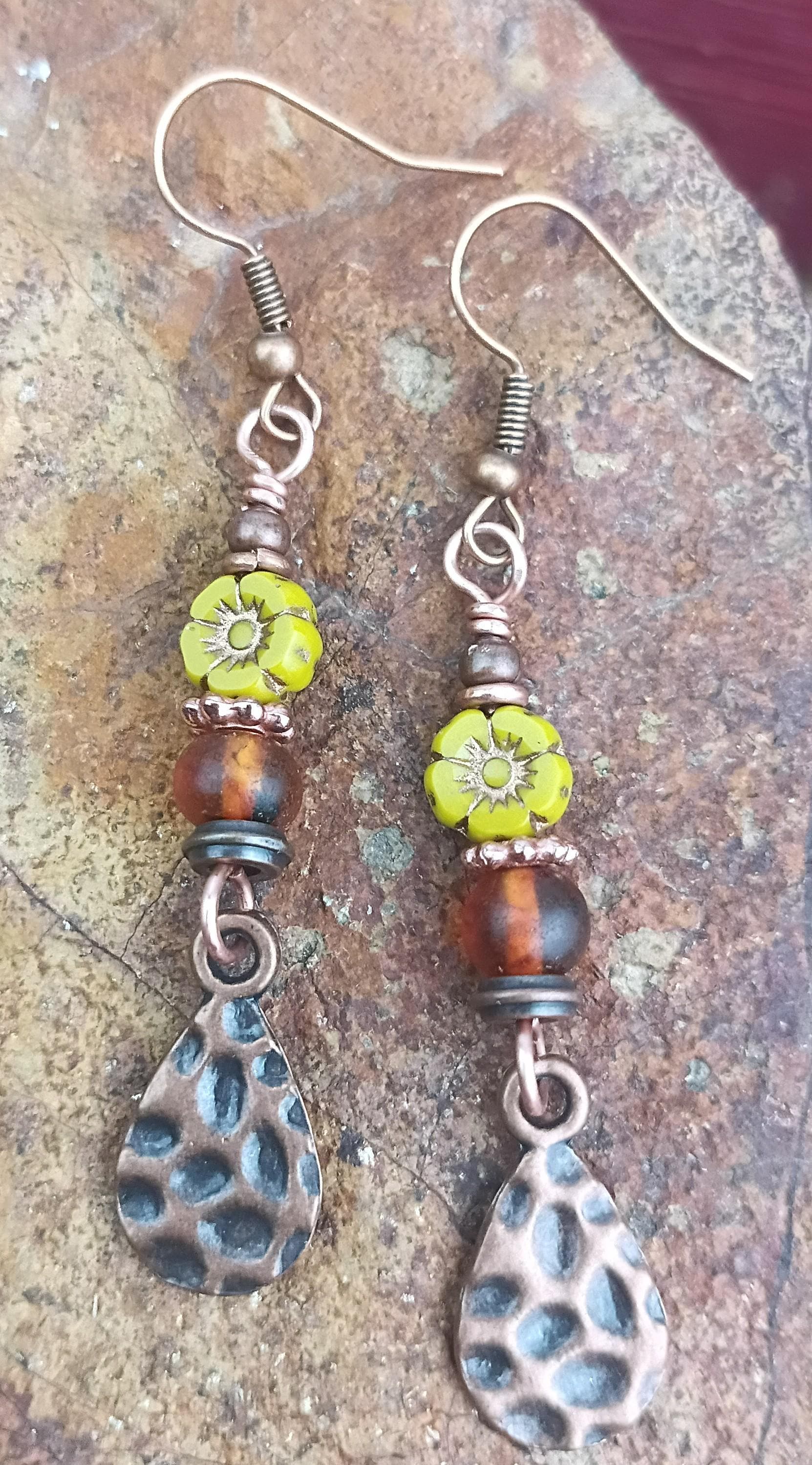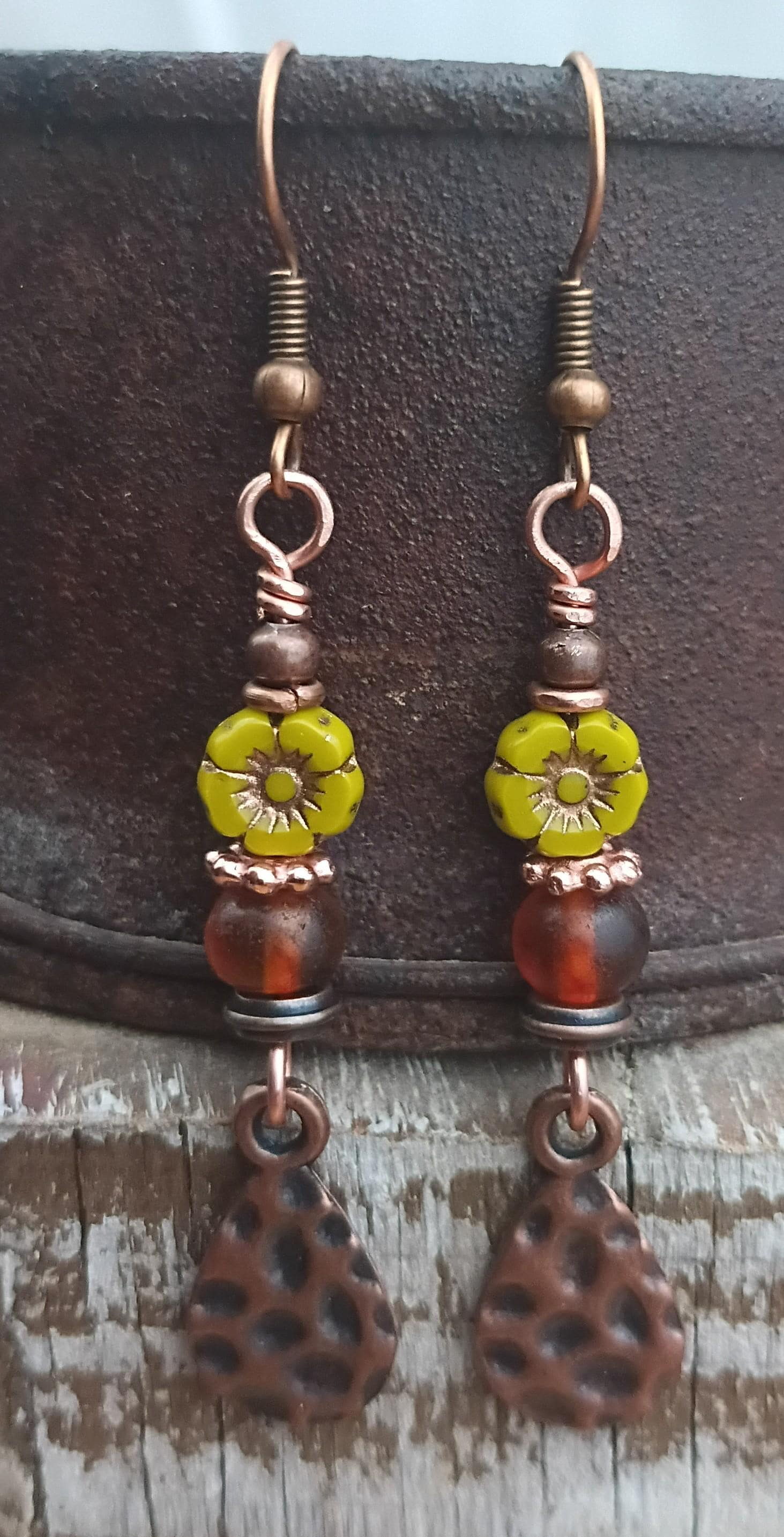 Beautiful and rustic Boho Dangle Earrings with Czech Hibiscus mustard color etched flower with Picasso finish, paired with Baltic Amber 6mm beads. Beaded on copper wire with Hypoallergenic ear wires, hammered metal copper teardrop dangle, copper metal spacers and beads. 2 1l2 inches long, these earrings are light and perfect for the summer!