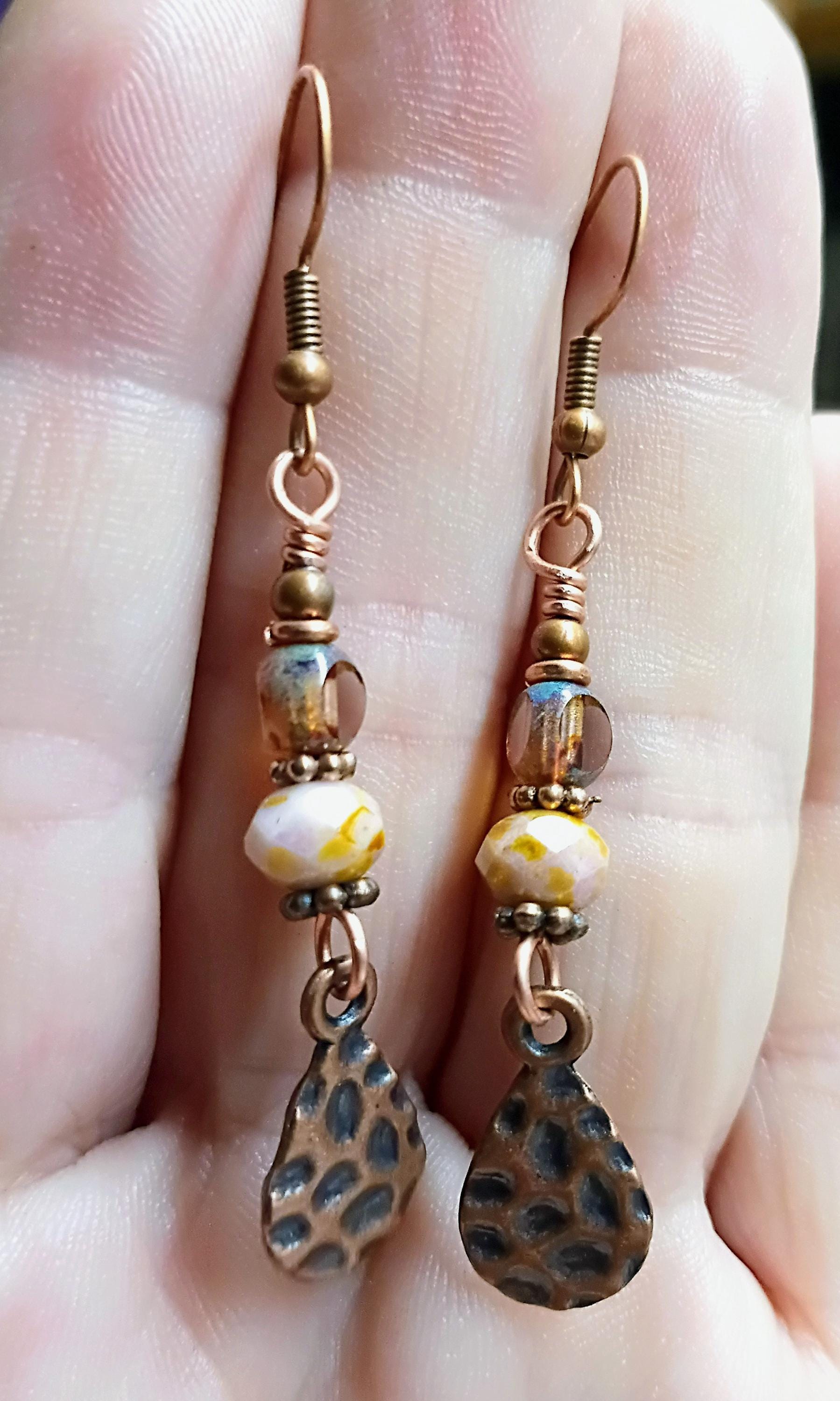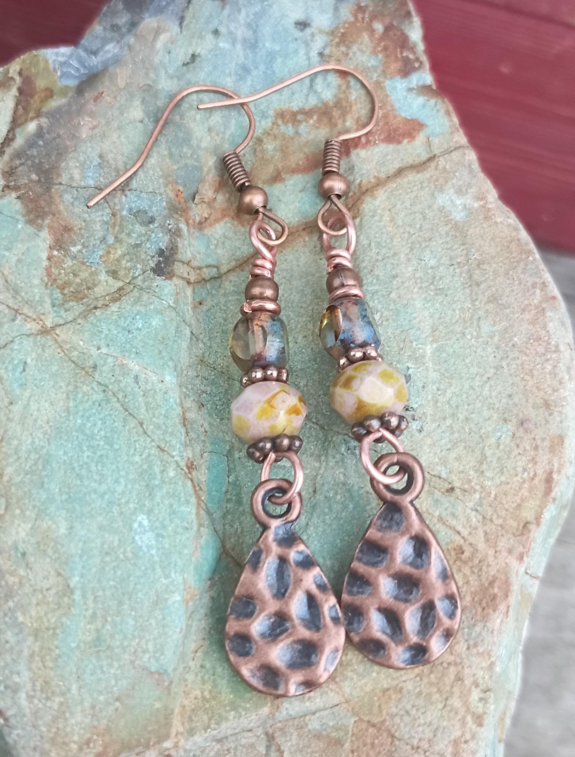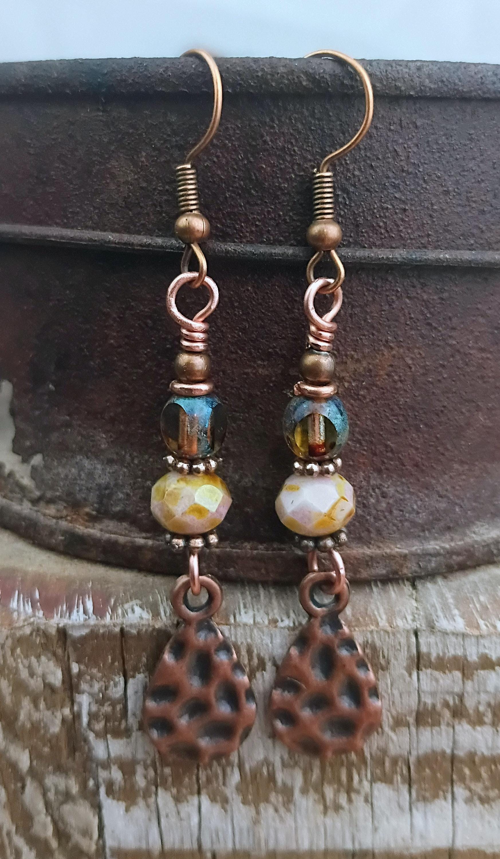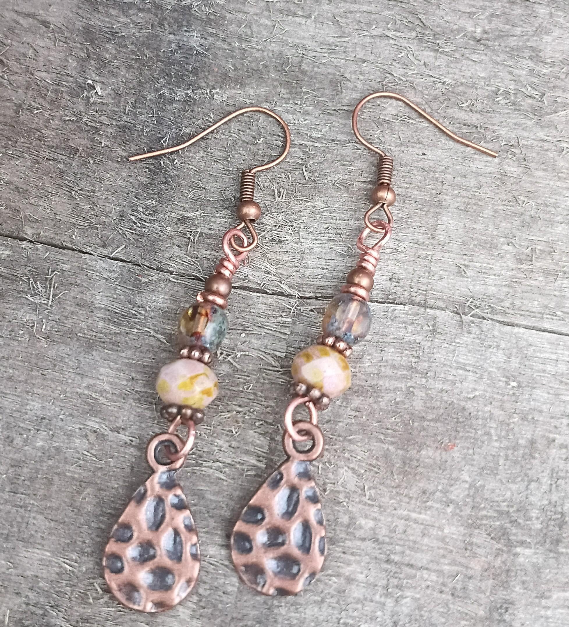 Beautiful, earthy and rustic, these earrings are sure to compliment any outfit, perfect for summer and light weight. Czech Glass Golden Rosie Tots with Picasso finish...very light pale pink in color paired with Czech tricut fire polished alexandrite Picasso finish beads. Beaded on copper wire with Hypoallergenic ear wires. Hammered Copper Teardrop dangle, copper beads and spacers. Just over 2 inches long. They have almost a vintage look to them, very pretty earrings!