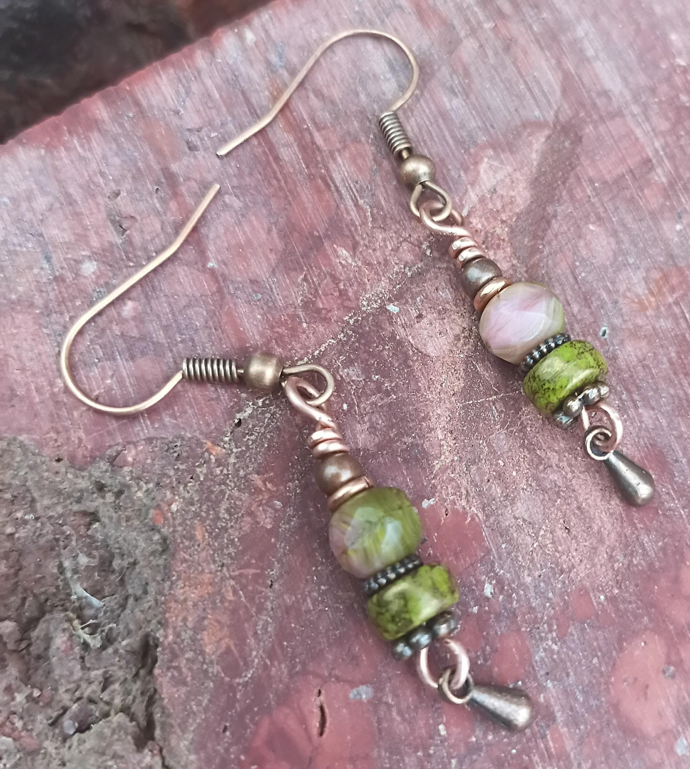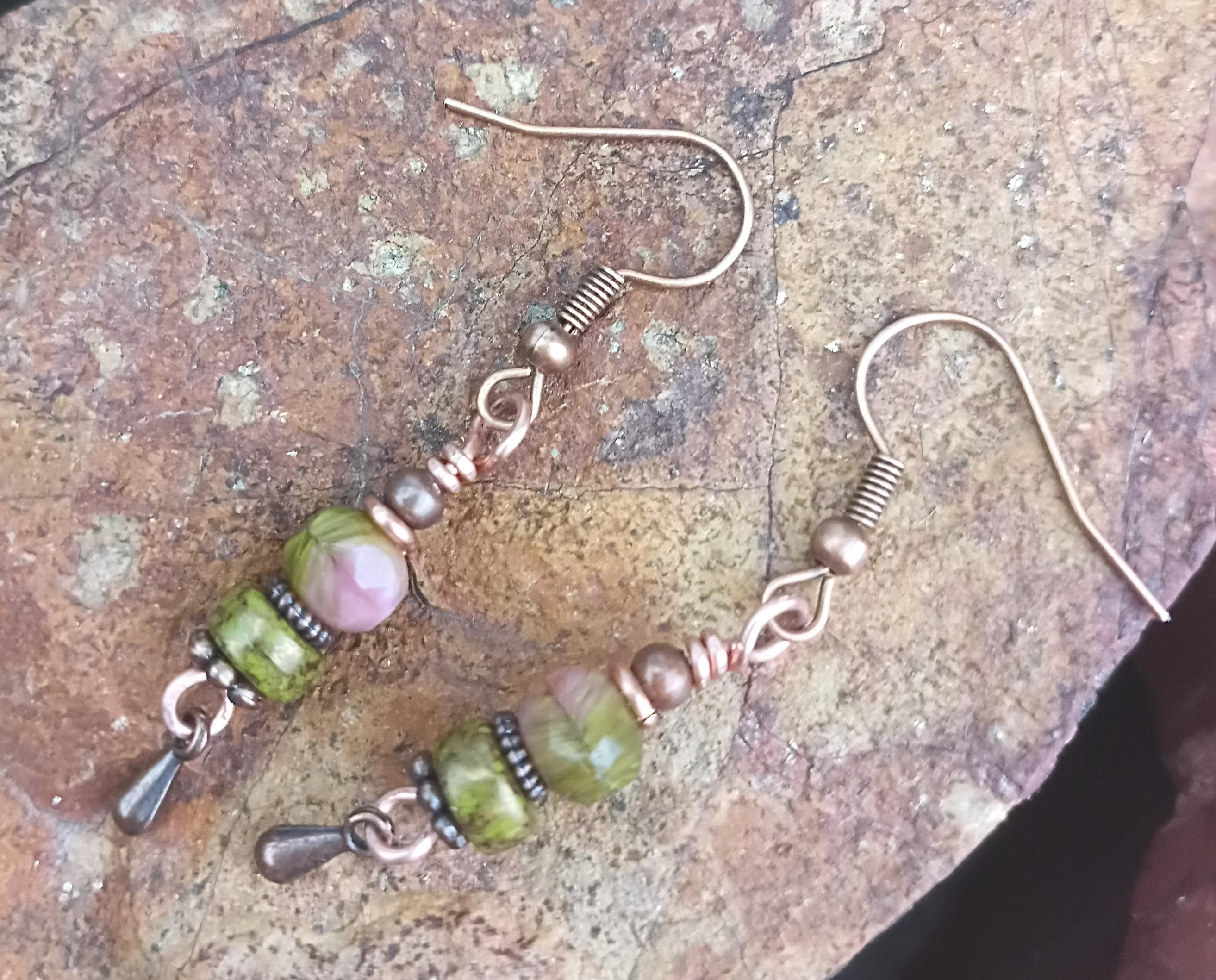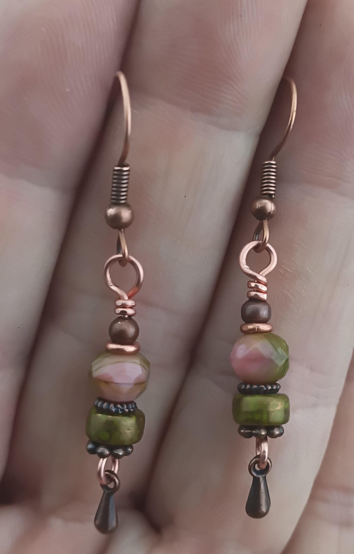 Beautiful 2 tone Czech glass dangle earrings, perfect for the summer or year around! Light weight and pretty! Pink Lichen Czech glass faceted beads - 5mm x 7mm size are 2 tone pink with an olive green like color, paired with Czech glass Heishi beads with a gold tone Picasso finish. Beaded on copper wire with Hypoallergenic ear wires, copper spacers and tiny copper teardrop dangle. These earrings measure just over 1 and a half inches long. Sure to compliment any outfit!