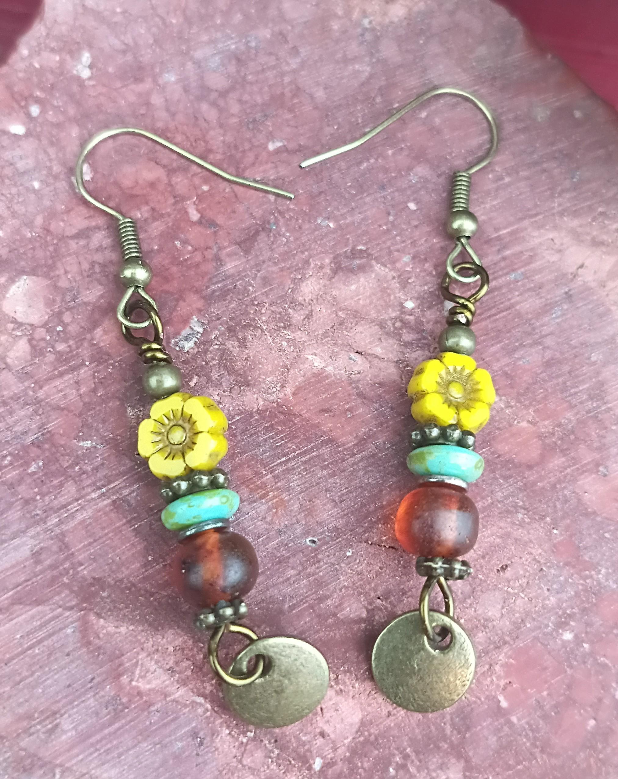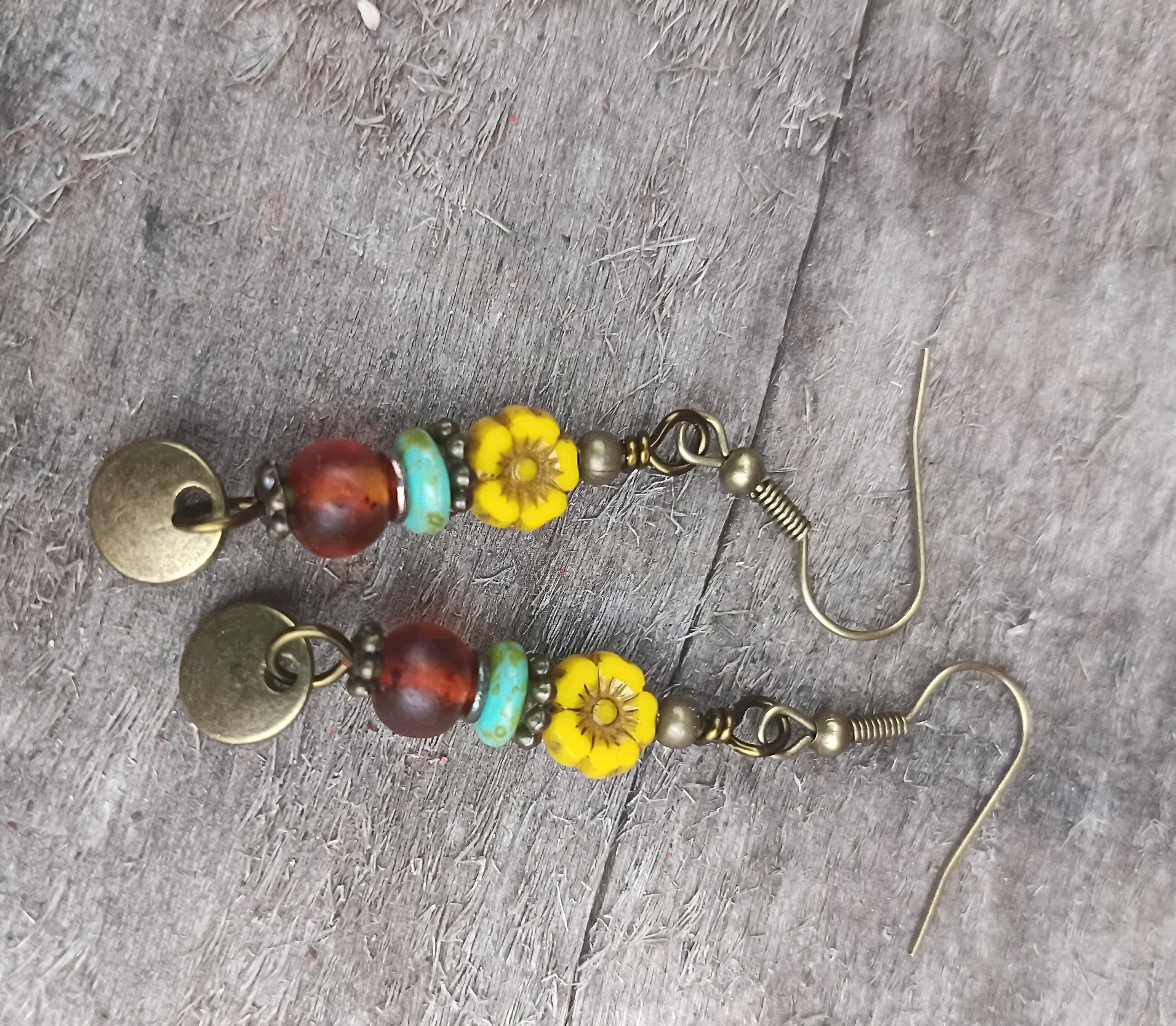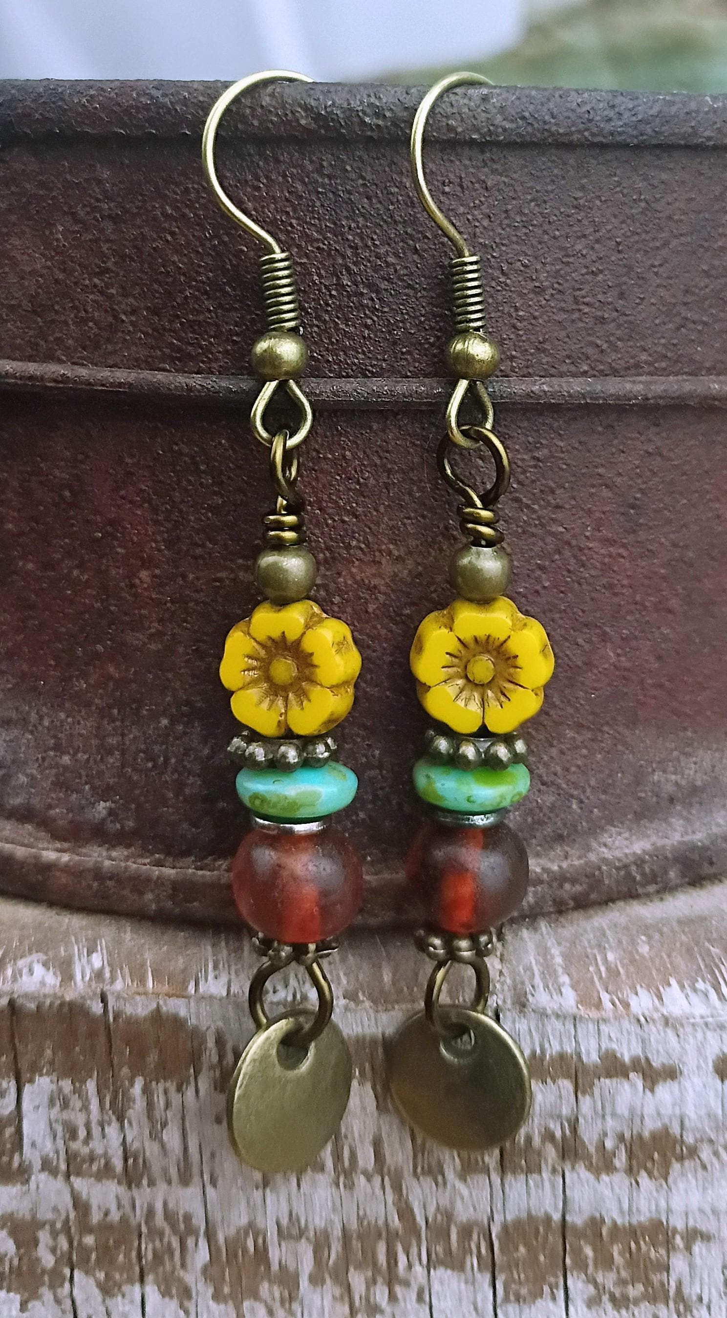 Earthy, Rustic and colorful Bohemian Czech Glass Dangle Earrings, perfect summer earrings and sure to compliment any outfit!