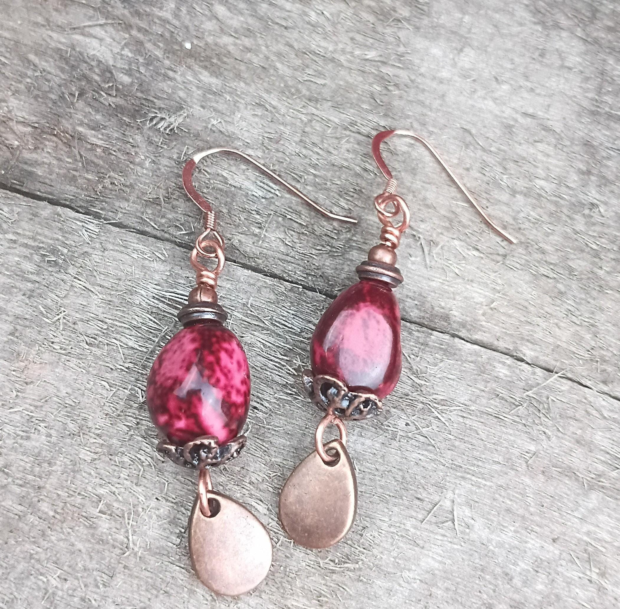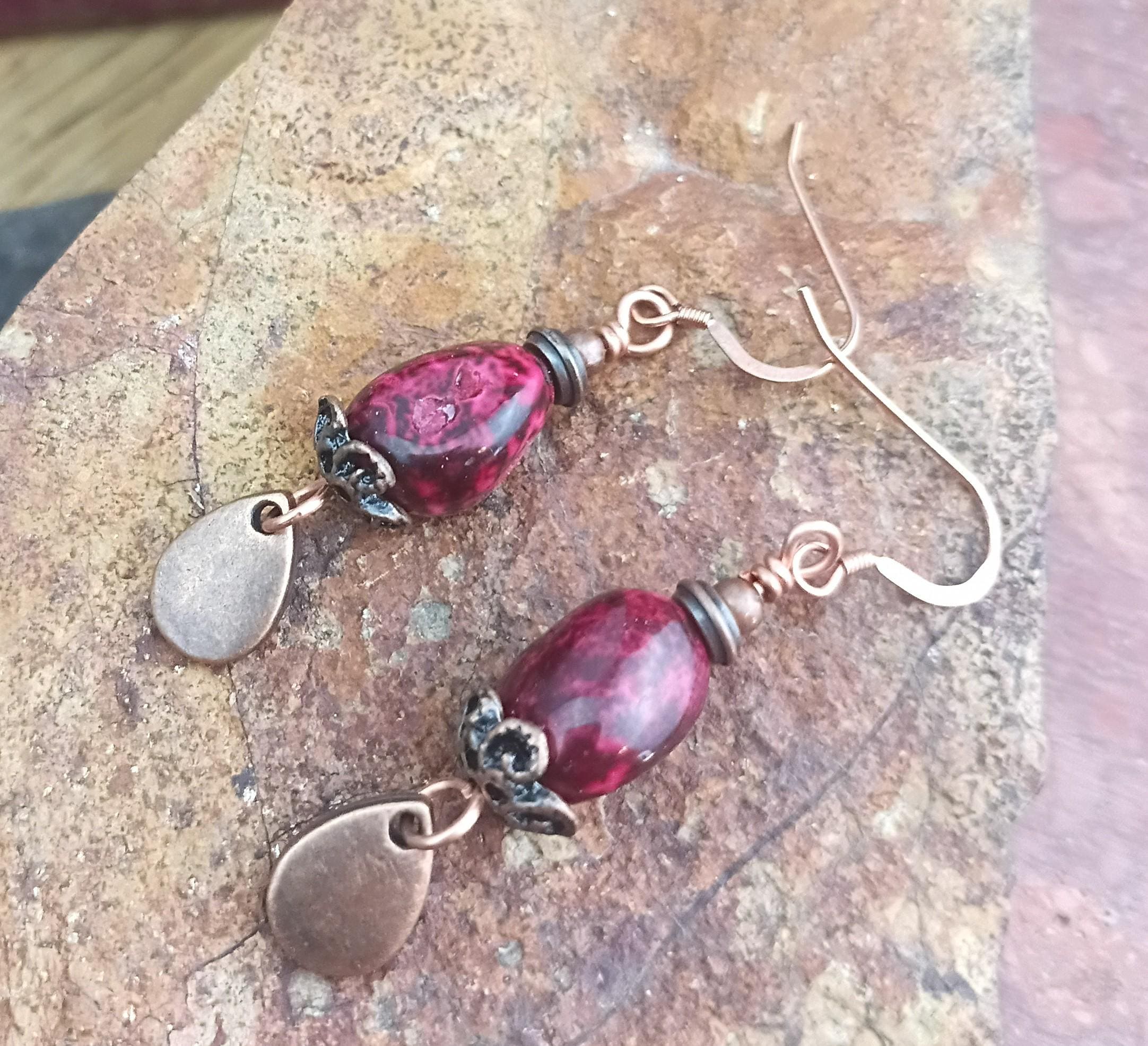Beautiful and vibrant dangel earrings! Dahlia Rose Nugget beads are cut from a material that is similar to white buffalo and has been dyed. The beads are a very pretty red, maroon color, irregular shape. Beaded on copper wire with copper ear wires. Copper metal spacers along with copper metal teardrop dangle and antique copper bead caps. They are approx 2 inches long. These are very pretty beads! Great statement earrings!