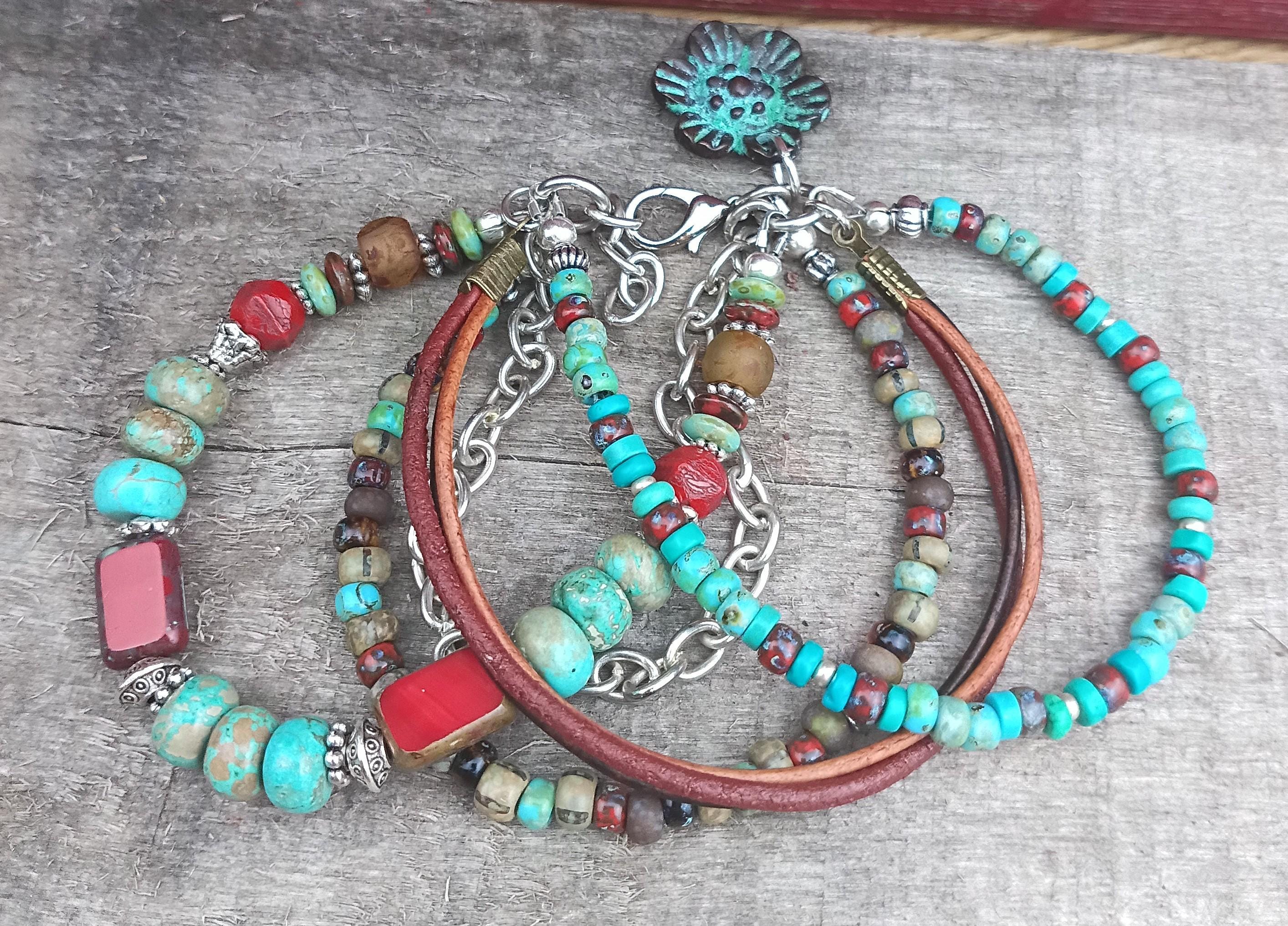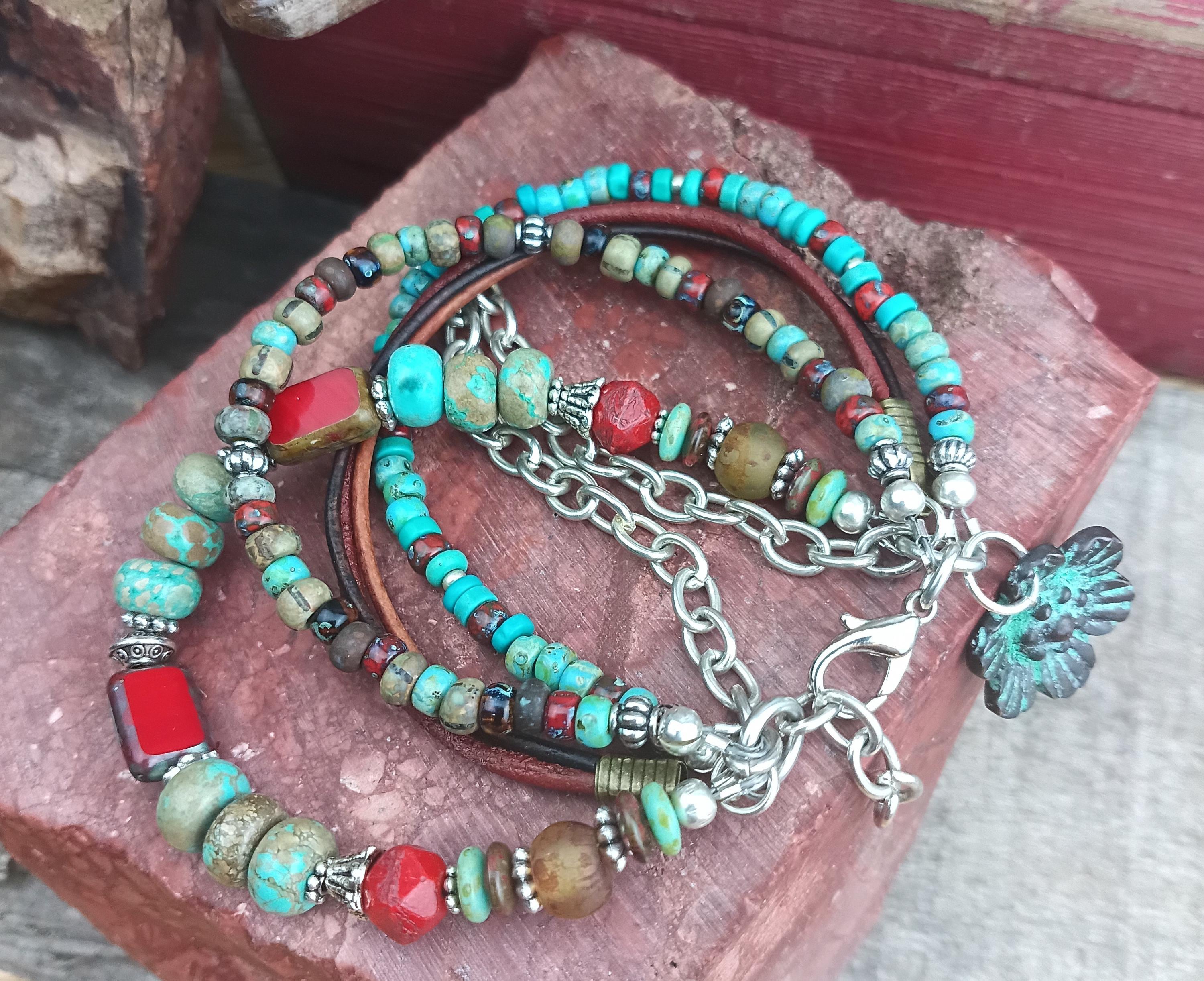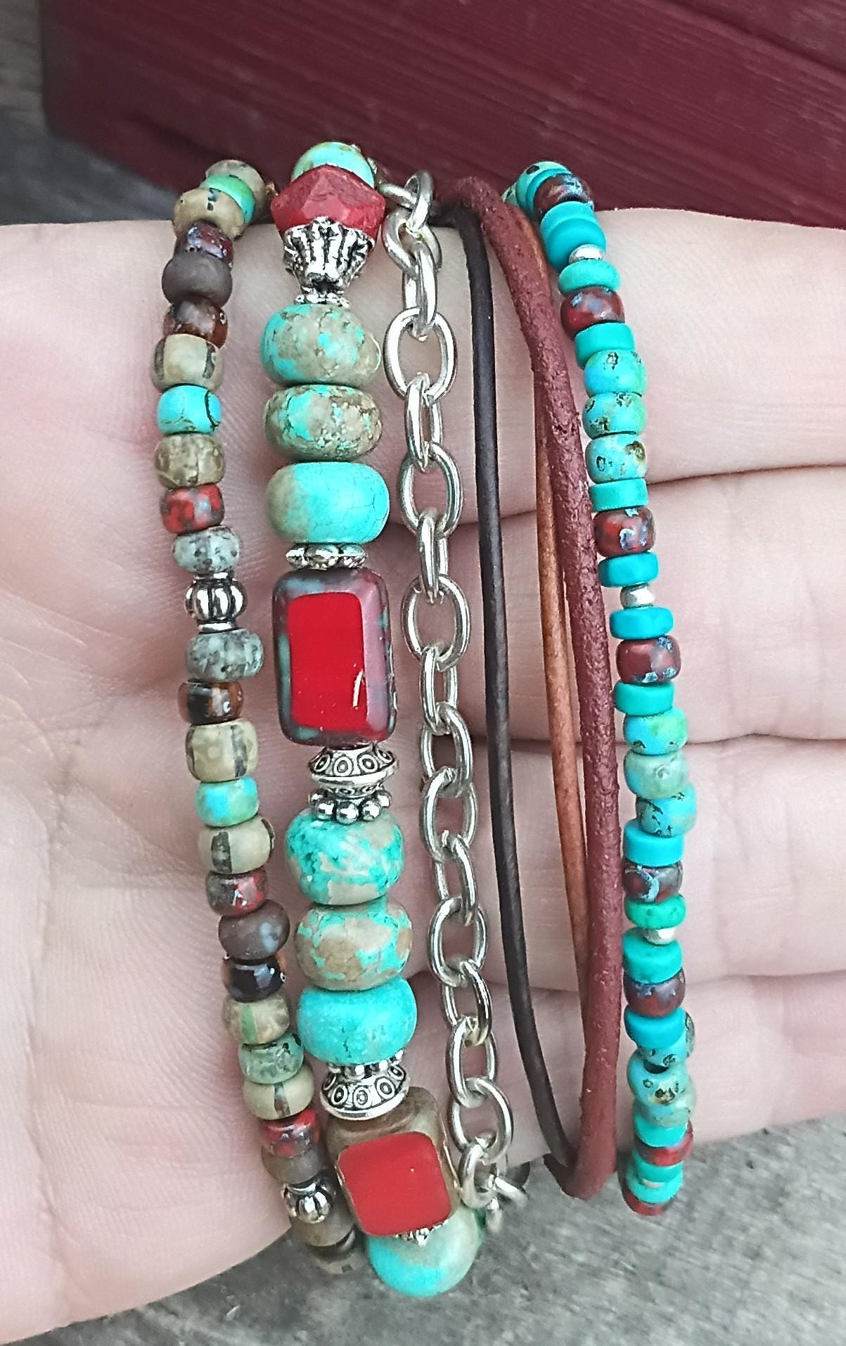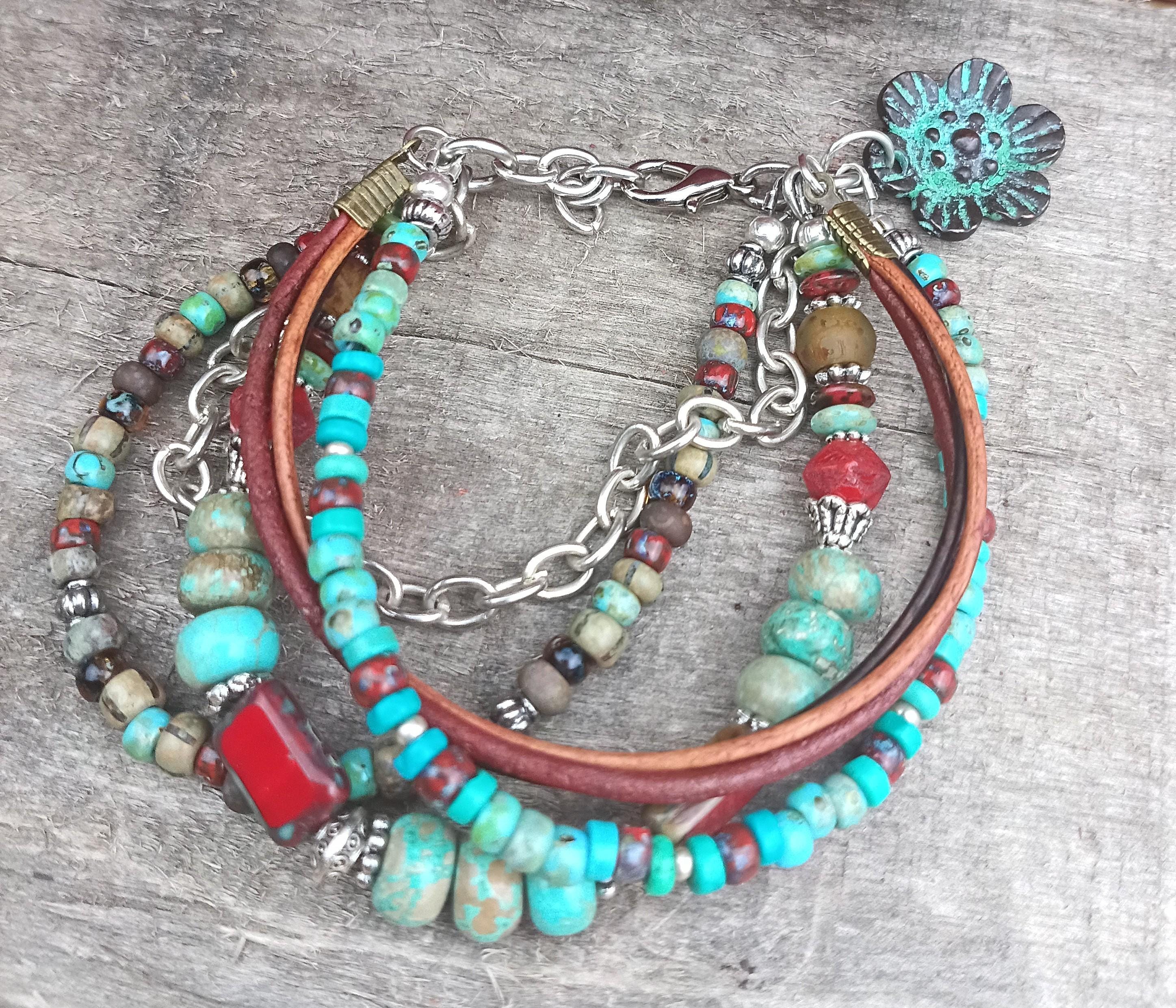 Beautiful boho style multi strand bracelet with silver tone chain , leather, Boulder Creek Turquoise and Czech Glass beads. 5 total stands Czech glass variety with Picasso finish, ranging in shapes, sizes and colors. Earth tone browns and reds. Picasso seed beads and spacers. Silver plated metal spacers, silver tone lobster claw with silver tone extension chain. Adjustable to fit size 7 to 8 inch wrist. Patina metal flower charm dangle. A beautiful mix of red with turquoise blue's, perfect summer bracelet or year around!