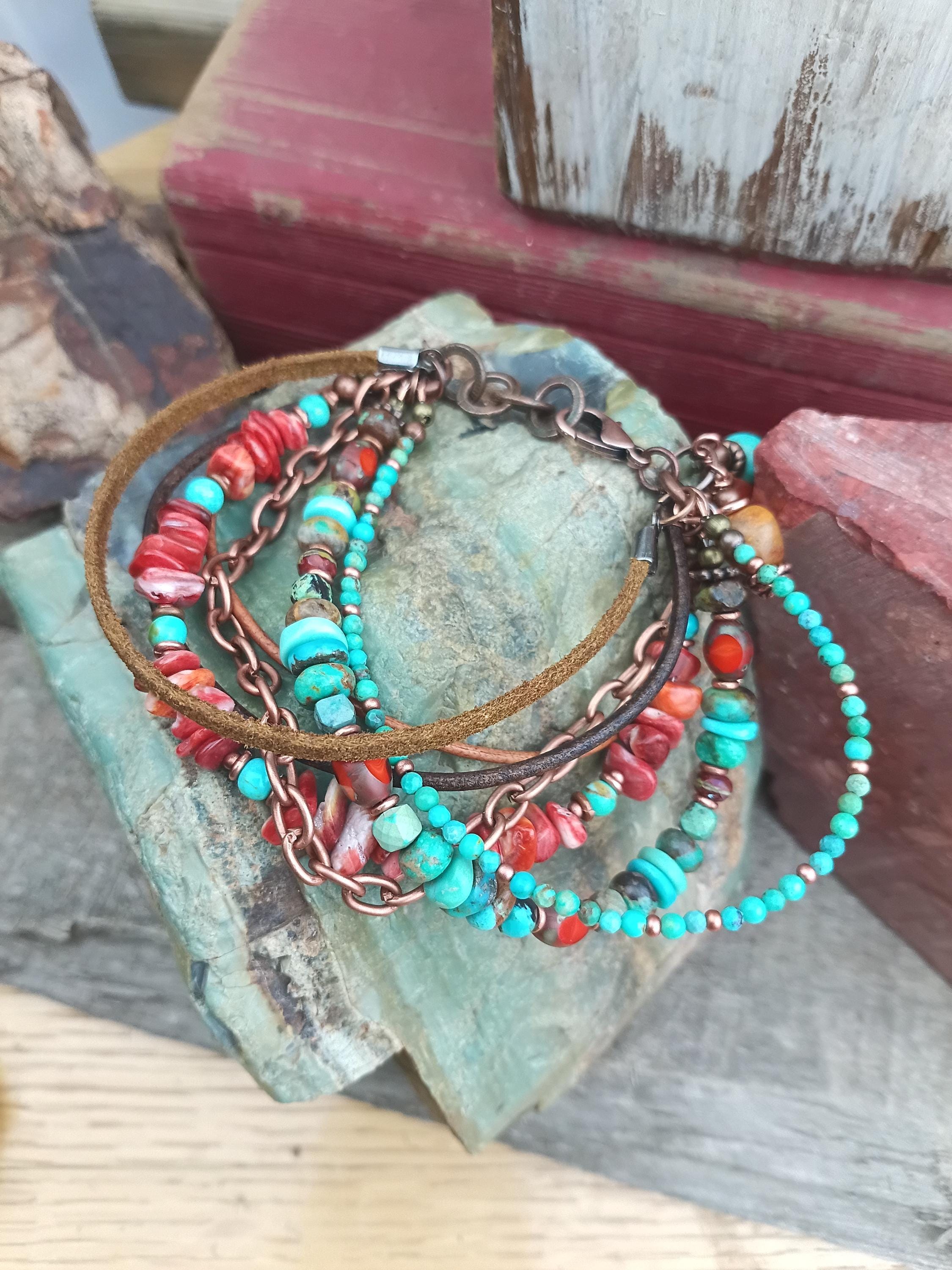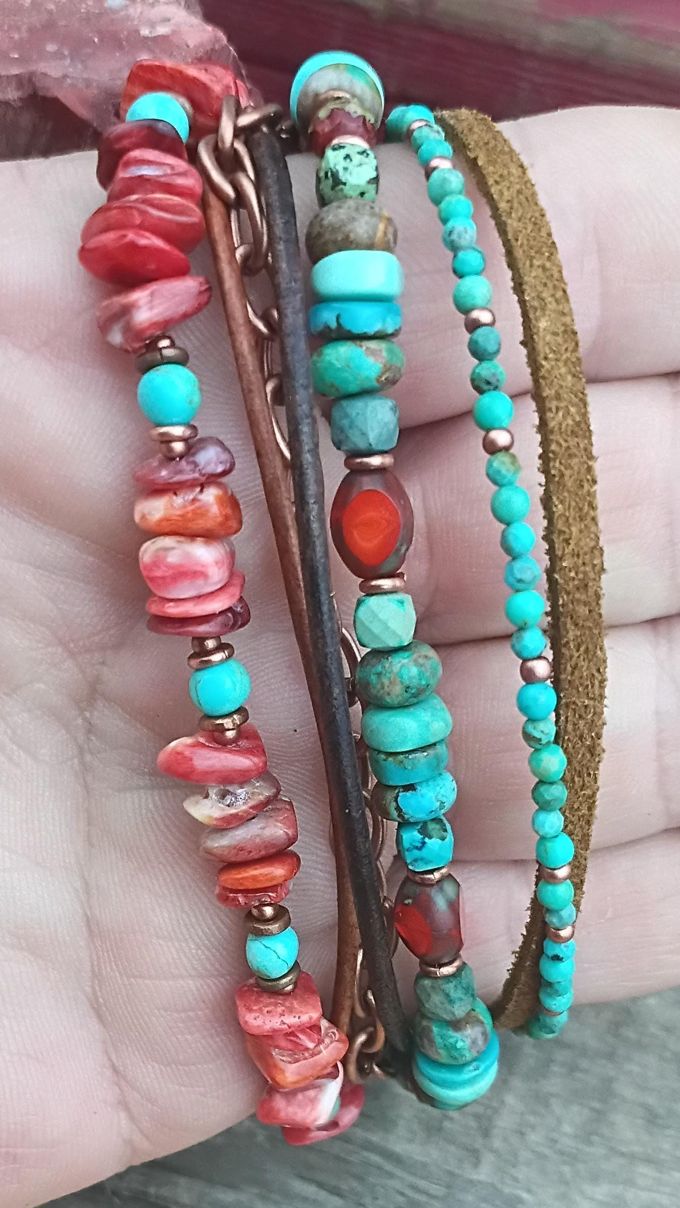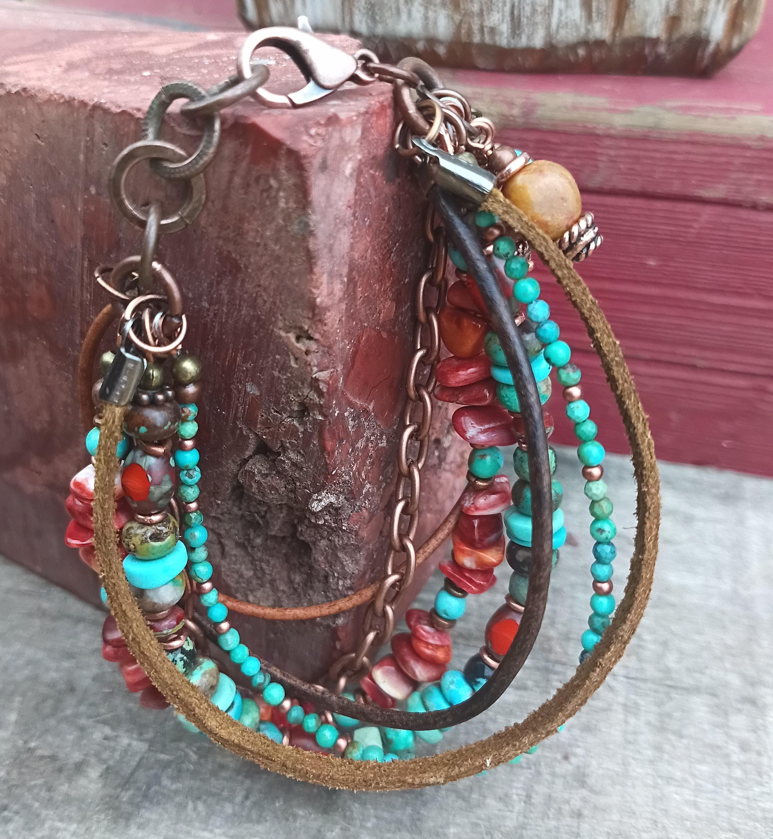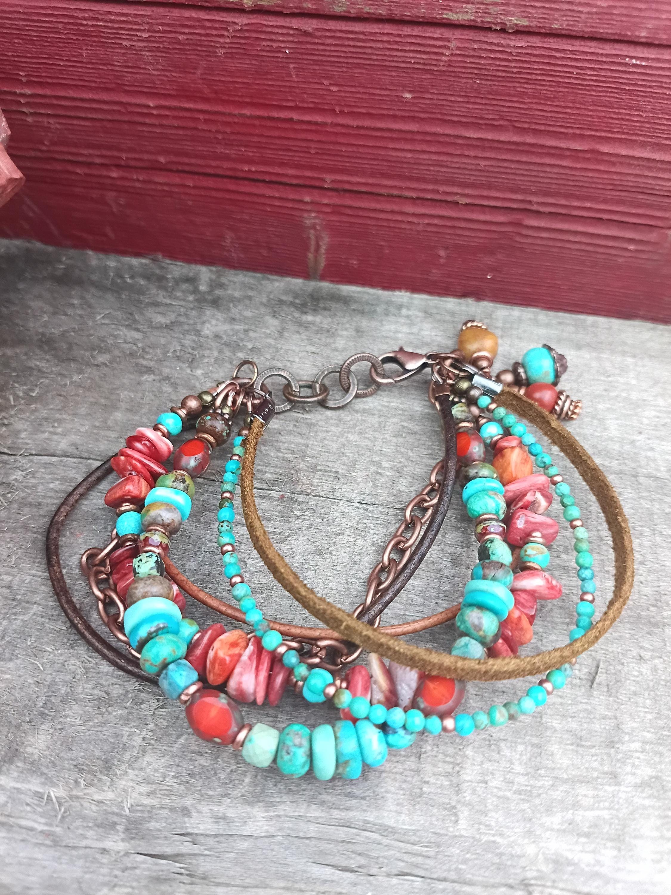 Gorgeous multi strand bracelet with Kingman Turquoise and Spiny Oyster. 7; total stands, adjustable with lobster claw close. Copper meter spacers and chain. 3 leather strands on open jump rings. Turquoise, spiny oyster and Czech glass are beaded on stainless steel beading wire with wire guards for added protection.