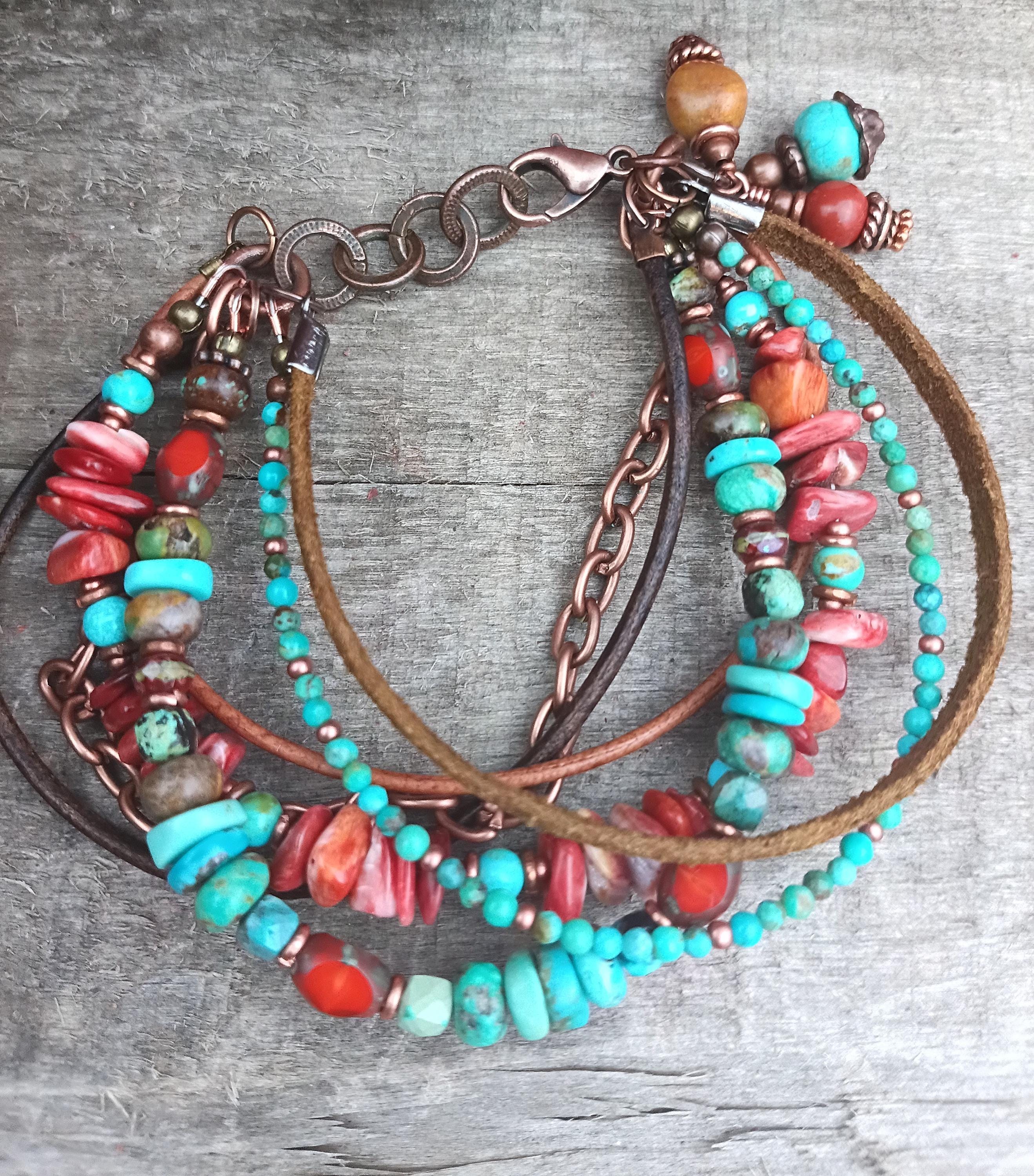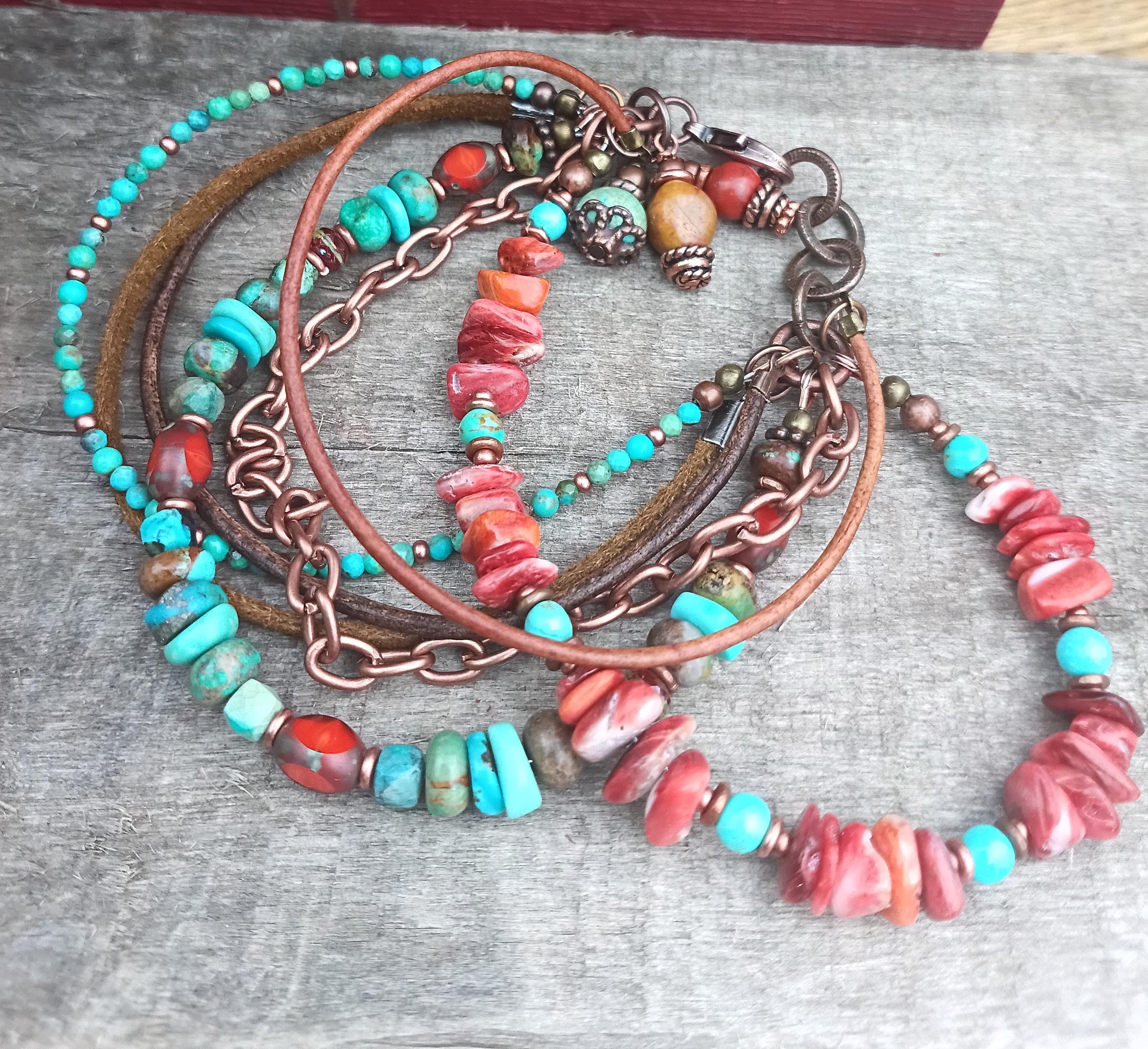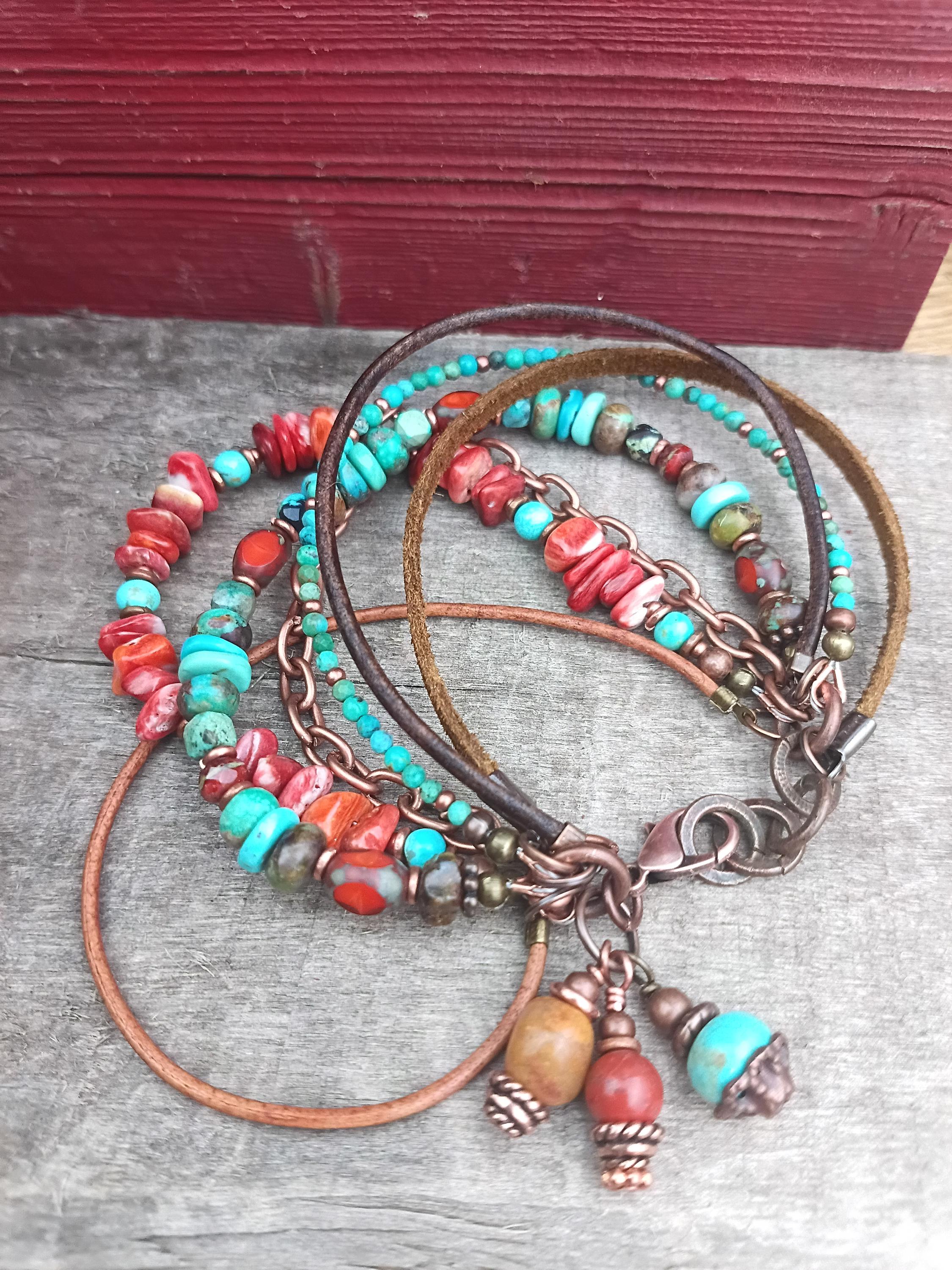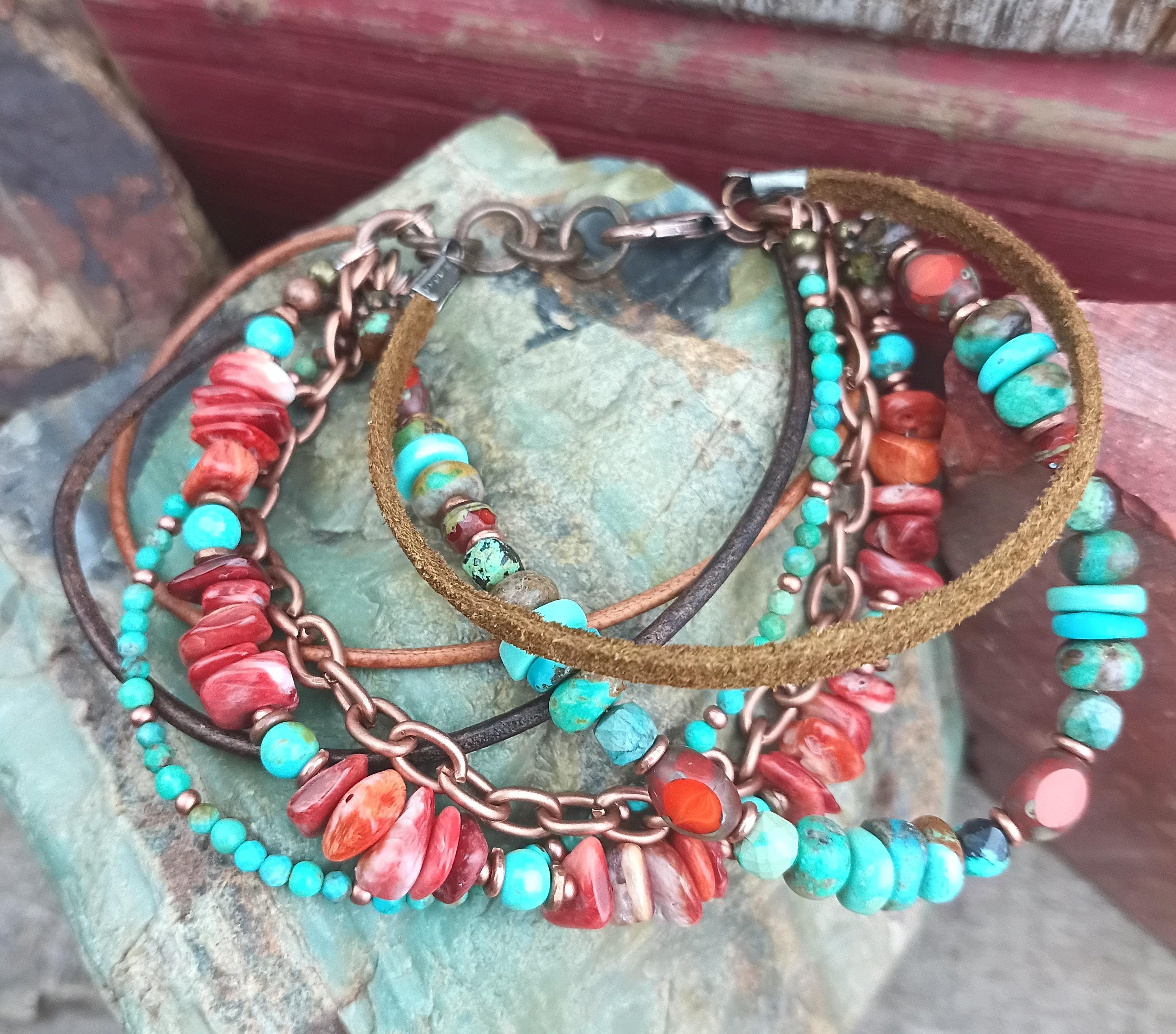 Gorgeous multi strand bracelet with Kingman Turquoise and Spiny Oyster. 7; total stands, adjustable with lobster claw close. Copper meter spacers and chain. 3 leather strands on open jump rings. Turquoise, spiny oyster and Czech glass are beaded on stainless steel beading wire with wire guards for added protection.